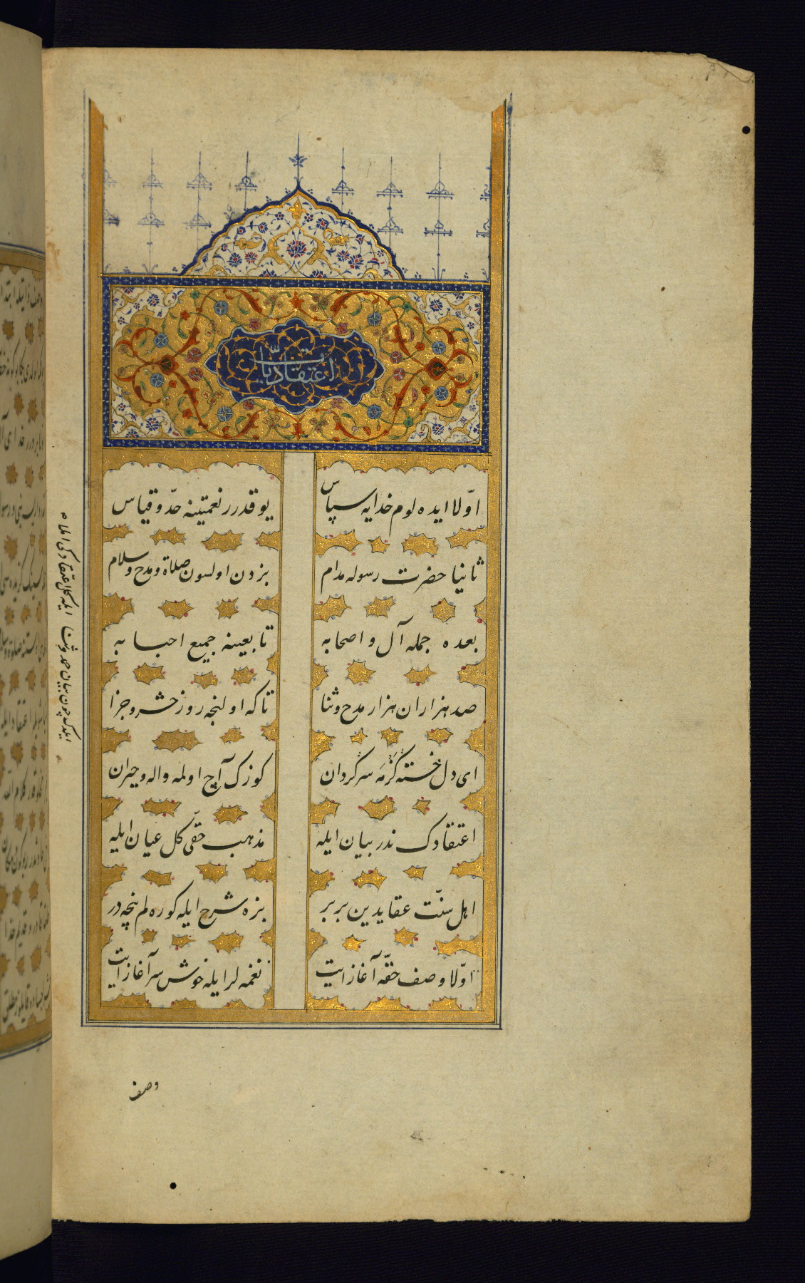 - Label: This incipit page with illuminated titlepiece is inscribed Iʿtiḳādiyāt in white ink on a blue background with gold arabesques surrounded by polychrome design. Illumination is present between the lines of text.