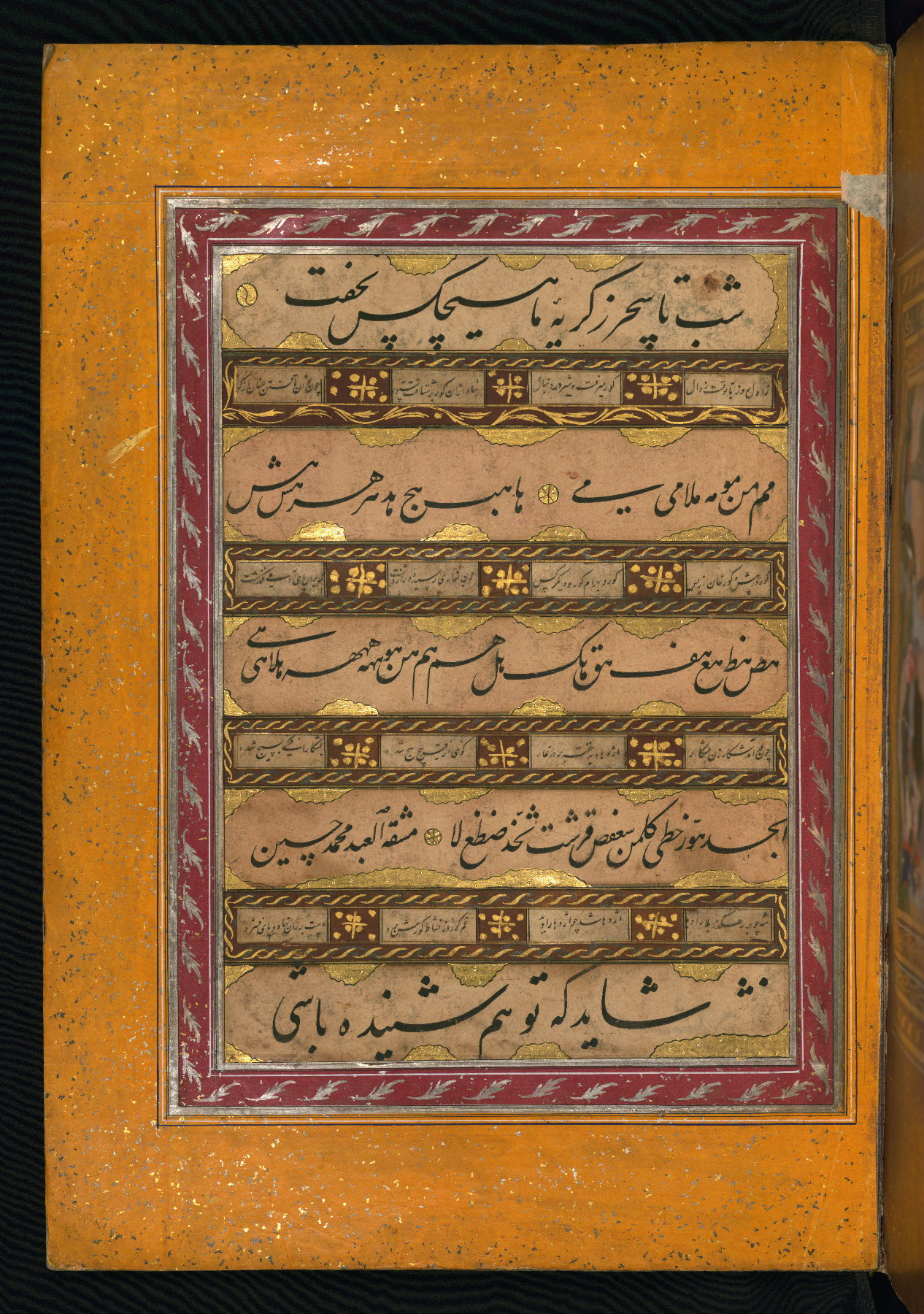 - Label: This calligraphy page is written in nastaʿlīq script and signed by Muḥammad Ḥusayn, whose name appears in the fourth register from the top.