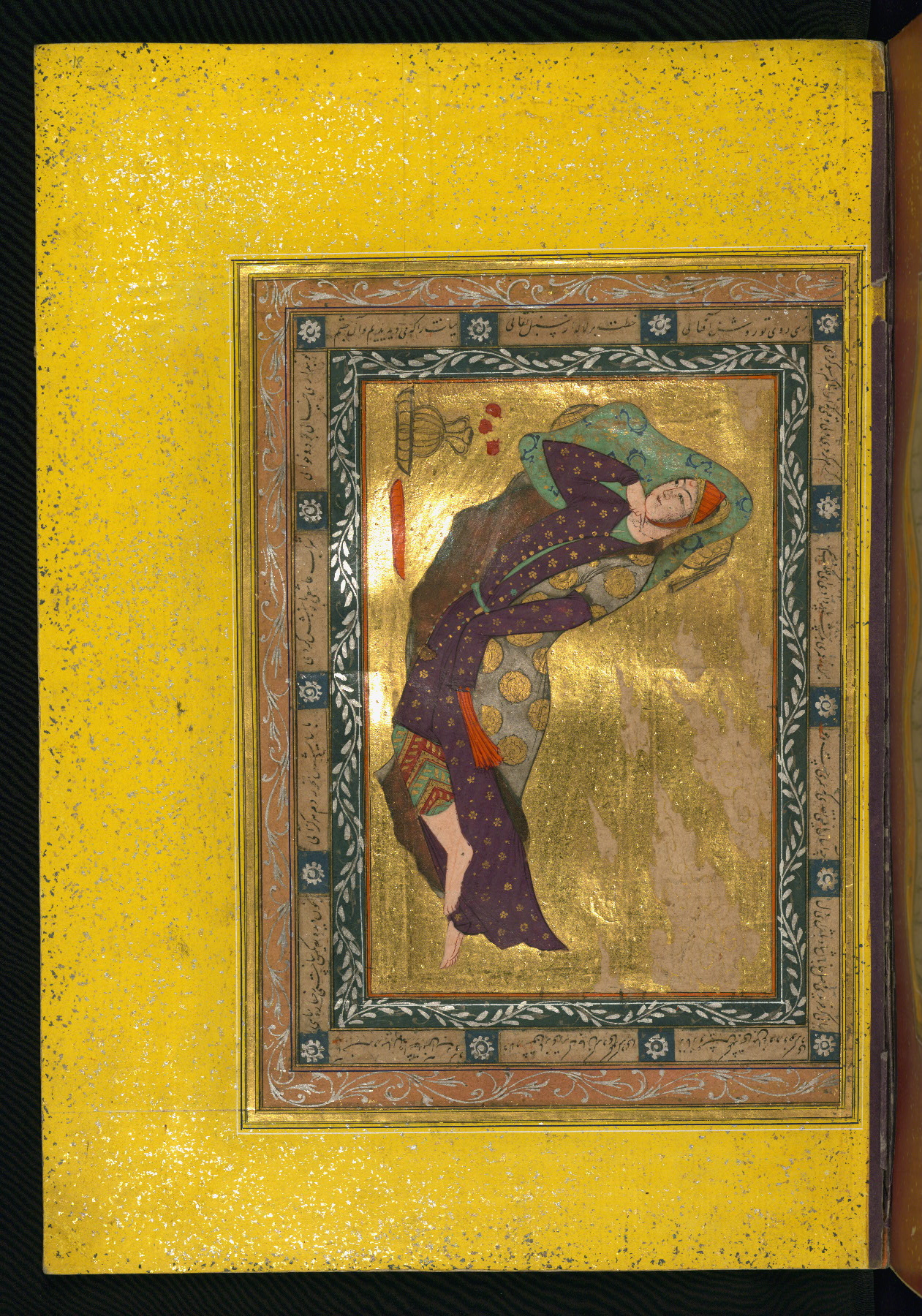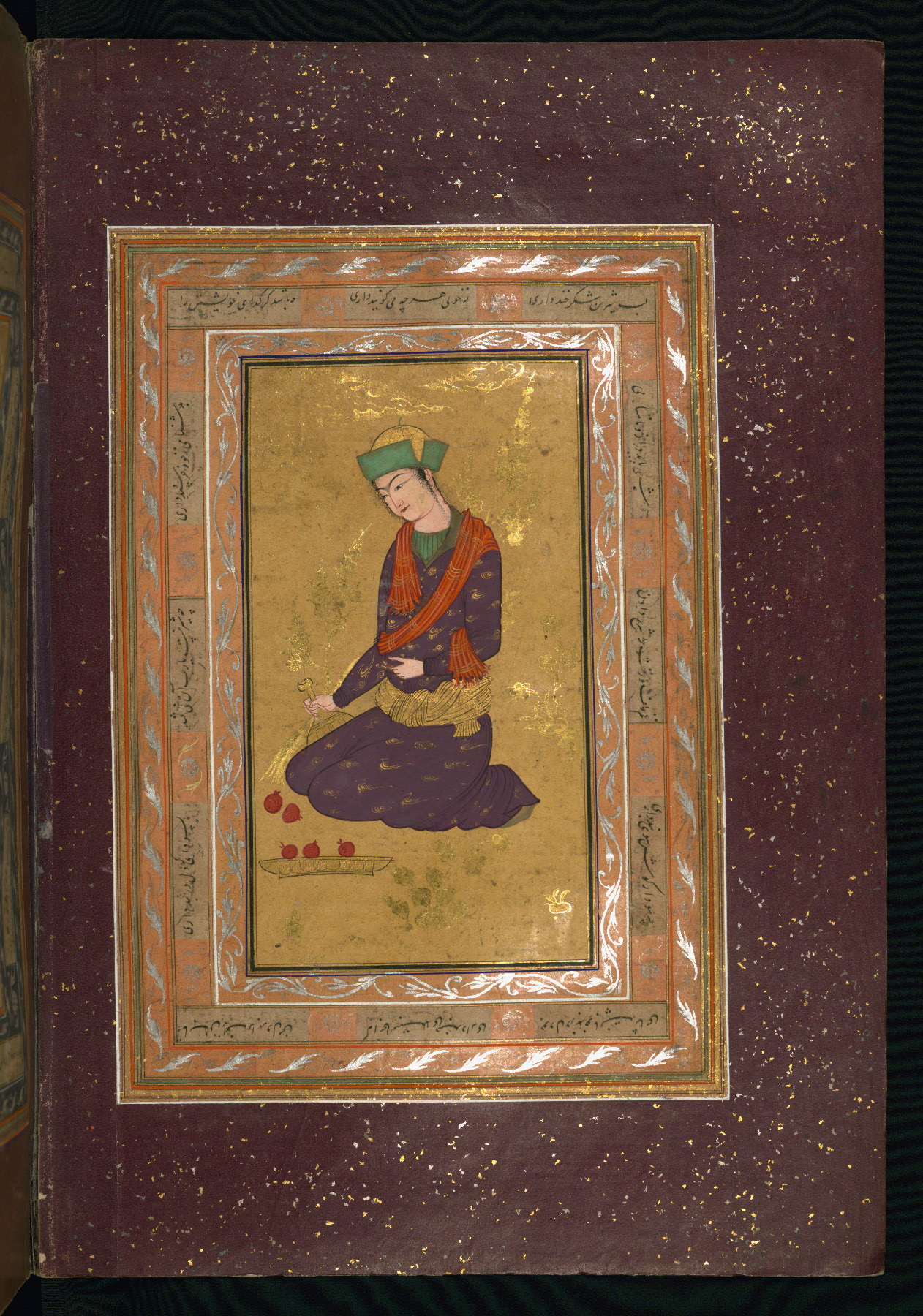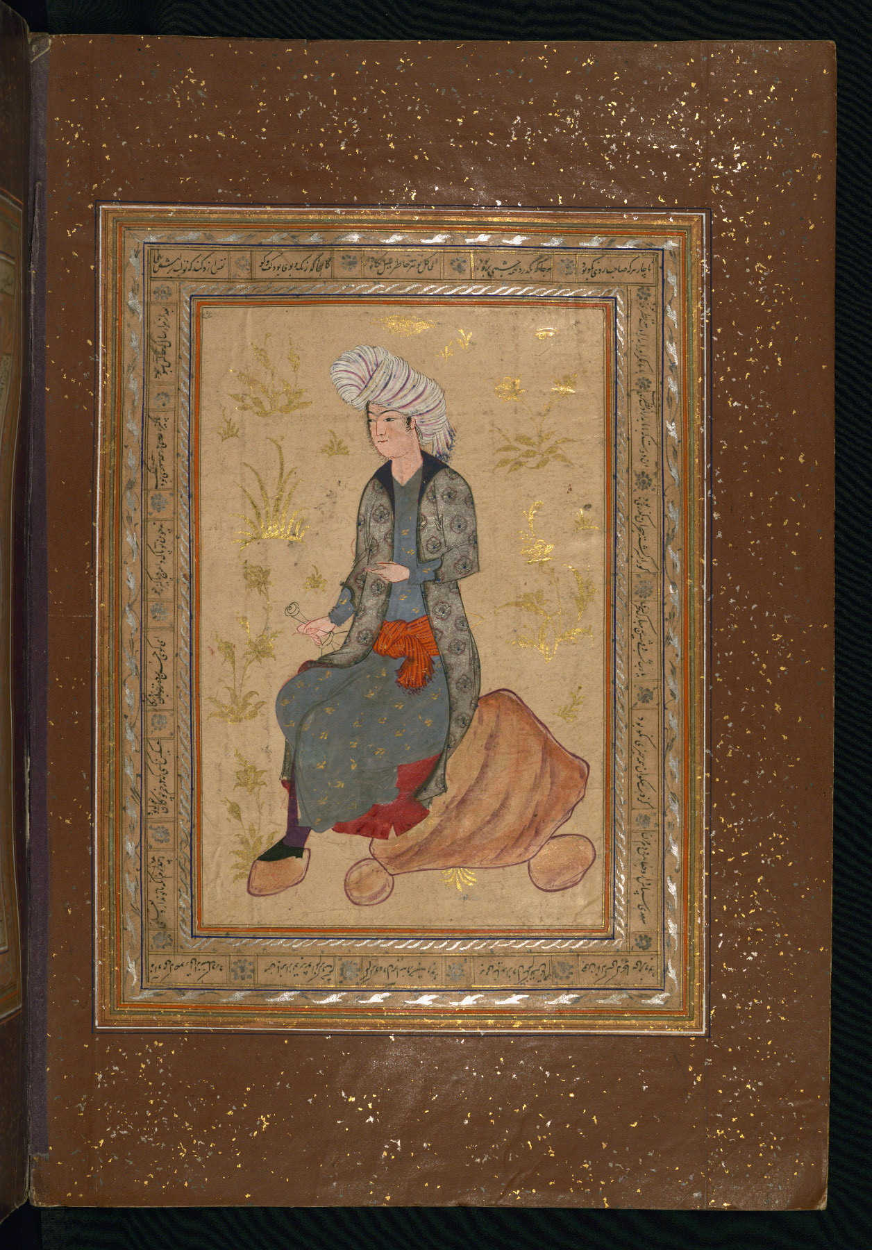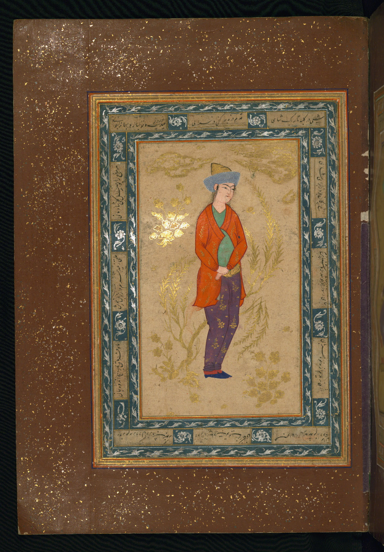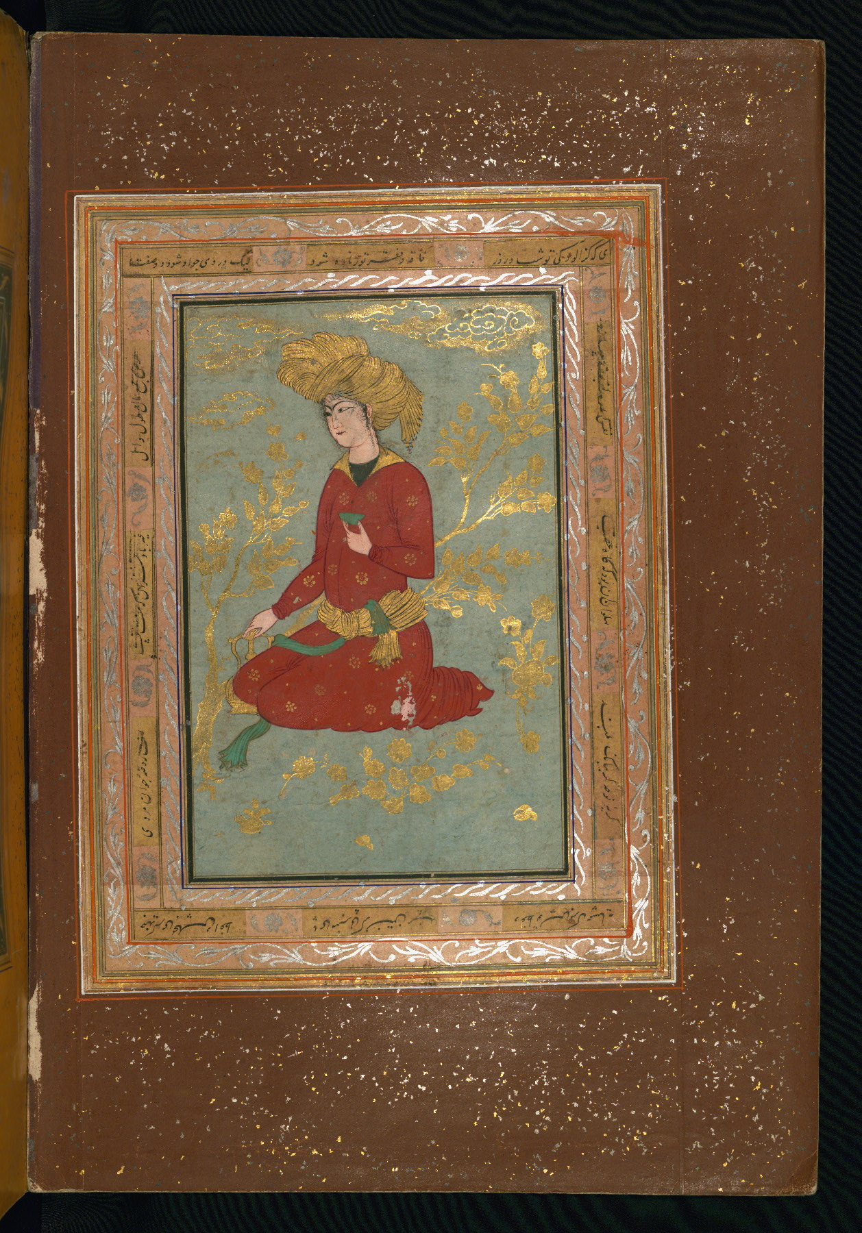 This album of painting and calligraphy was compiled in the late thirteenth century AH / nineteenth CE or early fourteenth century AH / twentieth CE, most likely in Turkey. The signed pieces of calligraphy represent nine different Persian calligraphers, including Sulṭān ʿAlī al-Mashhadī, Sulṭān Murād al-Ḥusaynī, Muḥammad Ḥusayn, Niʿmat Allāh al-Mashhadī, Muḥammad Aṣghar, Shāh Muḥammad al-Mashhadī, and Muḥammad Zamān. There are thirty-one paintings, the majority of which are executed in the Safavid style but are attributable to the late thirteenth century AH / nineteenth CE or early fourteenth century AH / twentieth CE. They were most likely made in Turkey. The borders are polychrome and marbled gold-sprinkled paper. The brown leather binding decorated with landscape scenes and brushed with gold is contemporary with the compiling of the album.