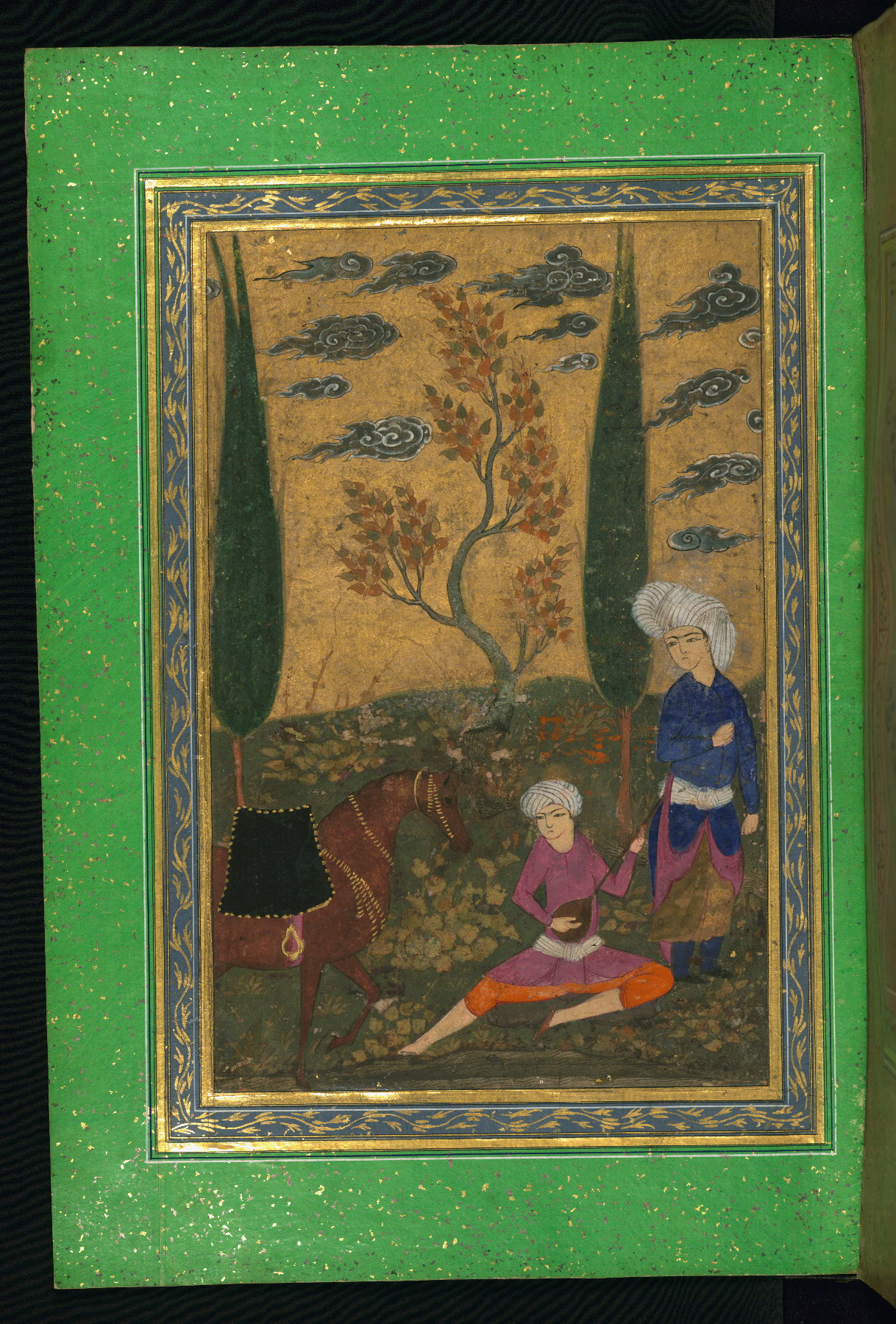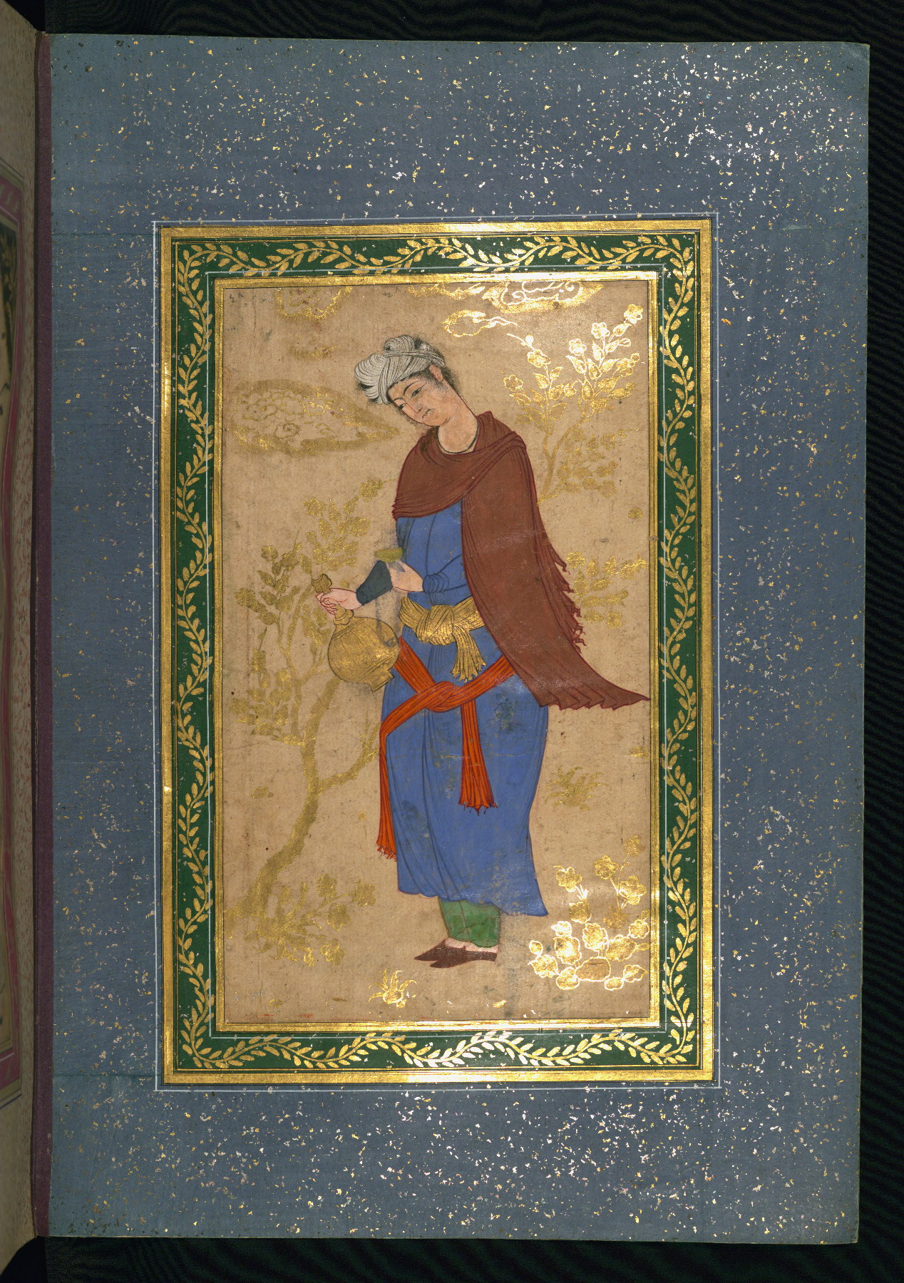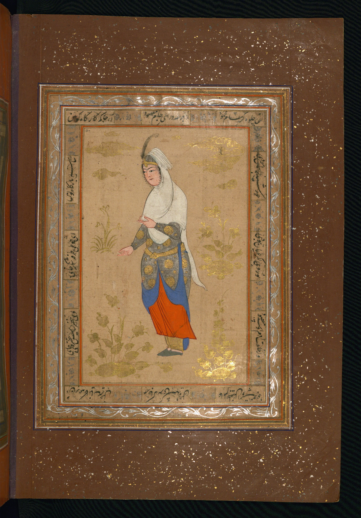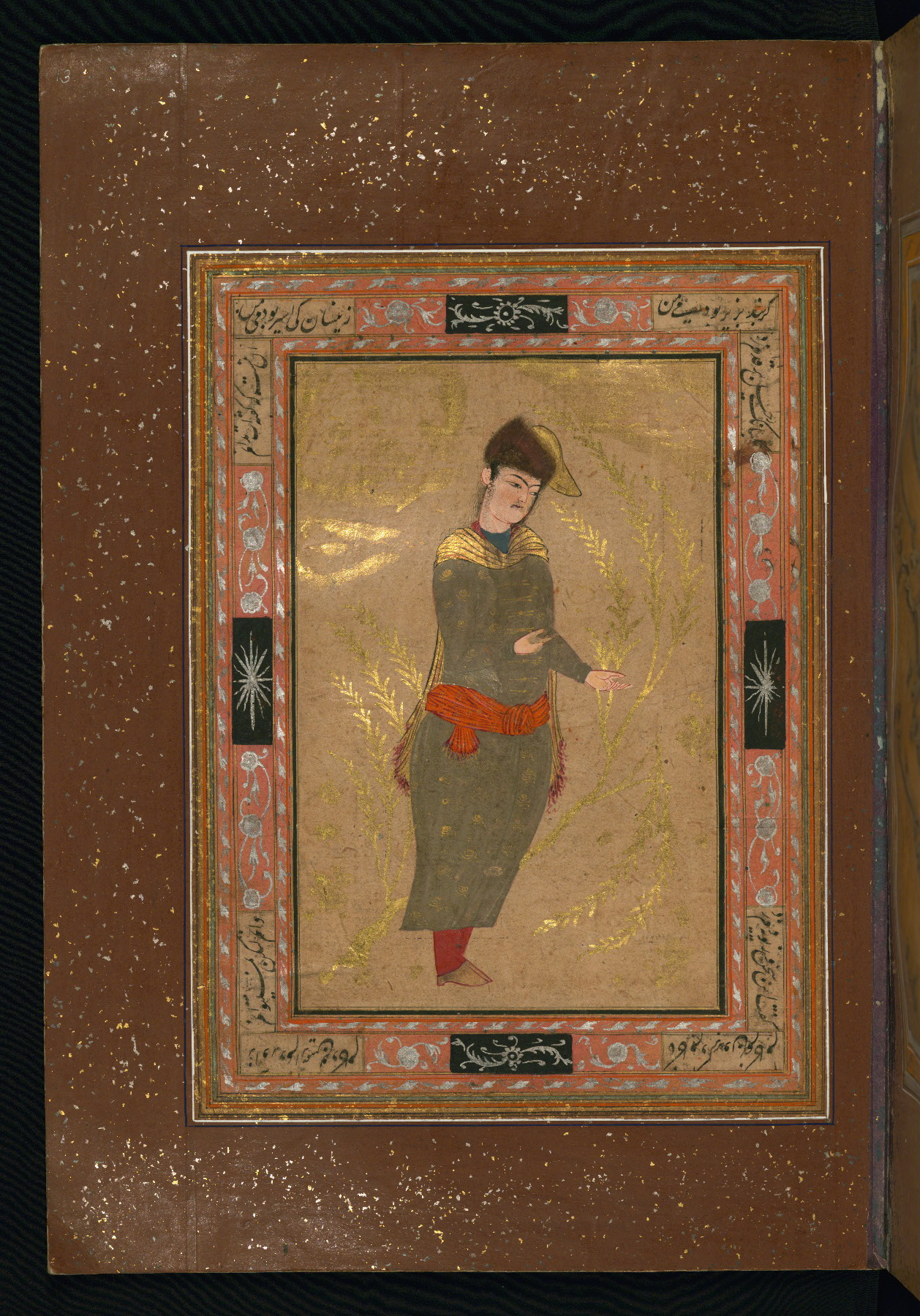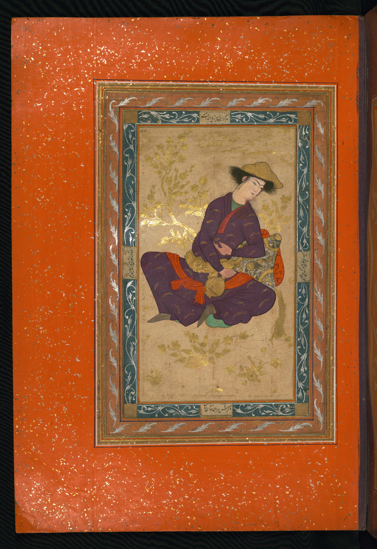 This album of painting and calligraphy was compiled in the late thirteenth century AH / nineteenth CE or early fourteenth century AH / twentieth CE, most likely in Turkey. The signed pieces of calligraphy represent nine different Persian calligraphers, including Sulṭān ʿAlī al-Mashhadī, Sulṭān Murād al-Ḥusaynī, Muḥammad Ḥusayn, Niʿmat Allāh al-Mashhadī, Muḥammad Aṣghar, Shāh Muḥammad al-Mashhadī, and Muḥammad Zamān. There are thirty-one paintings, the majority of which are executed in the Safavid style but are attributable to the late thirteenth century AH / nineteenth CE or early fourteenth century AH / twentieth CE. They were most likely made in Turkey. The borders are polychrome and marbled gold-sprinkled paper. The brown leather binding decorated with landscape scenes and brushed with gold is contemporary with the compiling of the album.