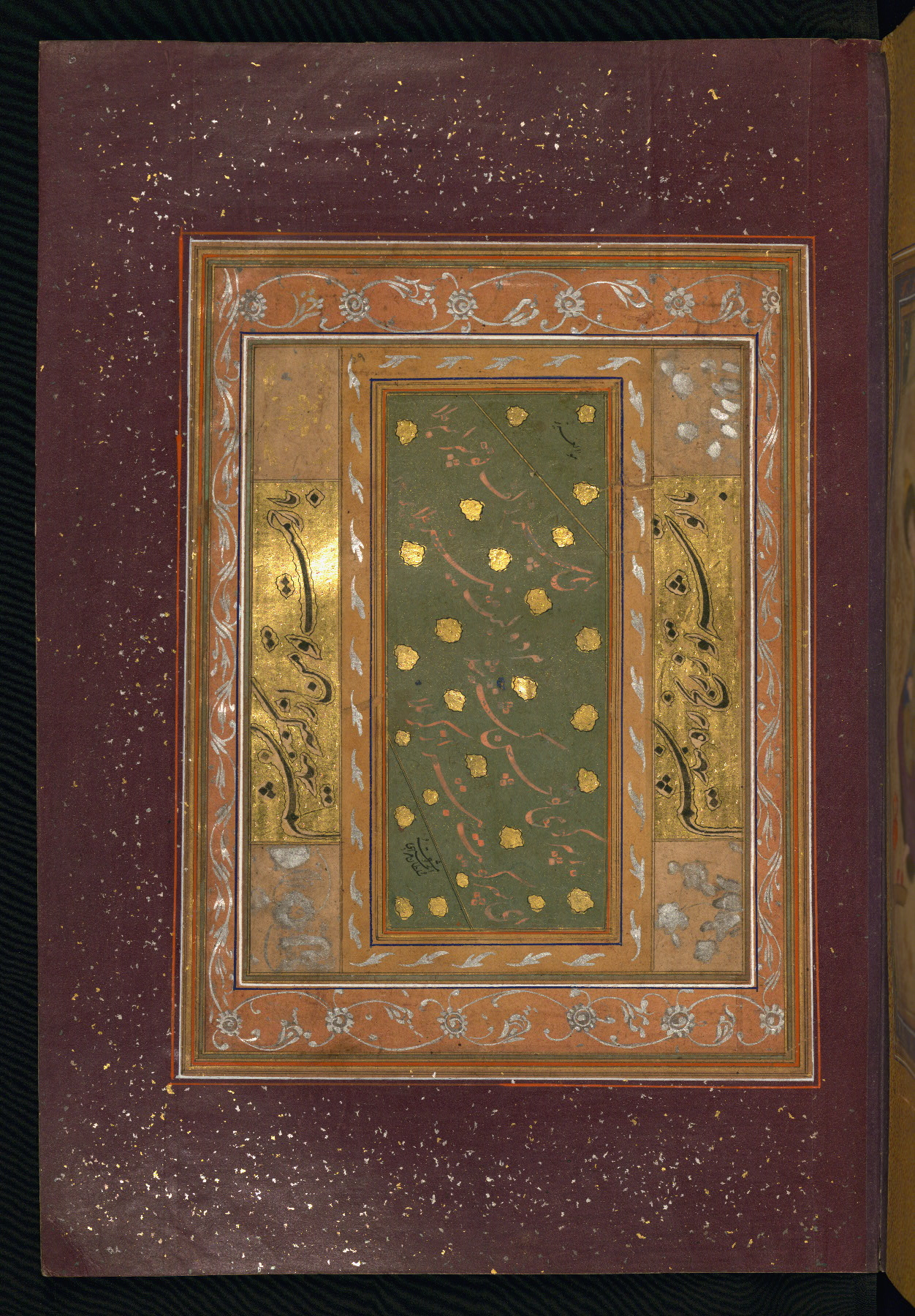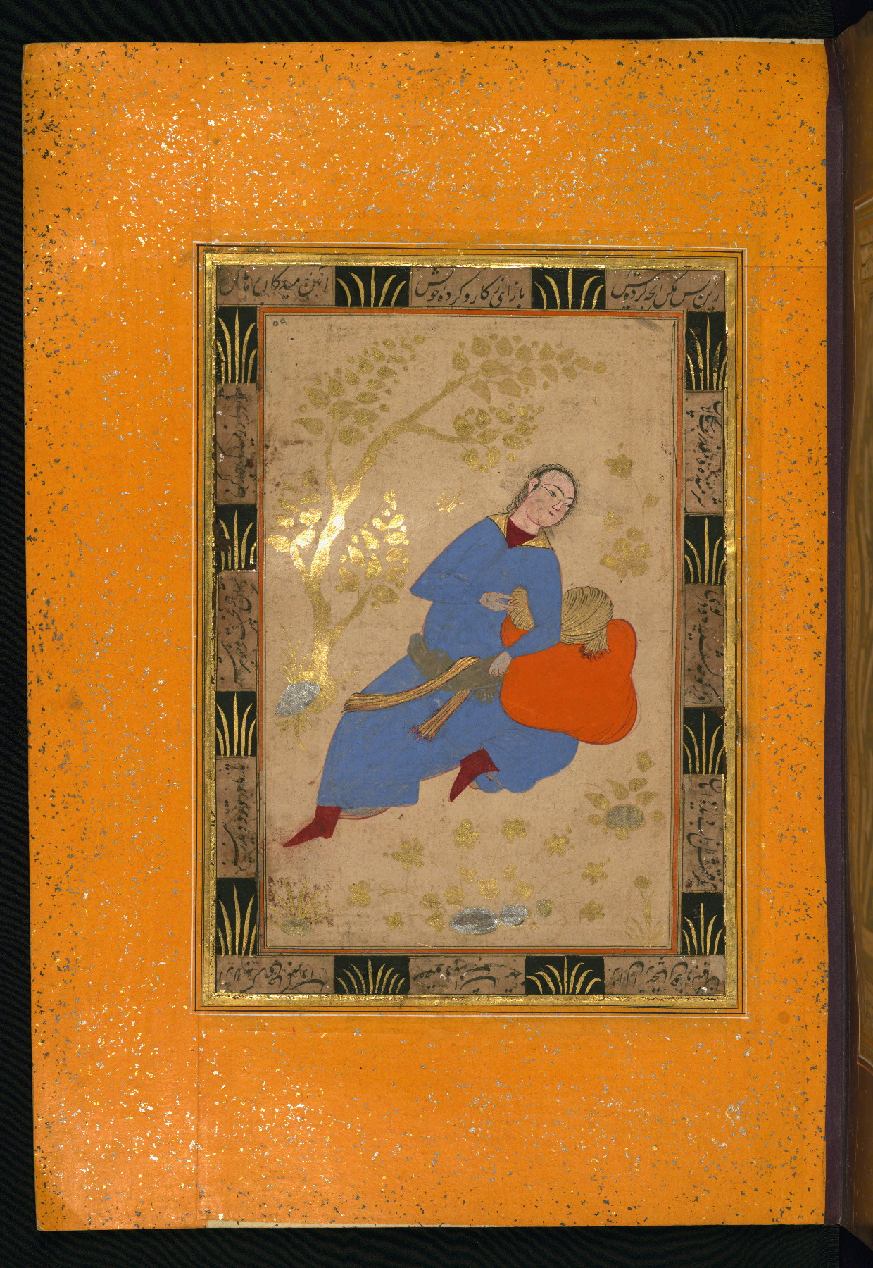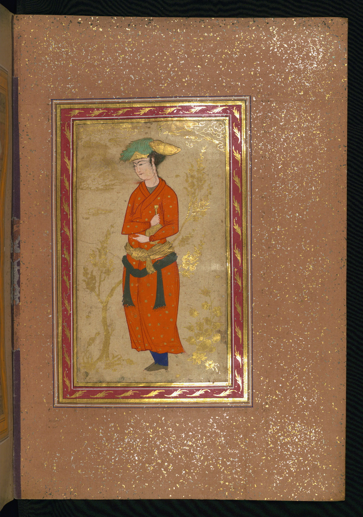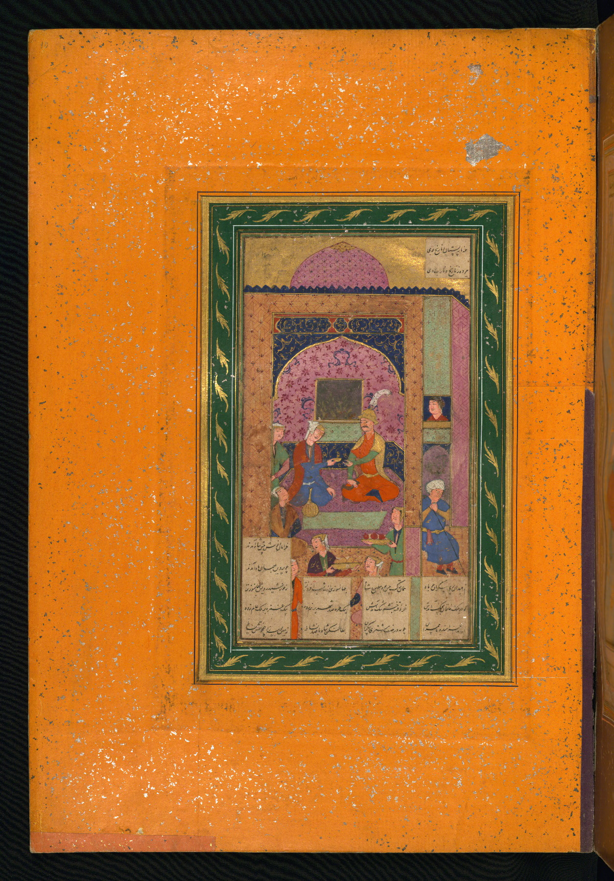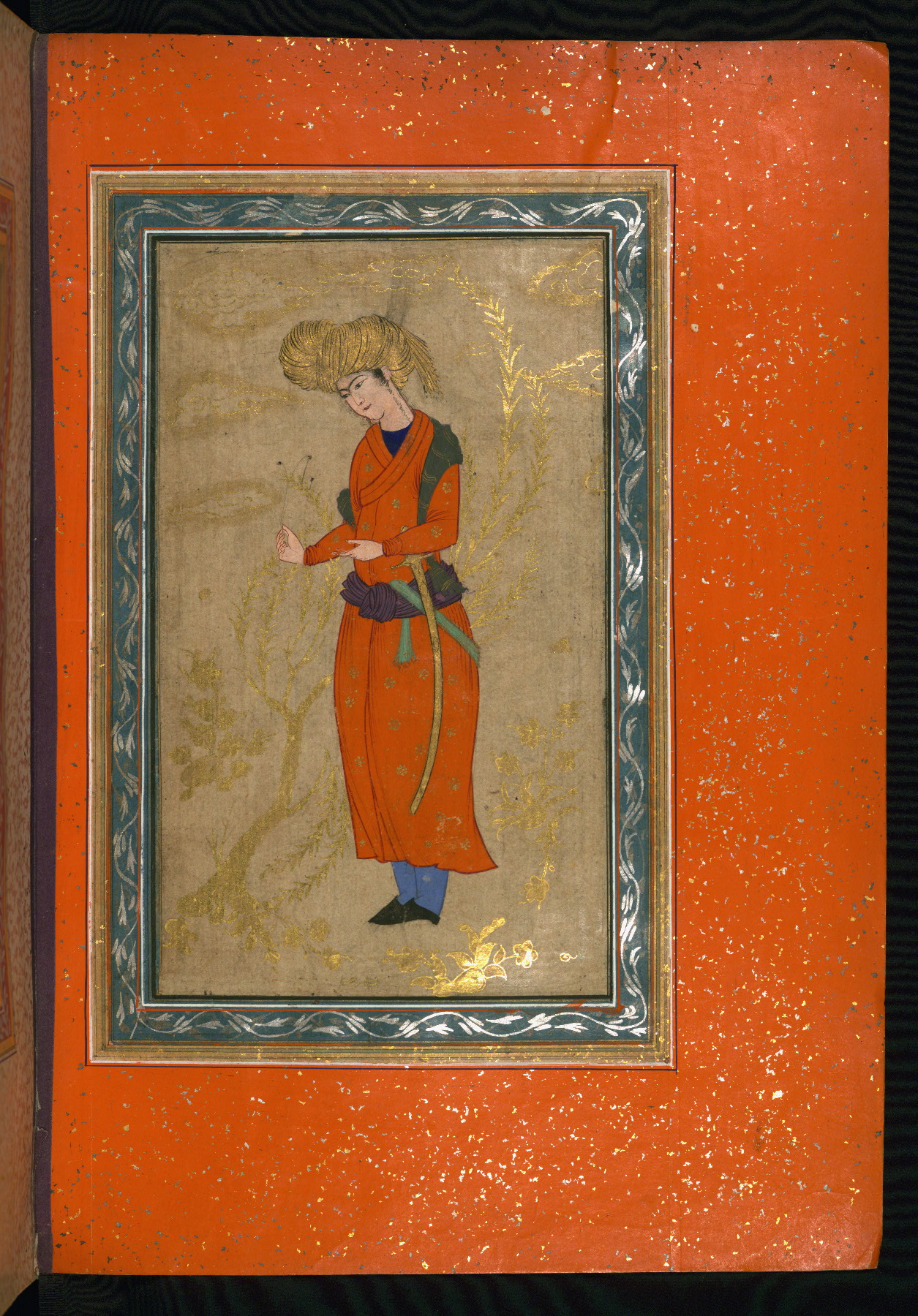 This album of painting and calligraphy was compiled in the late thirteenth century AH / nineteenth CE or early fourteenth century AH / twentieth CE, most likely in Turkey. The signed pieces of calligraphy represent nine different Persian calligraphers, including Sulṭān ʿAlī al-Mashhadī, Sulṭān Murād al-Ḥusaynī, Muḥammad Ḥusayn, Niʿmat Allāh al-Mashhadī, Muḥammad Aṣghar, Shāh Muḥammad al-Mashhadī, and Muḥammad Zamān. There are thirty-one paintings, the majority of which are executed in the Safavid style but are attributable to the late thirteenth century AH / nineteenth CE or early fourteenth century AH / twentieth CE. They were most likely made in Turkey. The borders are polychrome and marbled gold-sprinkled paper. The brown leather binding decorated with landscape scenes and brushed with gold is contemporary with the compiling of the album.