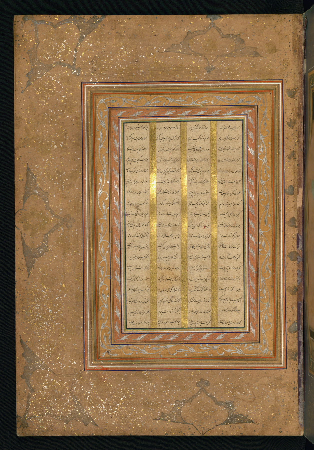Contemporary with the compiling of the album; brown leather (with flap); decorated with a landscape scene brushed with gold; doublures of red leather, richly decorated with floral motifs