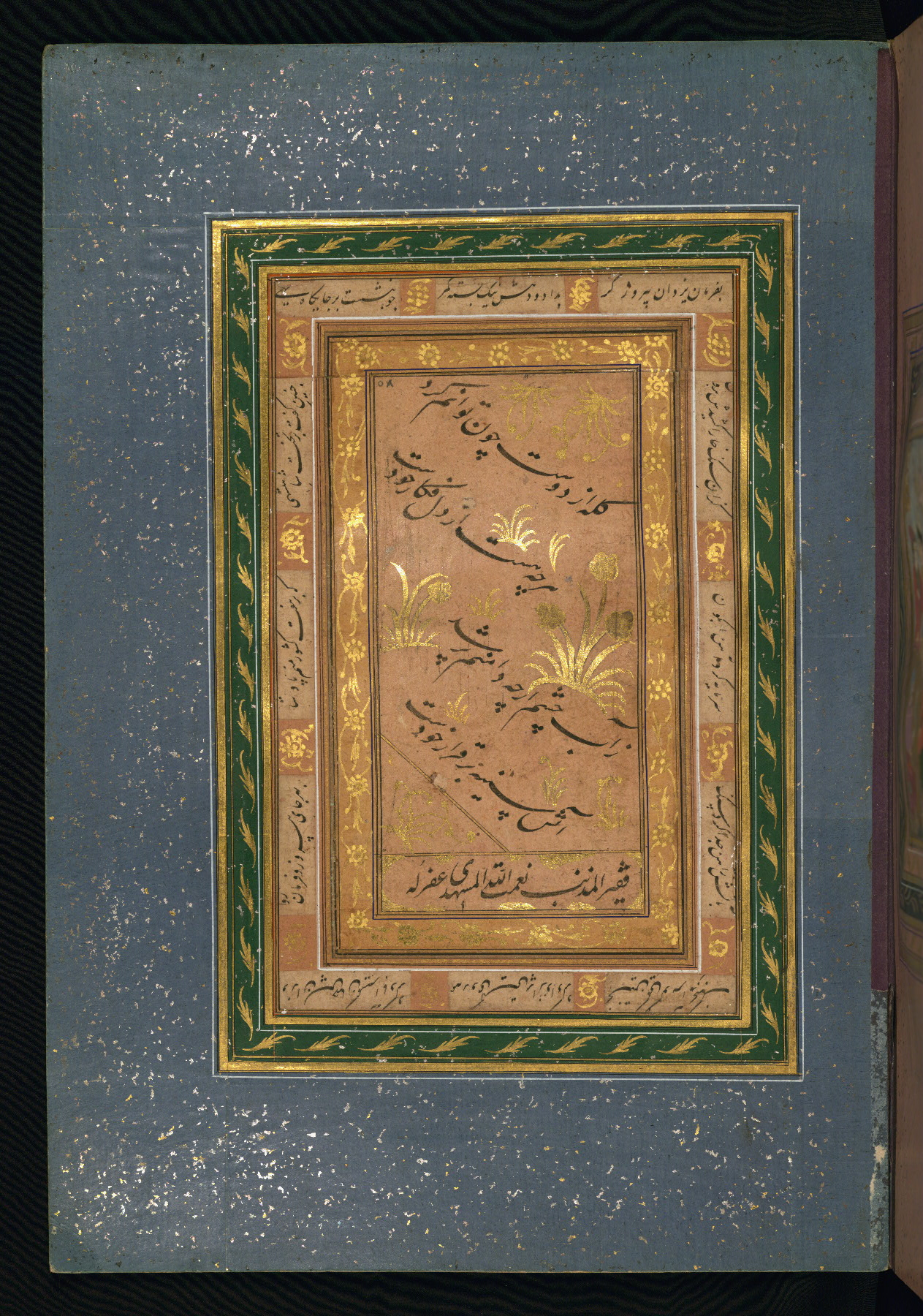 - Label: This calligraphy page is written in nastaʿlīq script by Nuʿmat Allāh al-Mashhadī.