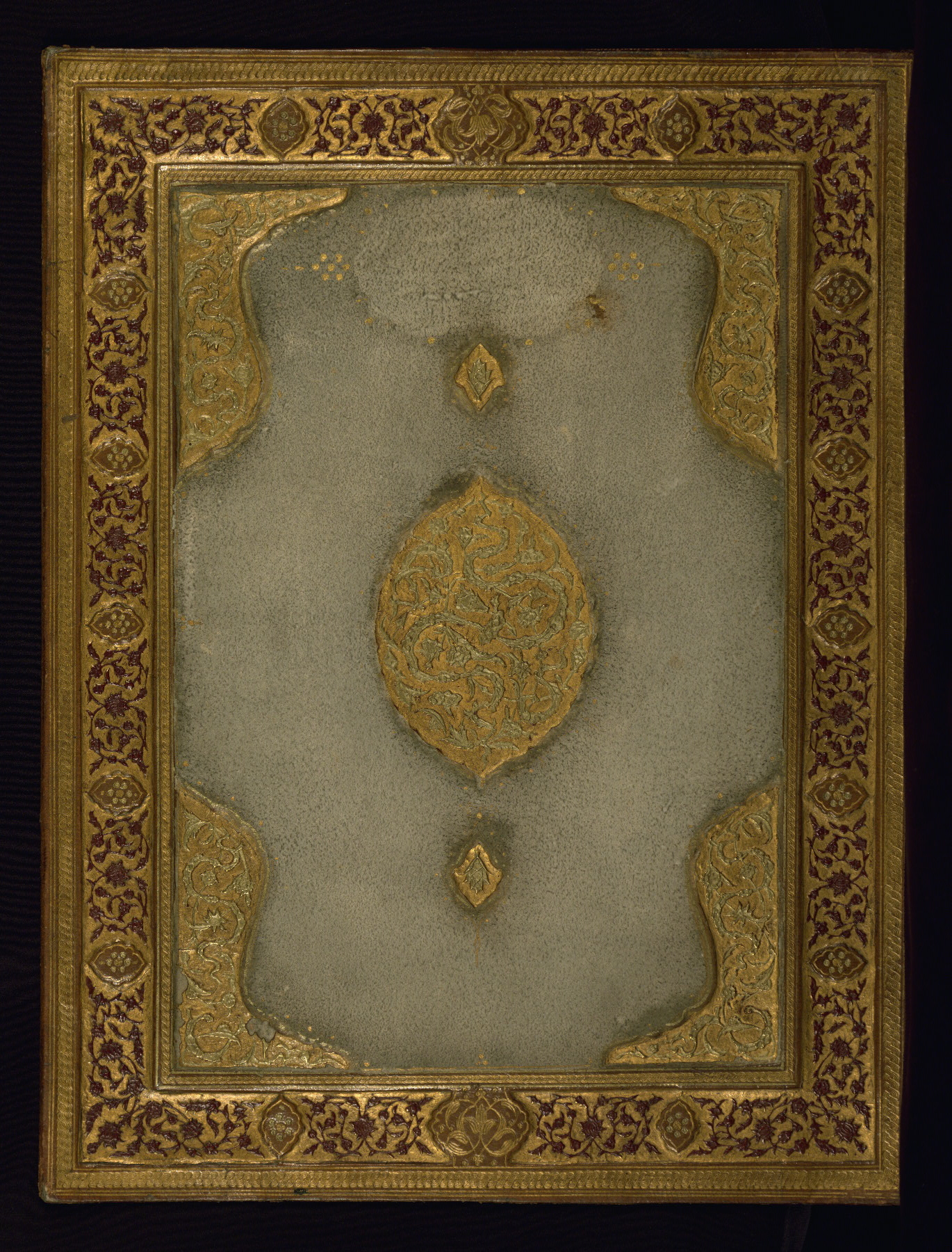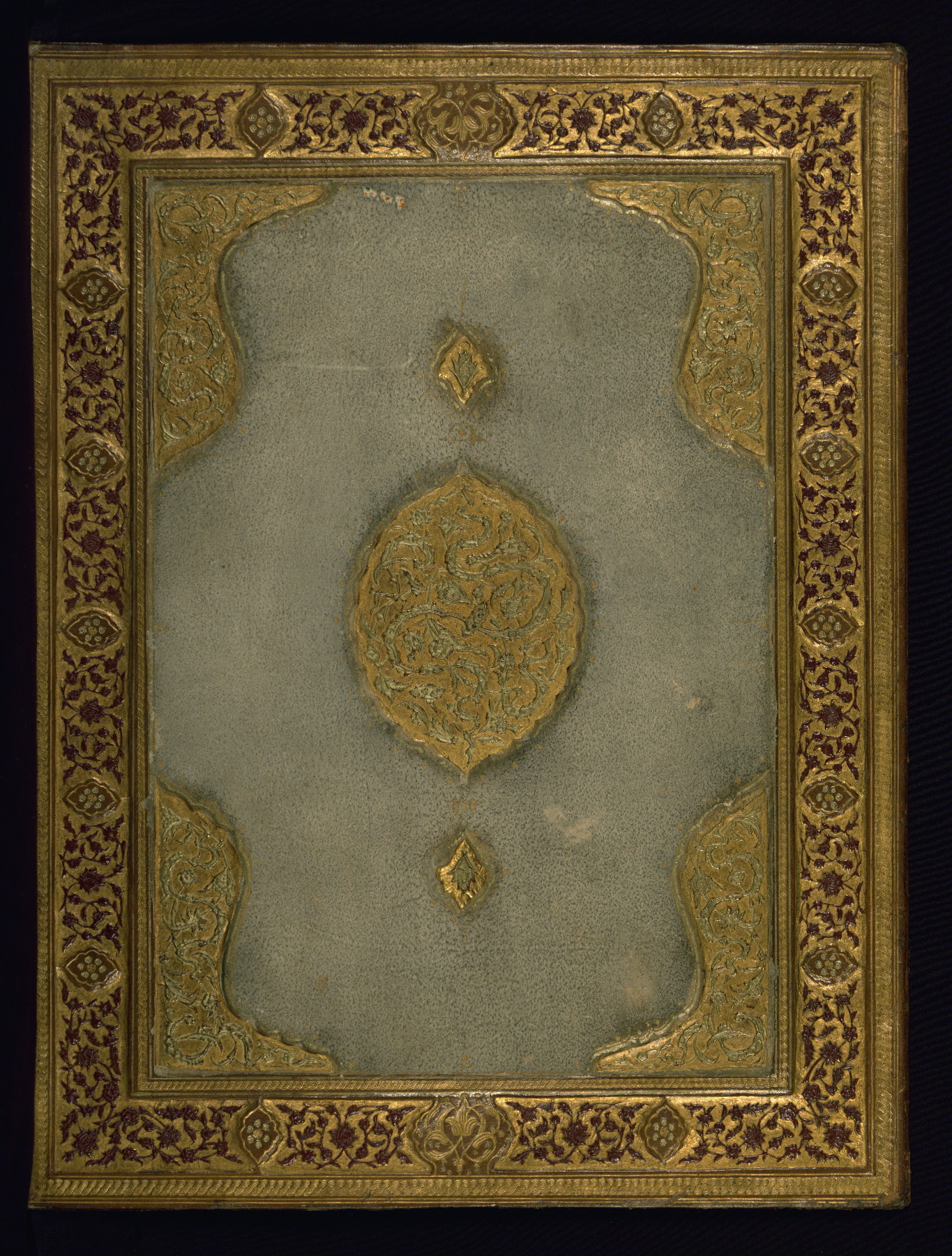 Probably dates to the twelfth century AH / eighteenth CE; sheepskin-covered boards; central oval medallion; pendants and cornerpieces; gold-painted border; central panel filled with chamois leather