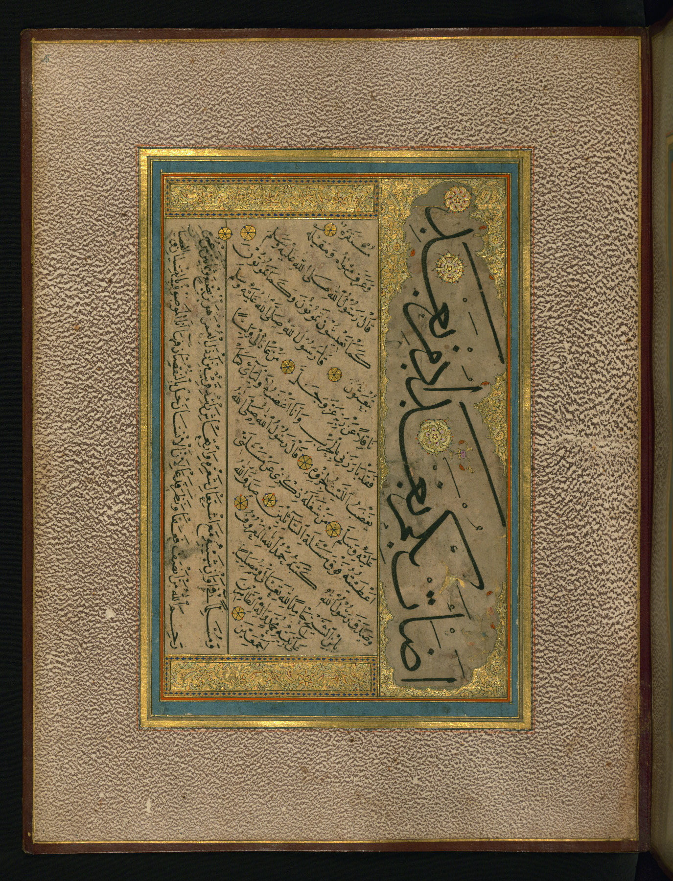 - Label: This page bears the name of the celebrated Ottoman calligrapher Şeyh Hamdullah (Ḥamd Allāh al-Amāsī, d. 926 AH / 1520 CE). The colophon may be translated into English as follows: This was written by Ḥamdu Llāh, [who is] known as the sheikh's son, [while] praising God--exalted is he--and praying for his messenger Muhammad and his family, the pure ones, all of them, and praying for their safety. [This was] at the time of his hoariness as his hair glistened white and his head trembled and he was close to the state of decrepitude, being 80 and some odd years old. May God have mercy on those who act equitably and forgive and those who consider [things] closely and pray, because mankind was made to abide in deficiency and here am I, characterized by forgetfulness and disobedience.