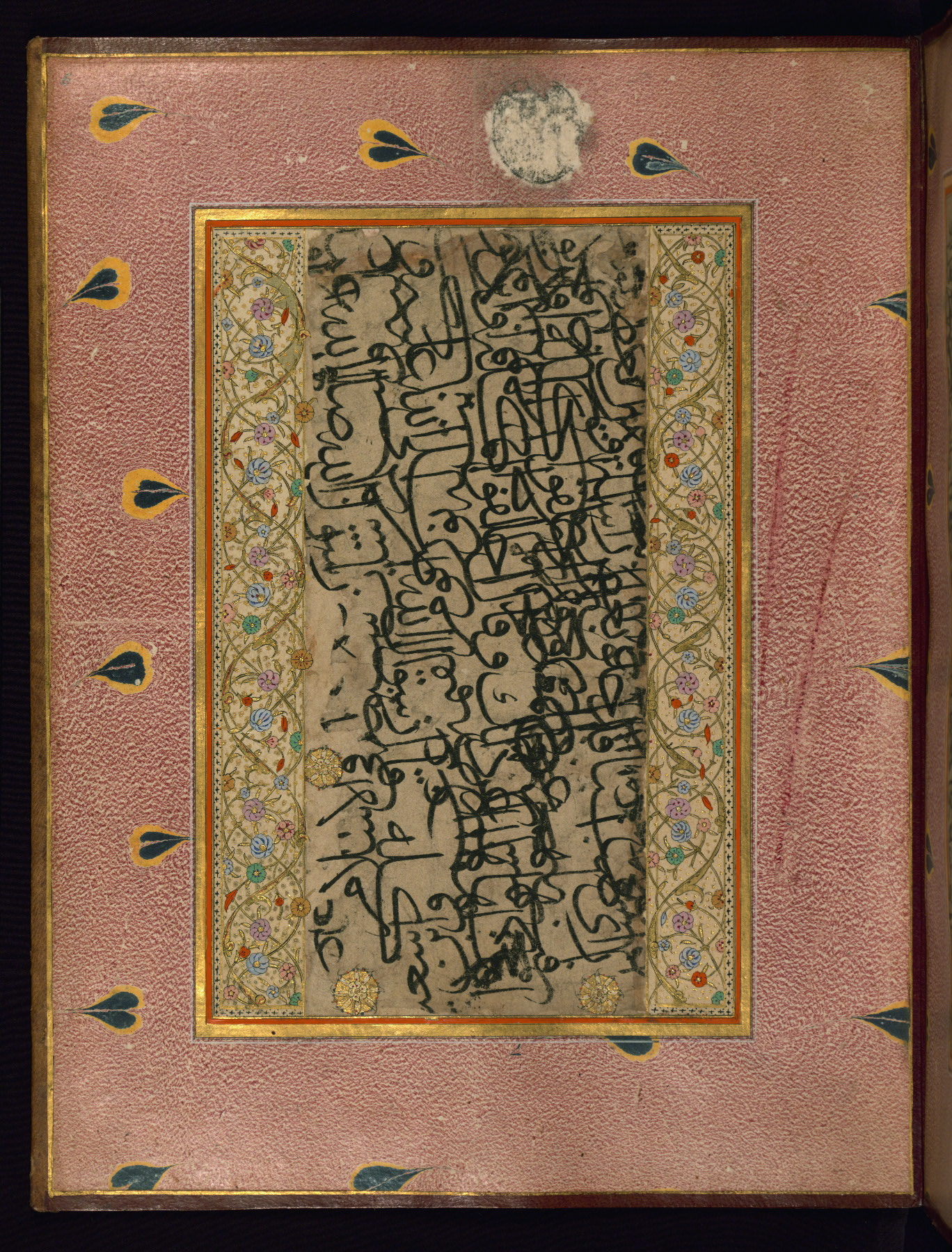 - Label: This is a sheet of pen exercises (ḳaralama). Such pen exercises were commonly collected in albums. In their technique and design pattern, the borders of this page are comparable to ebru (marbled paper) made by Hatib Mehmed Efendi (d. 1187 AH / 1773 CE), a celebrated Ottoman artist.