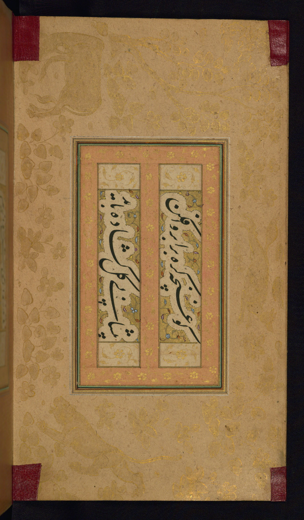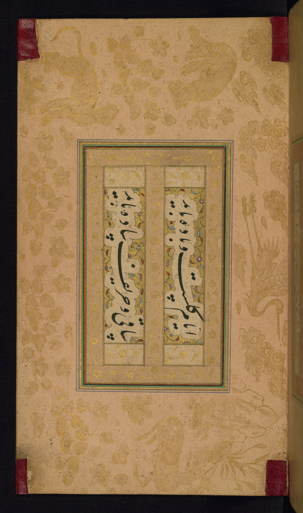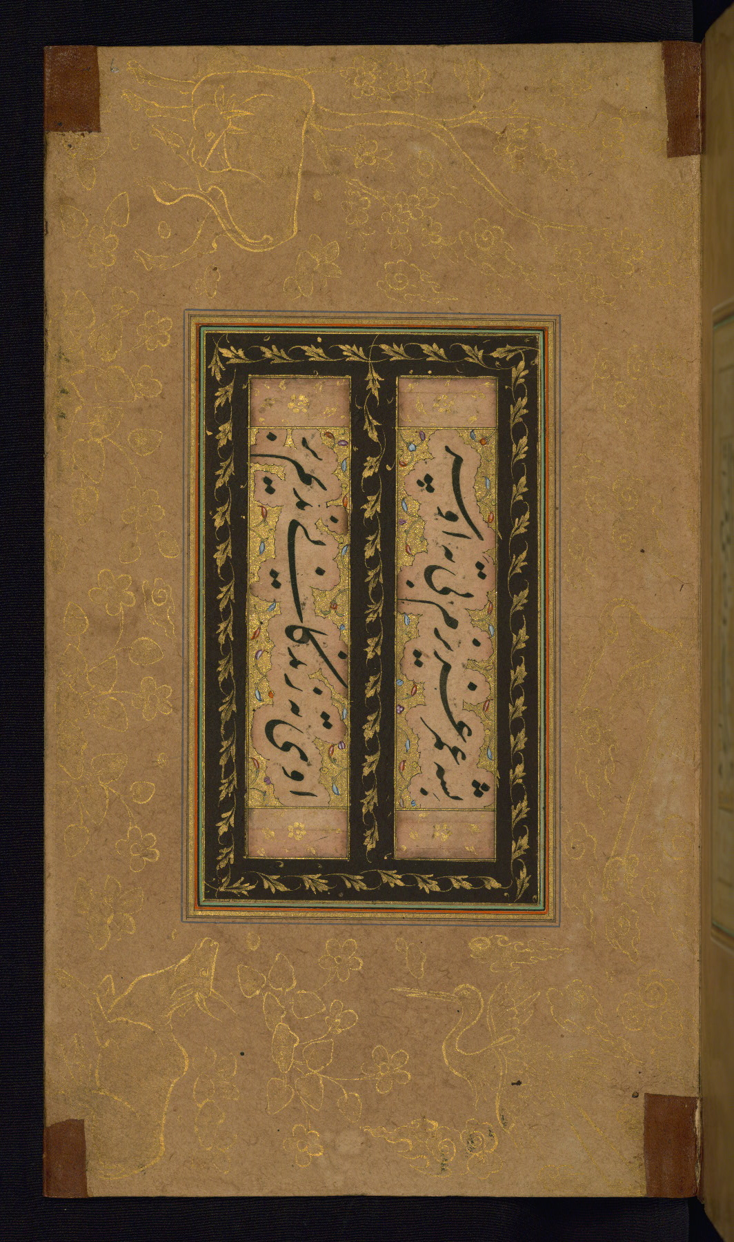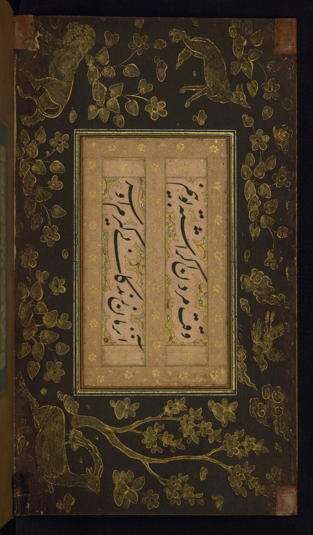 This is an illuminated album (muraqqaʿ) in accordion format containing Persian calligraphy. It was executed in Iran during the eleventh century AH / seventeenth CE. Lines of text in black nastaʿlīq script are framed by decorative cloud-bands. Borders are decorated with illuminated vegetal and animal motifs on multicolored paper. This album bears a seal impression of the Ottoman Sultan ʿUthmān Khān (Osman III, r. 1167 AH / 1754 CE -- 1170 AH / 1757 CE) and a bequest (waqf) entry and seal by Ibrāhīm Ḥanīf, inspector of awqāf (fol. 1b). The dark brown leather binding with central oval and pendants is contemporary with the manuscript but may not be original to it.