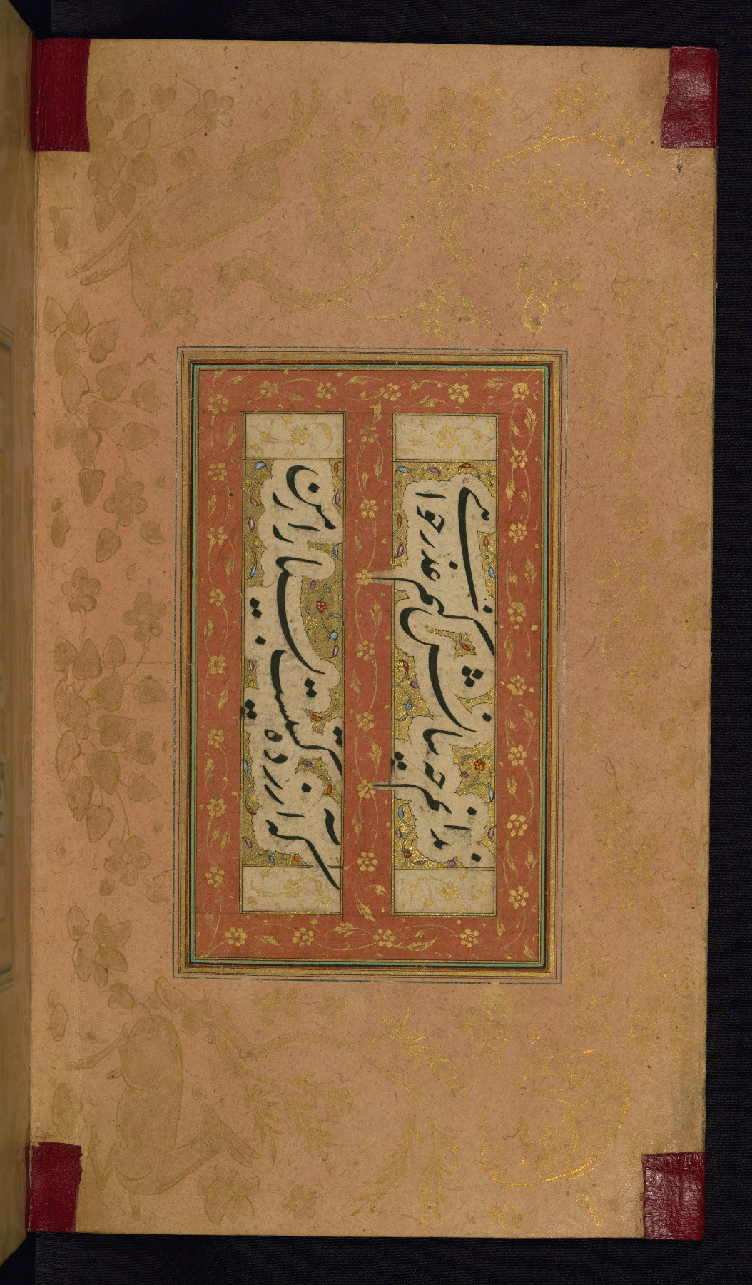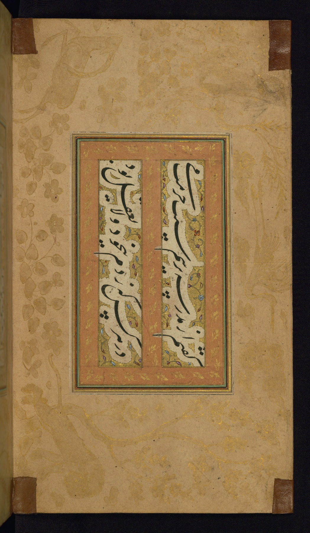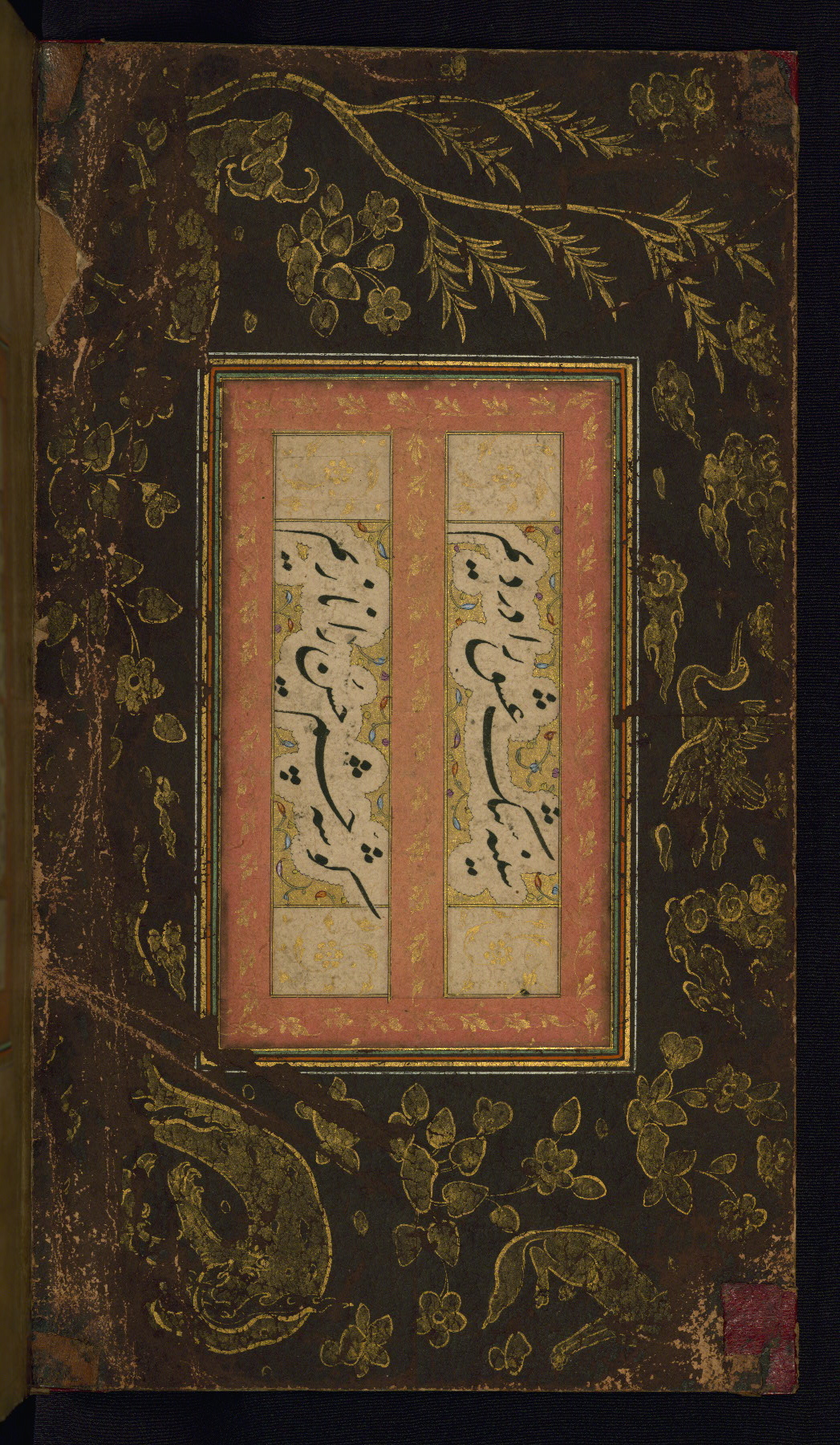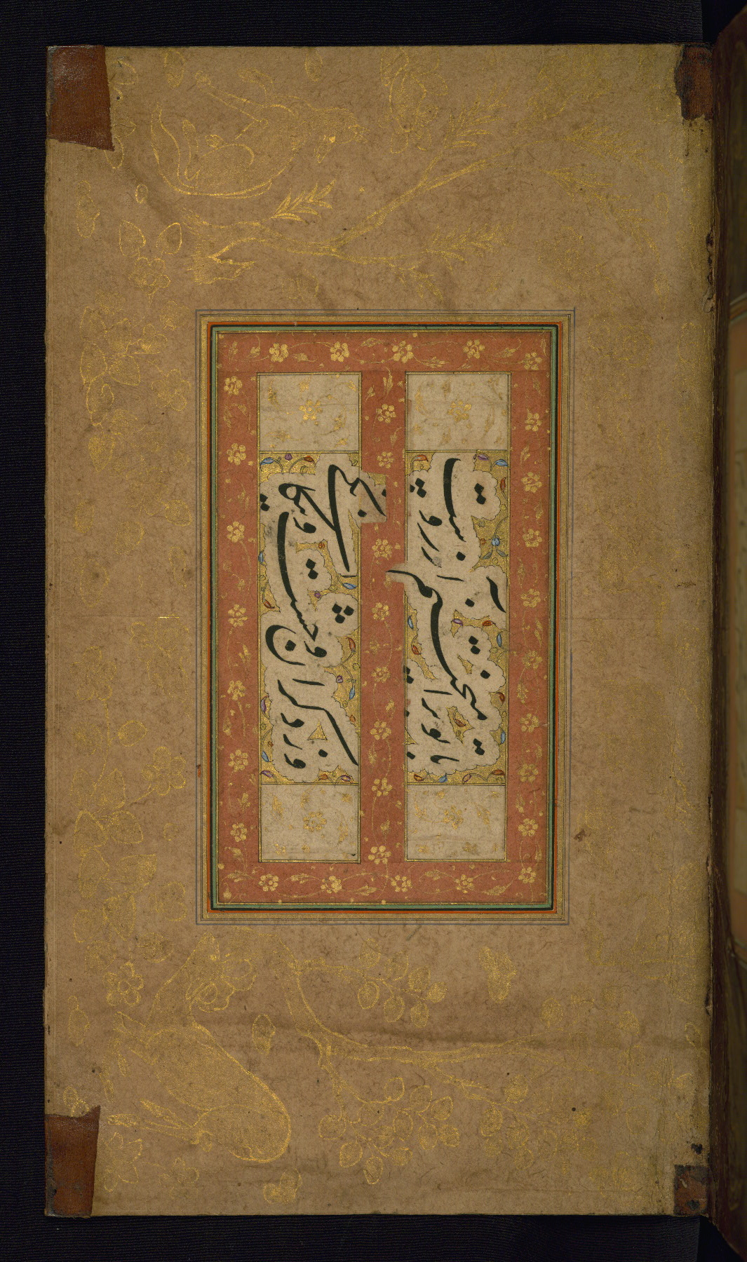 This is an illuminated album (muraqqaʿ) in accordion format containing Persian calligraphy. It was executed in Iran during the eleventh century AH / seventeenth CE. Lines of text in black nastaʿlīq script are framed by decorative cloud-bands. Borders are decorated with illuminated vegetal and animal motifs on multicolored paper. This album bears a seal impression of the Ottoman Sultan ʿUthmān Khān (Osman III, r. 1167 AH / 1754 CE -- 1170 AH / 1757 CE) and a bequest (waqf) entry and seal by Ibrāhīm Ḥanīf, inspector of awqāf (fol. 1b). The dark brown leather binding with central oval and pendants is contemporary with the manuscript but may not be original to it.