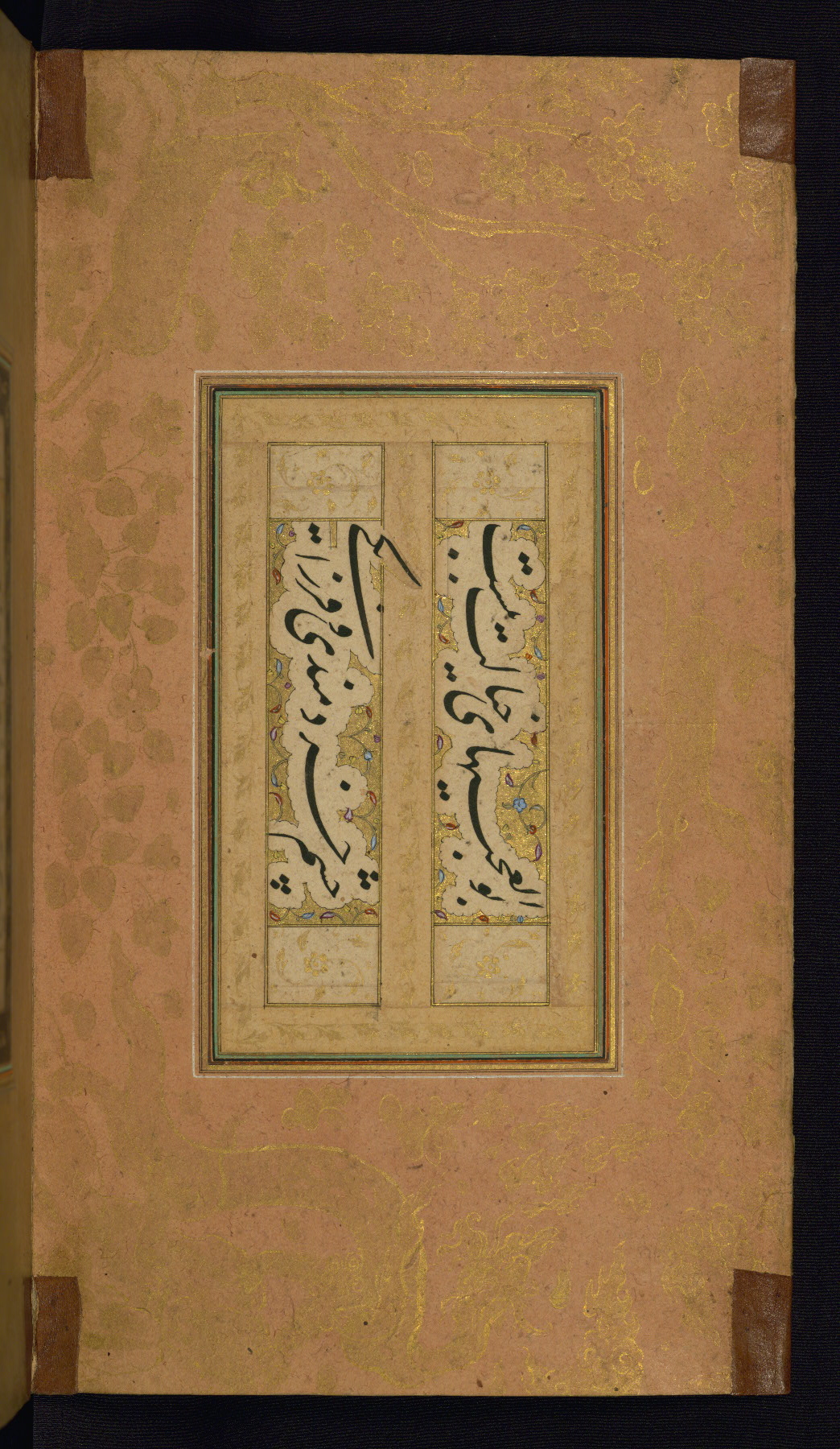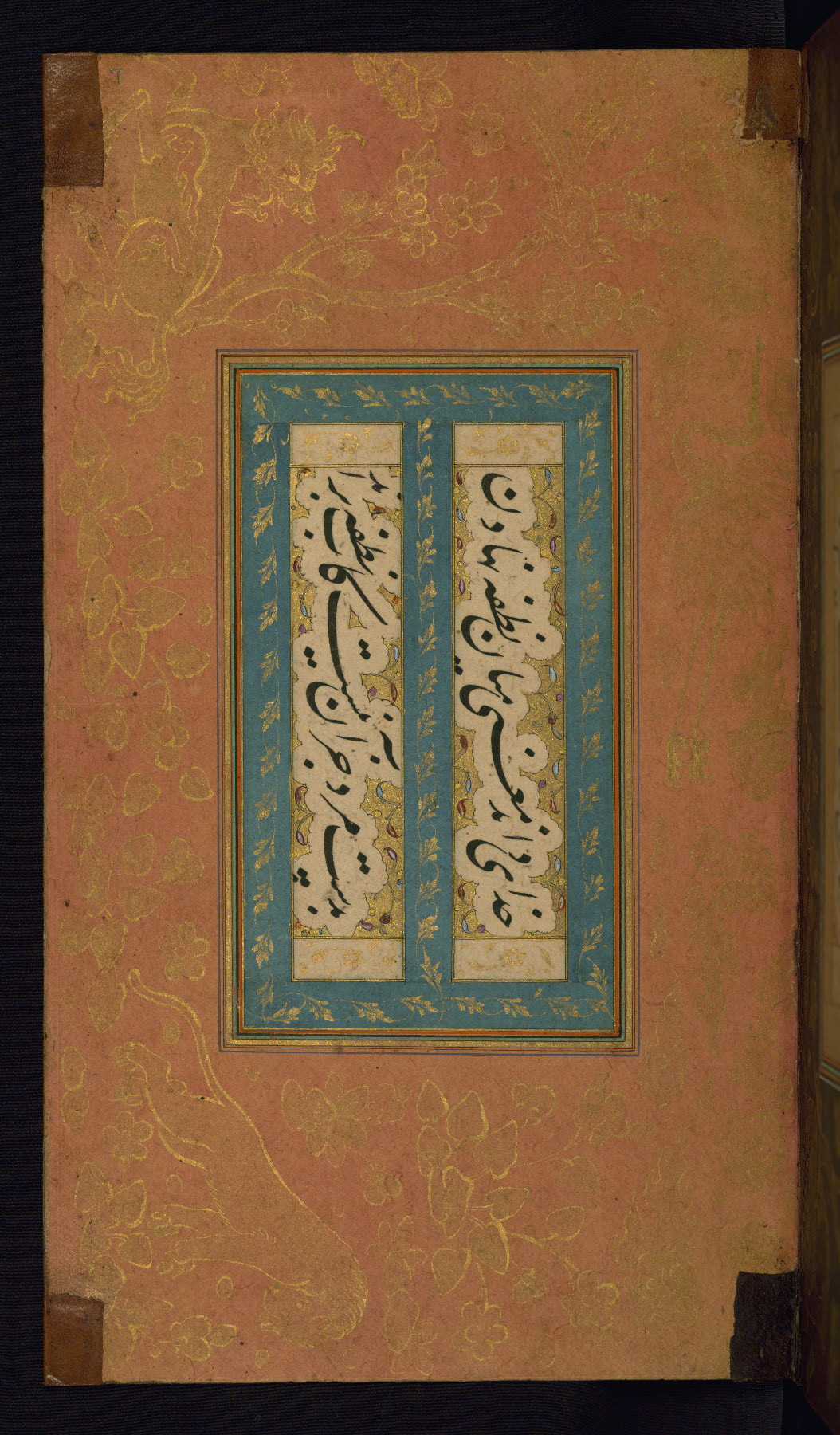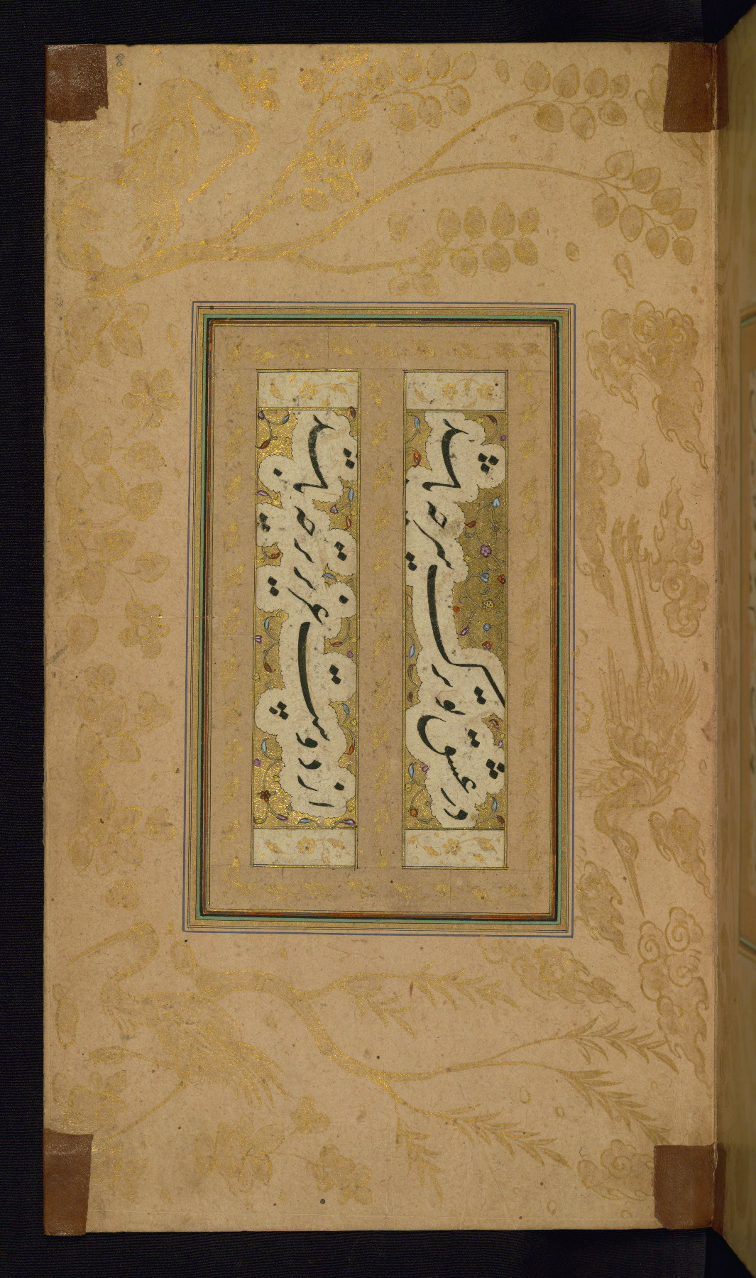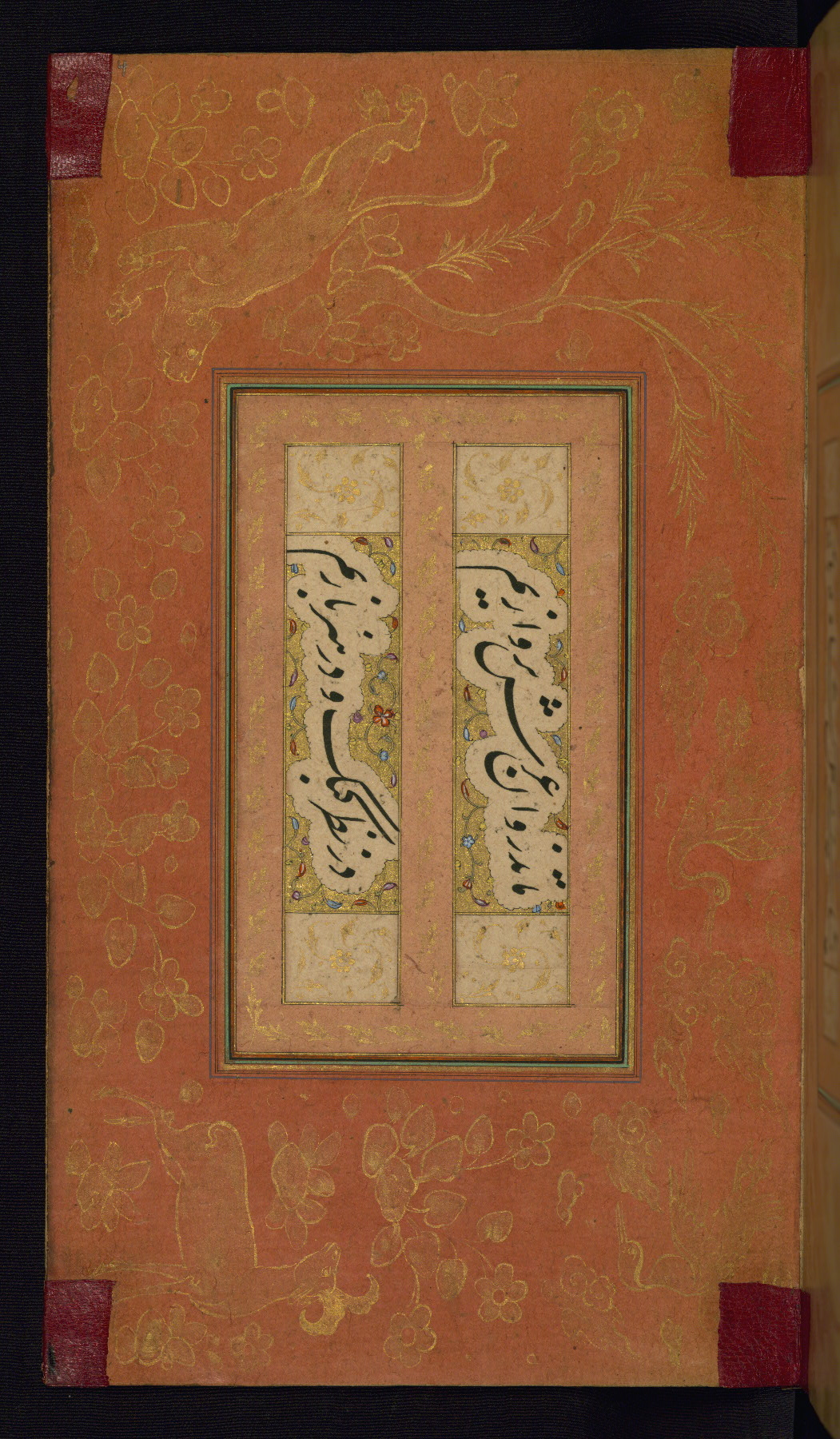This is an illuminated album (muraqqaʿ) in accordion format containing Persian calligraphy. It was executed in Iran during the eleventh century AH / seventeenth CE. Lines of text in black nastaʿlīq script are framed by decorative cloud-bands. Borders are decorated with illuminated vegetal and animal motifs on multicolored paper. This album bears a seal impression of the Ottoman Sultan ʿUthmān Khān (Osman III, r. 1167 AH / 1754 CE -- 1170 AH / 1757 CE) and a bequest (waqf) entry and seal by Ibrāhīm Ḥanīf, inspector of awqāf (fol. 1b). The dark brown leather binding with central oval and pendants is contemporary with the manuscript but may not be original to it.