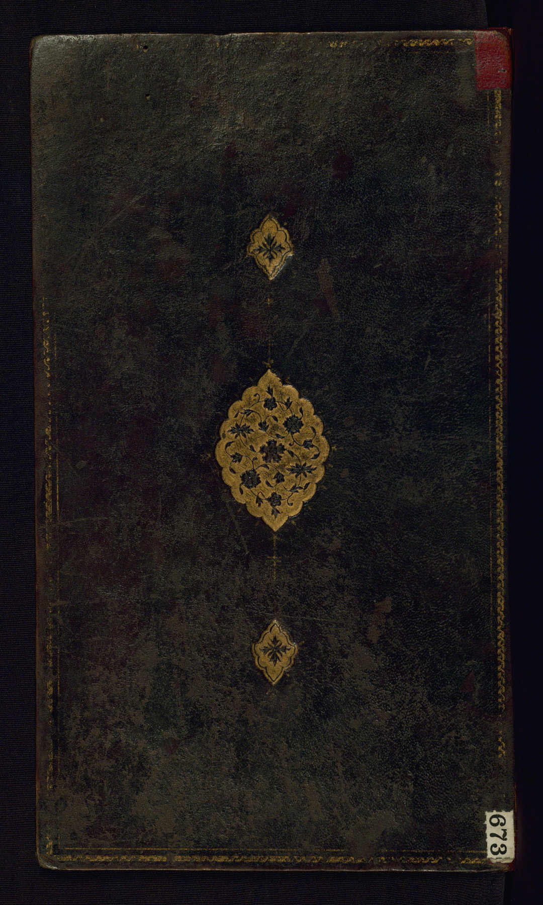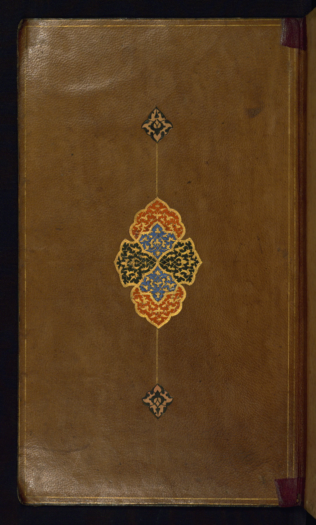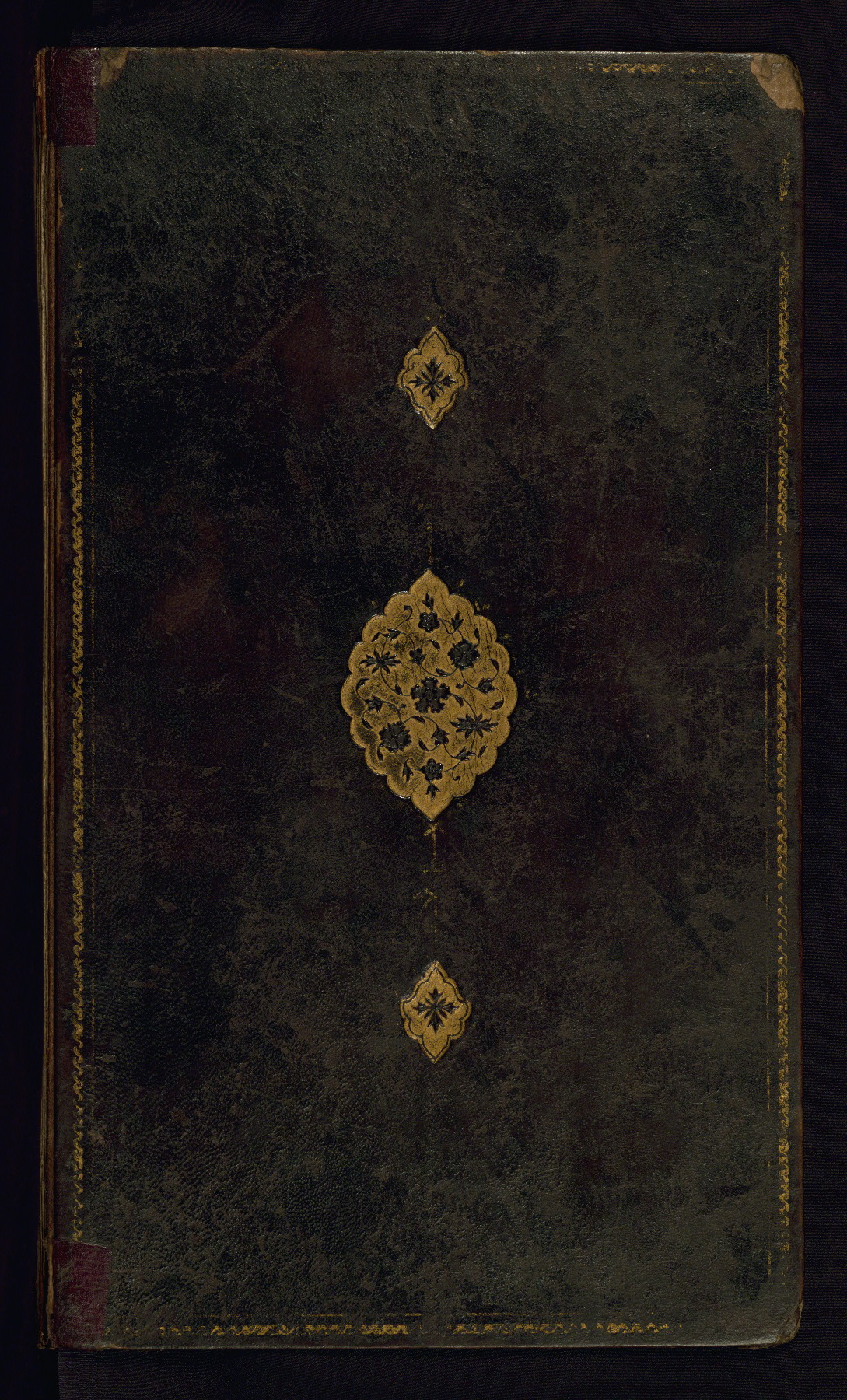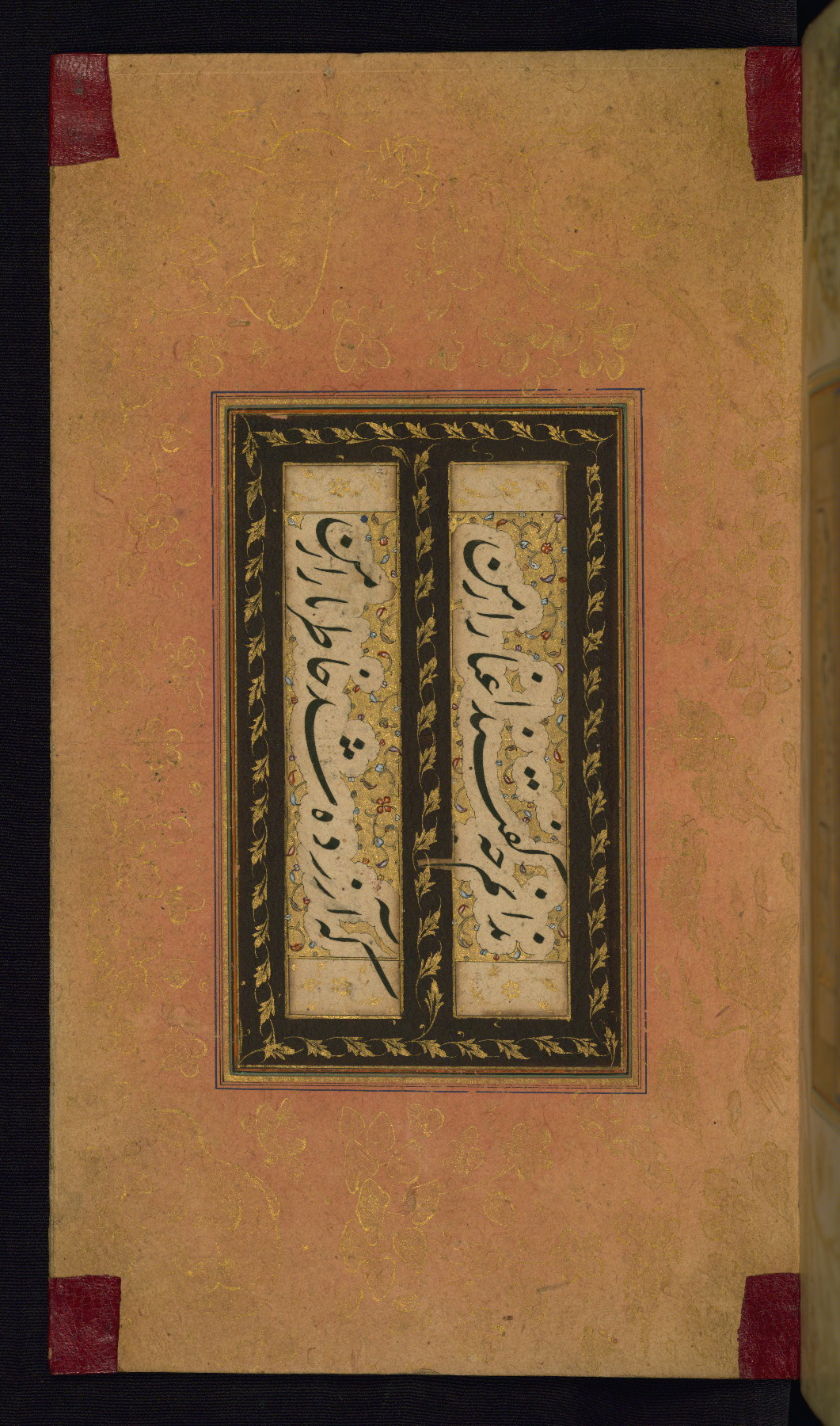 This is an illuminated album (muraqqaʿ) in accordion format containing Persian calligraphy. It was executed in Iran during the eleventh century AH / seventeenth CE. Lines of text in black nastaʿlīq script are framed by decorative cloud-bands. Borders are decorated with illuminated vegetal and animal motifs on multicolored paper. This album bears a seal impression of the Ottoman Sultan ʿUthmān Khān (Osman III, r. 1167 AH / 1754 CE -- 1170 AH / 1757 CE) and a bequest (waqf) entry and seal by Ibrāhīm Ḥanīf, inspector of awqāf (fol. 1b). The dark brown leather binding with central oval and pendants is contemporary with the manuscript but may not be original to it.