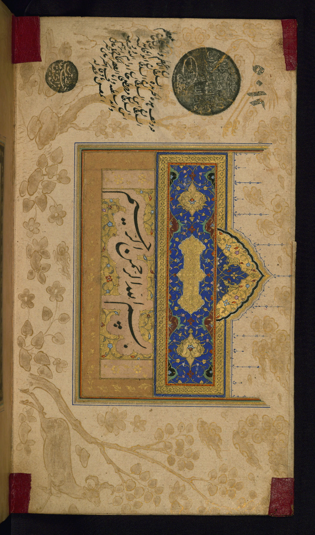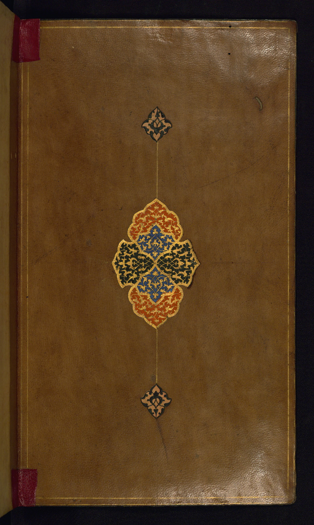 This is an illuminated album (muraqqaʿ) in accordion format containing Persian calligraphy. It was executed in Iran during the eleventh century AH / seventeenth CE. Lines of text in black nastaʿlīq script are framed by decorative cloud-bands. Borders are decorated with illuminated vegetal and animal motifs on multicolored paper. This album bears a seal impression of the Ottoman Sultan ʿUthmān Khān (Osman III, r. 1167 AH / 1754 CE -- 1170 AH / 1757 CE) and a bequest (waqf) entry and seal by Ibrāhīm Ḥanīf, inspector of awqāf (fol. 1b). The dark brown leather binding with central oval and pendants is contemporary with the manuscript but may not be original to it.