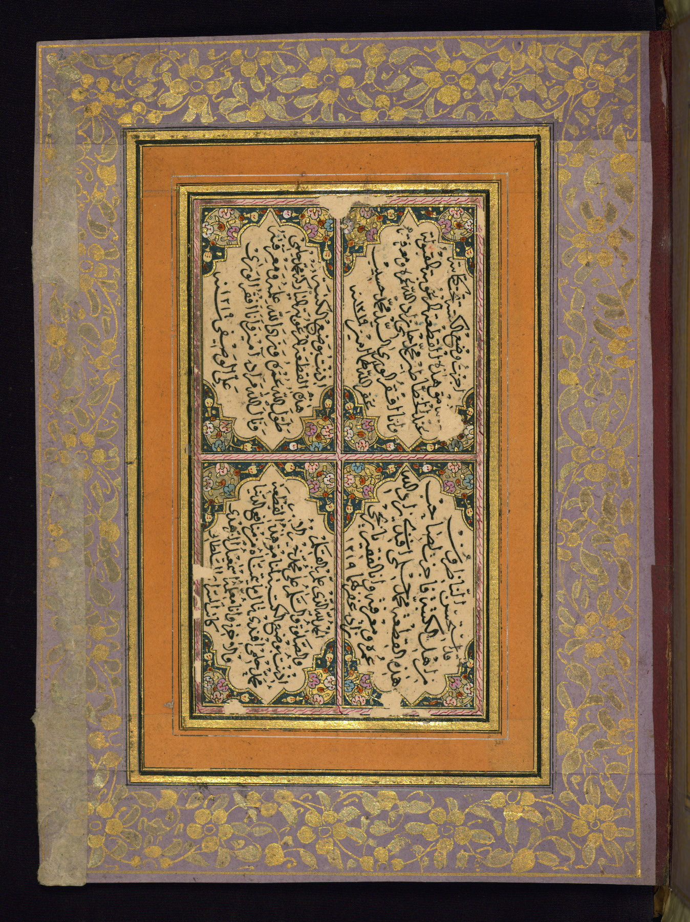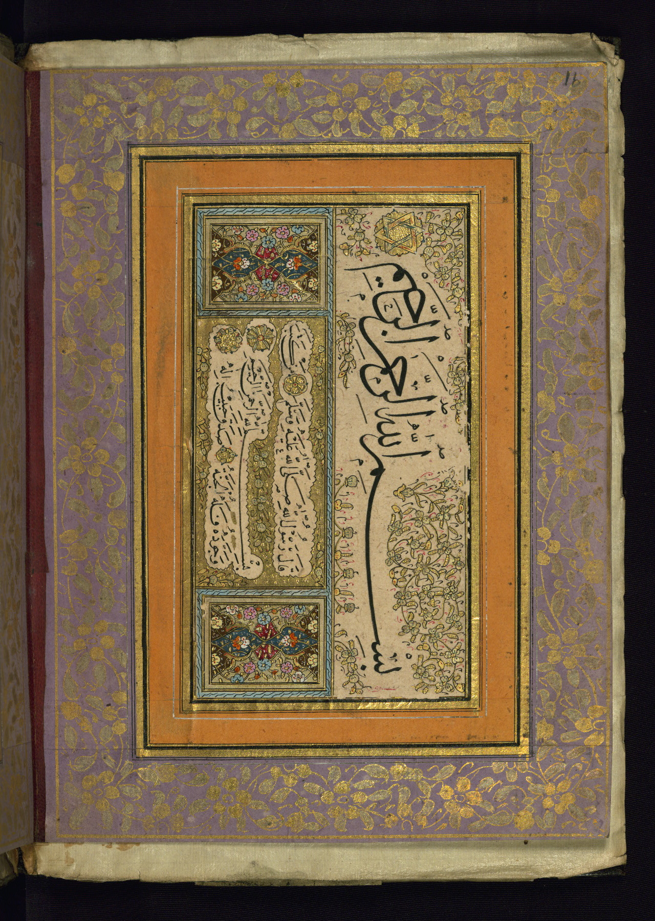 - Label: This page bears four diplomas written within illuminated cartouches inscribed in ijāzah script by the following master calligraphers: Yāzījī zādah, Ismāʿīl al-Zuhdī Kātib al-Sarāy al-Sulṭānī, Muḥammad Ḥasīb, and ʿAlī al-Waṣfī. The page is dated 1219 AH / 1804-5 CE.