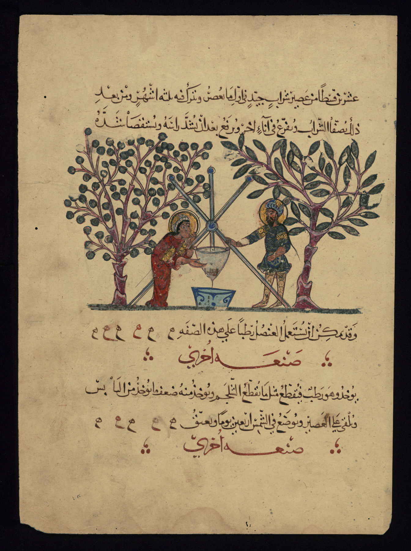 This is a single leaf from a dispersed manuscript (Aya Sofya 3703, later Top Kapi Seray 2147) of the Arabic version of De materia medica by Dioscorides (fl. ca. 65 CE) that was copied in 621 AH / 1224 CE in Baghdad. Approximately thirty illustrations were removed from this parent manuscript that are now in public and private collections. The Walters' leaf depicts two doctors preparing medicine. A funnel is set on a tripod over a vessel. The two men preparing the medicinal draught stand on either side of the tripod beside two fruit trees. The text is written in partially vocalized naskh script in brownish-black and red ink.