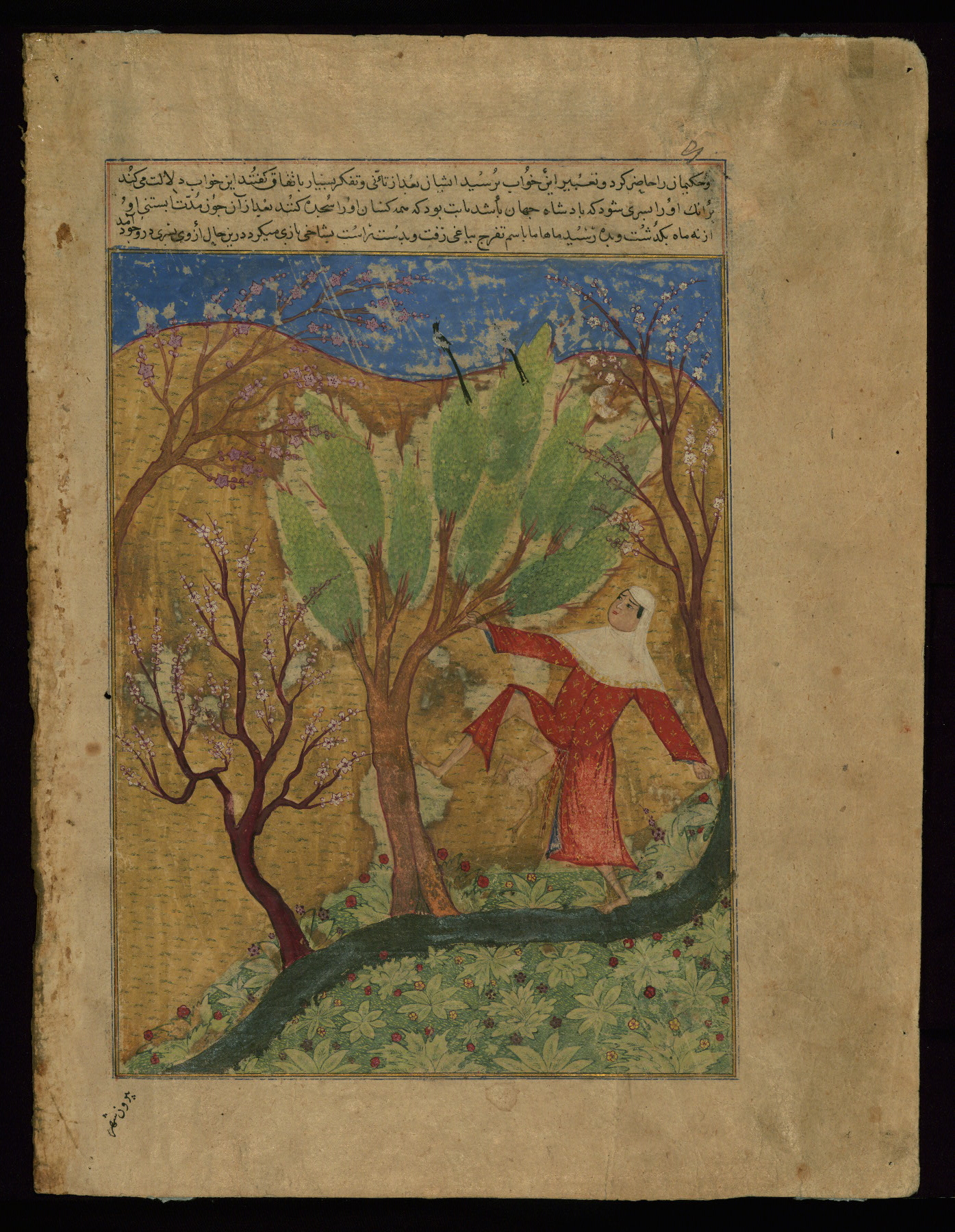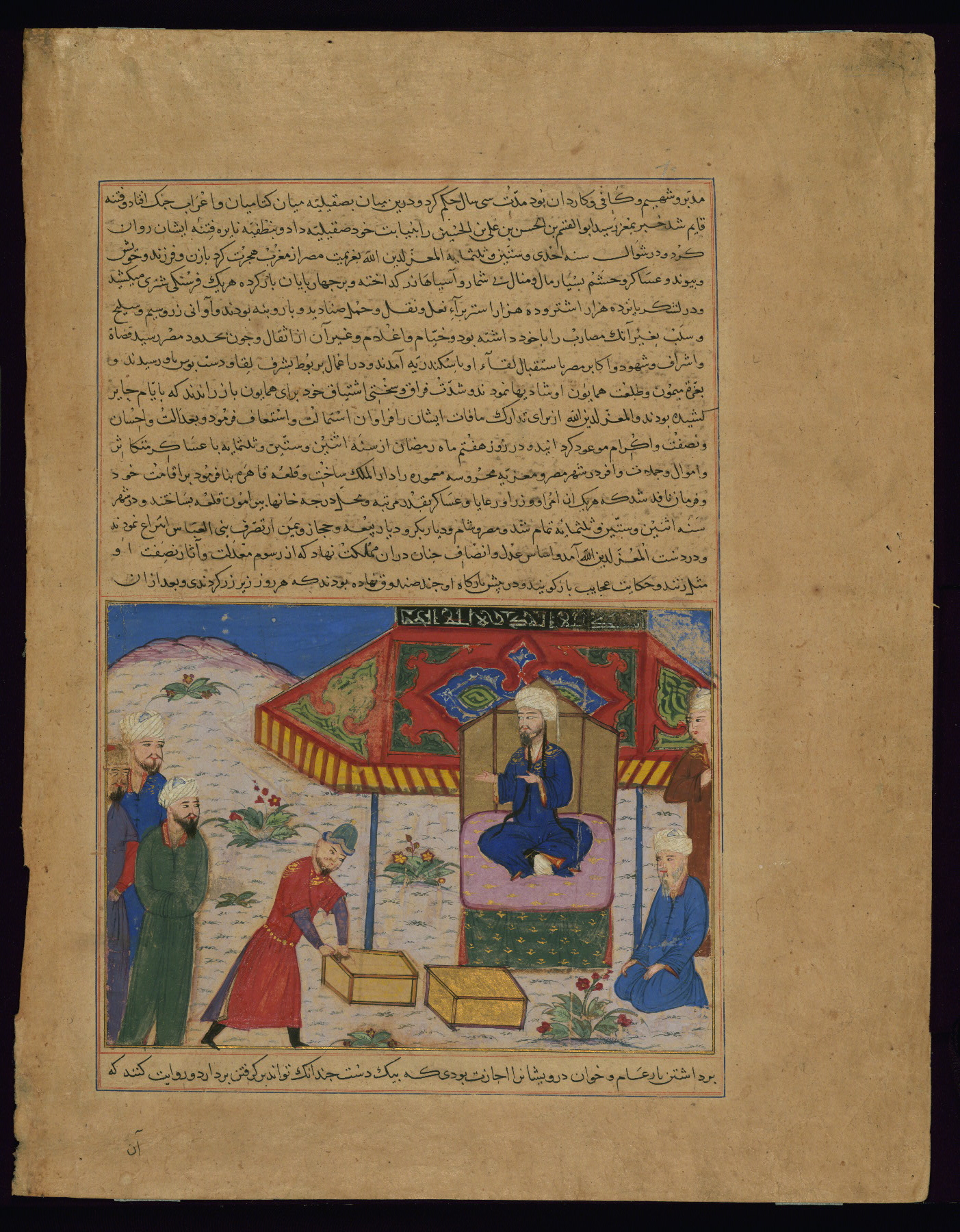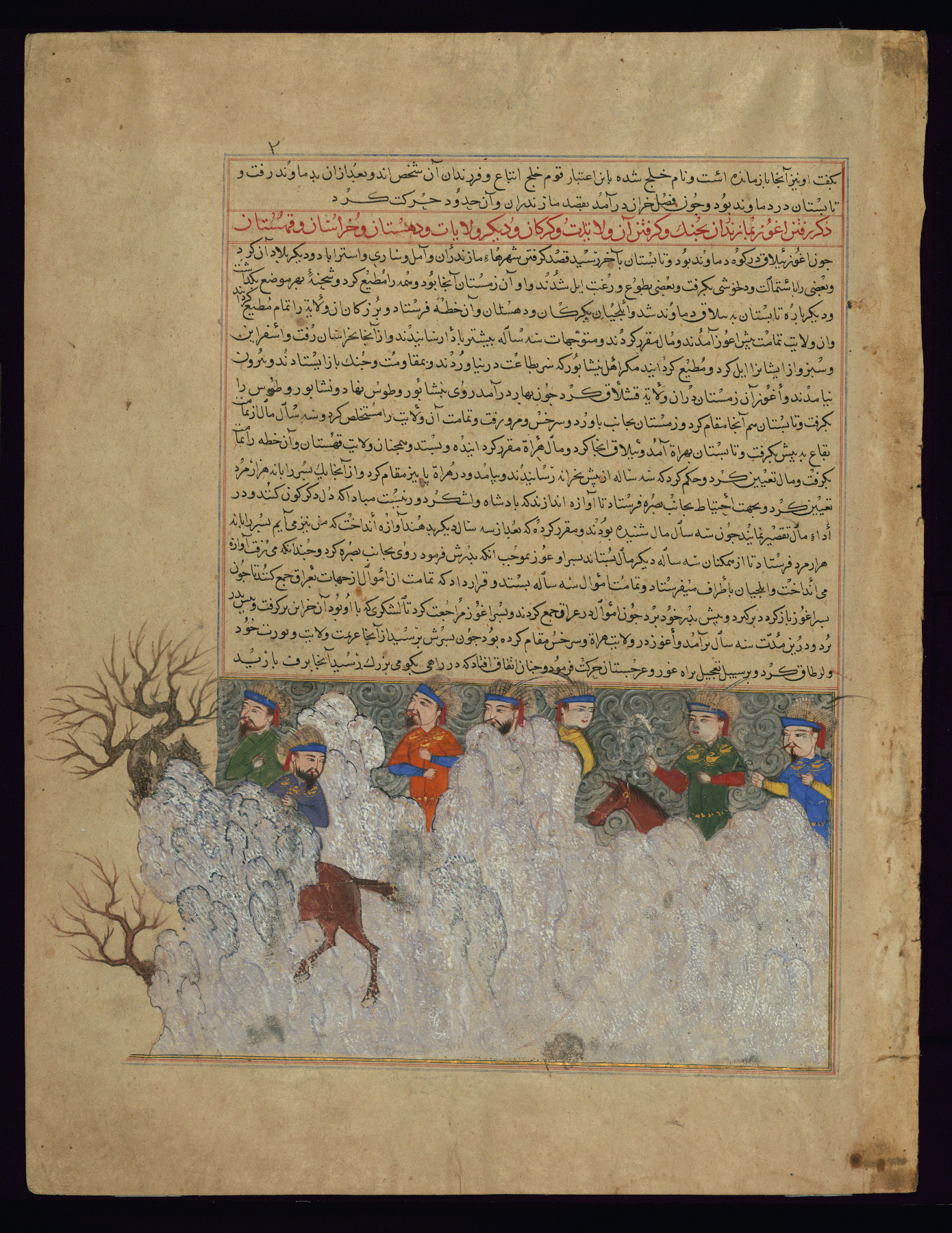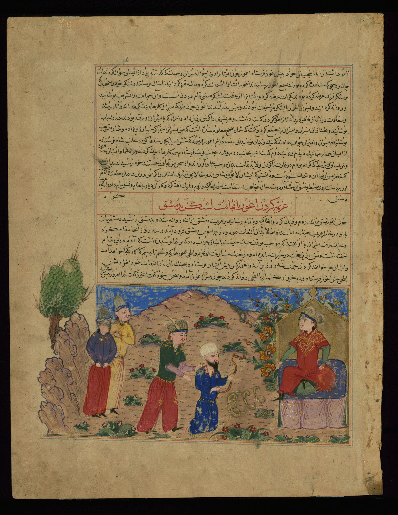 These six leaves come from a historical Timurid work entitled Majmaʿ al-tavārīkh (Collection of chronicles) by Ḥāfiẓ-i Abrū (d. 833 AH / 1430 CE), that was copied and illustrated around 829 AH / 1425 CE. Two known Timurid illustrated copies of Majmaʿ al-tavārīkh from the ninth century AH / fifteenth CE are the dispersed manuscript previously in the collection of Emile Tabbagh and Parish Watson (ca. 829 AH / 1425 CE) and a copy dated 829 AH / 1425 CE (Istanbul, H.1653). The Walters' leaves come from the former. The text is written in naskh script in black, red, and reddish-brown ink; chapter headings are written in tawqīʿ script in red ink.