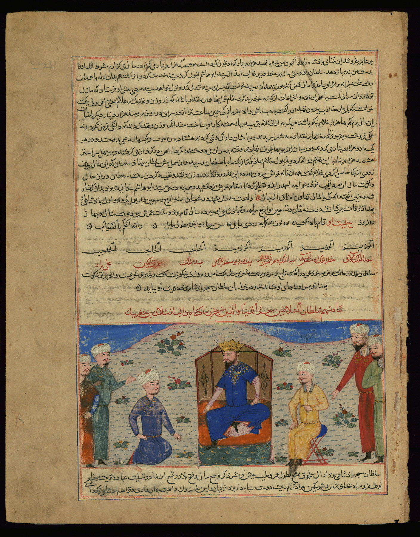 - Label: This text page is the back of the illustration Enthroned king with courtiers.