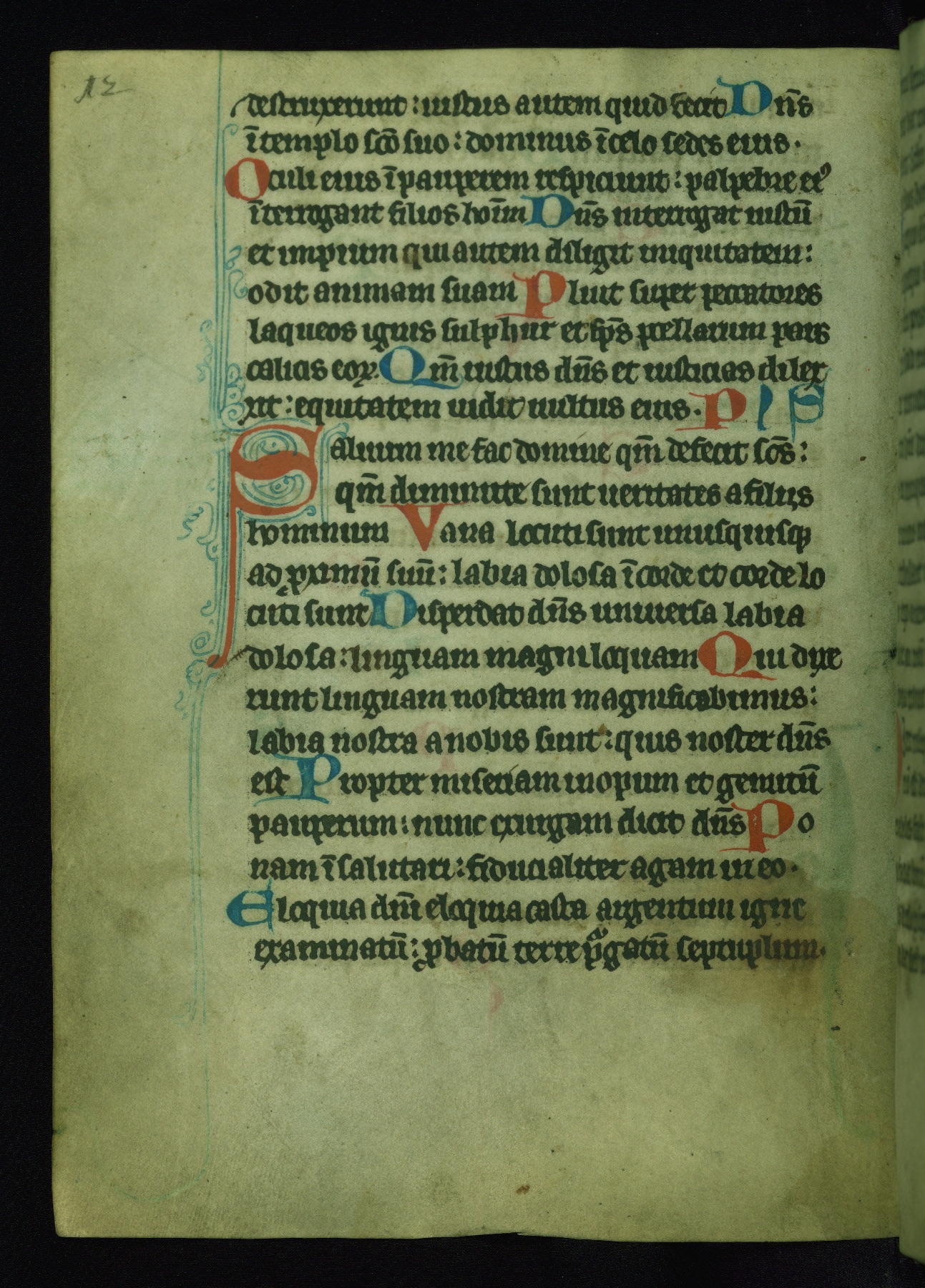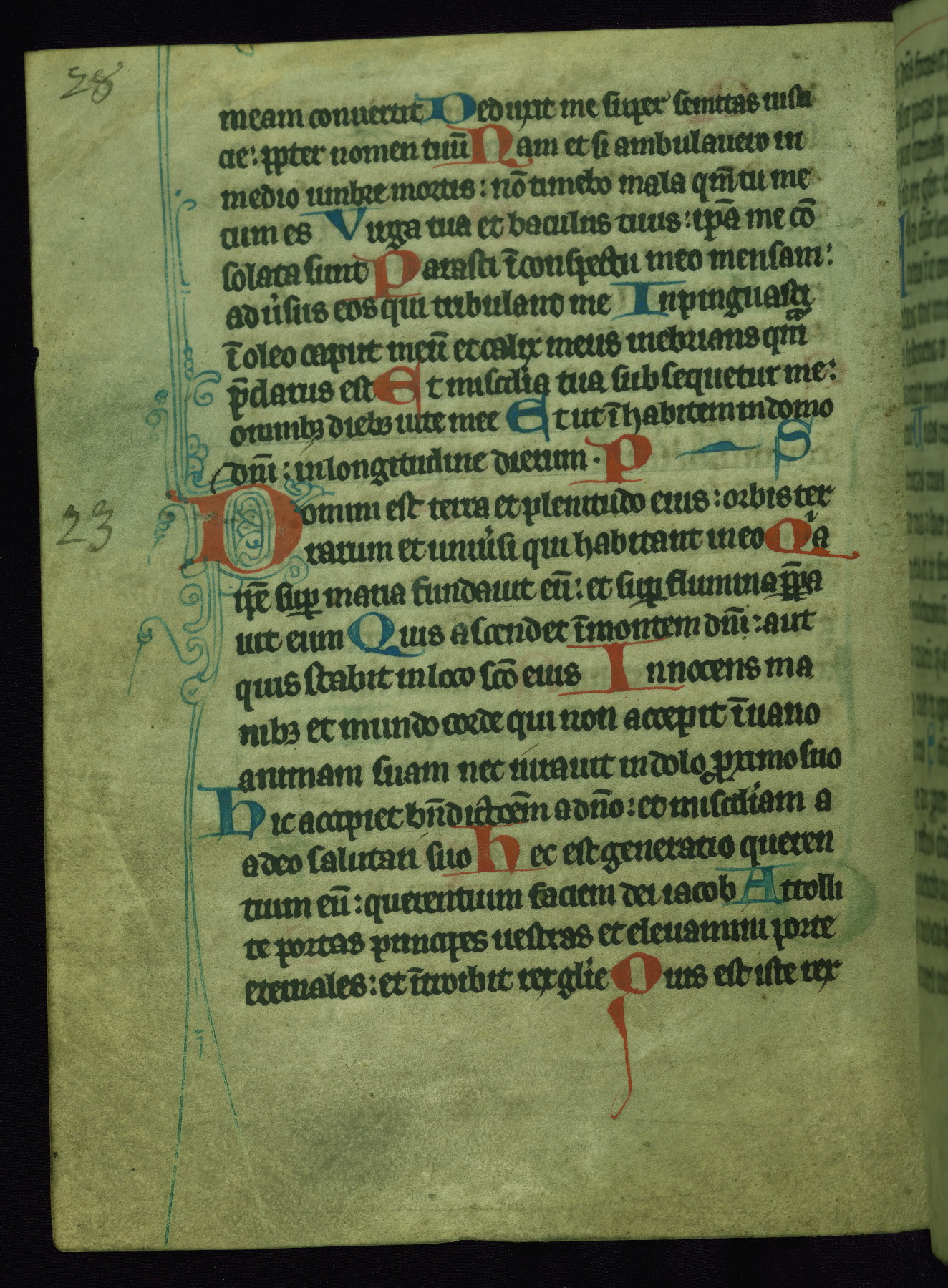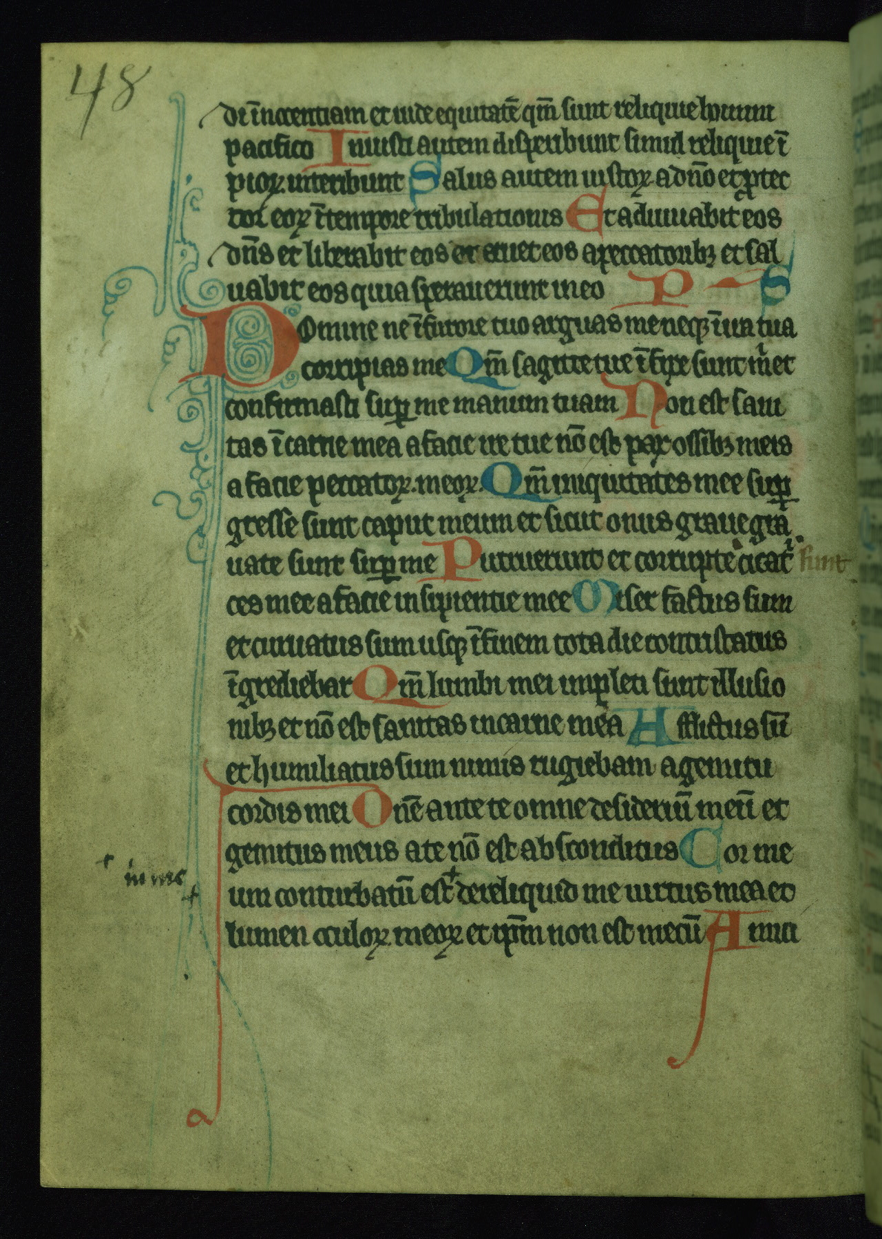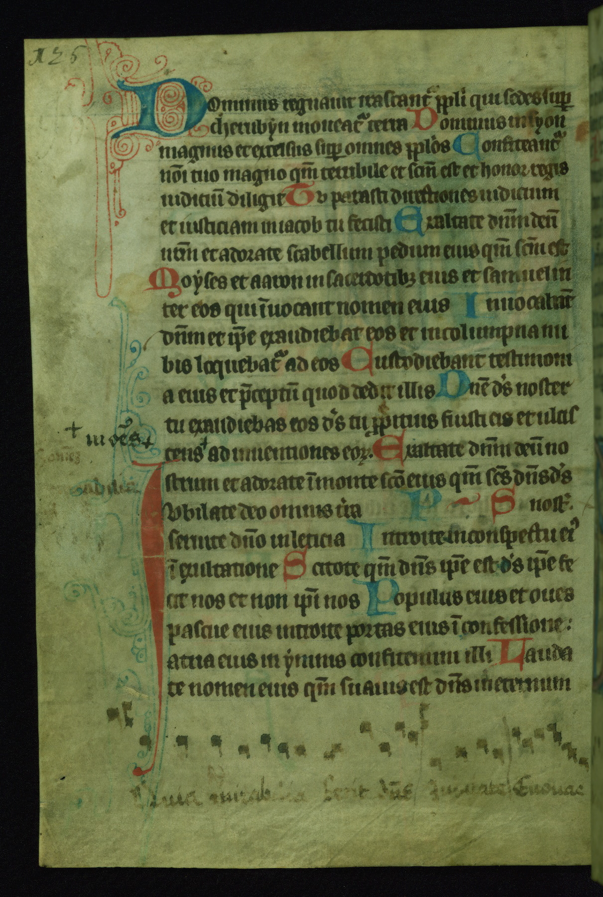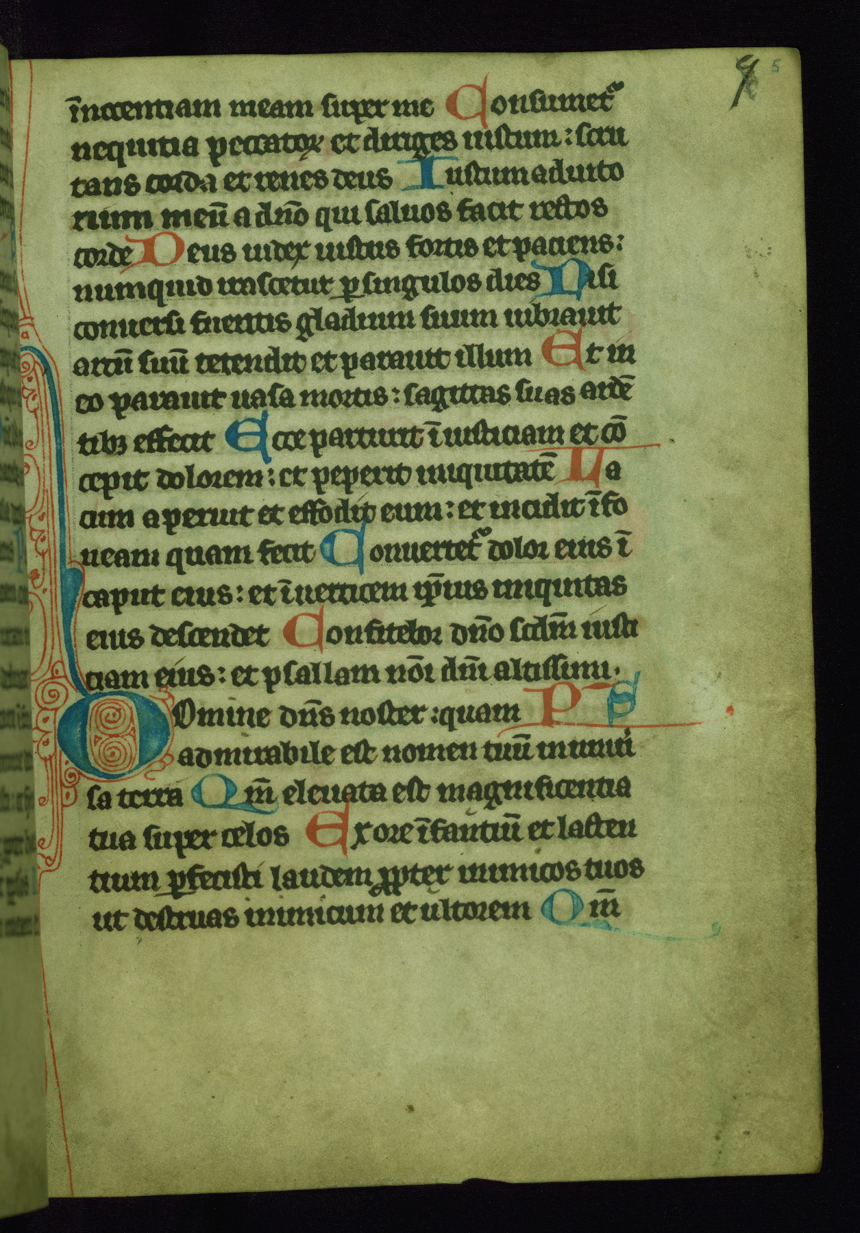 This Flemish Psalter was produced in the Hainaut region between 1265 and 1275. It was altered for Dominican use through the addition of antiphons in the margins in the late fifteenth century, at which point it was also rebound in its current inscribed leather binding. It was later among the books collected by Johann Anton Ramboux (1790-1866), a German painter and museum curator. The manuscript, which is illuminated throughout with twelve large historiated and inhabited initials, is a strong example of a group of manuscripts produced in the last quarter of the thirteenth century that combined the artistic styles of Hainaut and Liège, other examples including Paris, B.N. Lat. 1077, Biblioteca apostolica vaticana, BBR Ms. IV-1066, and Princeton University Art Museum 57.189.