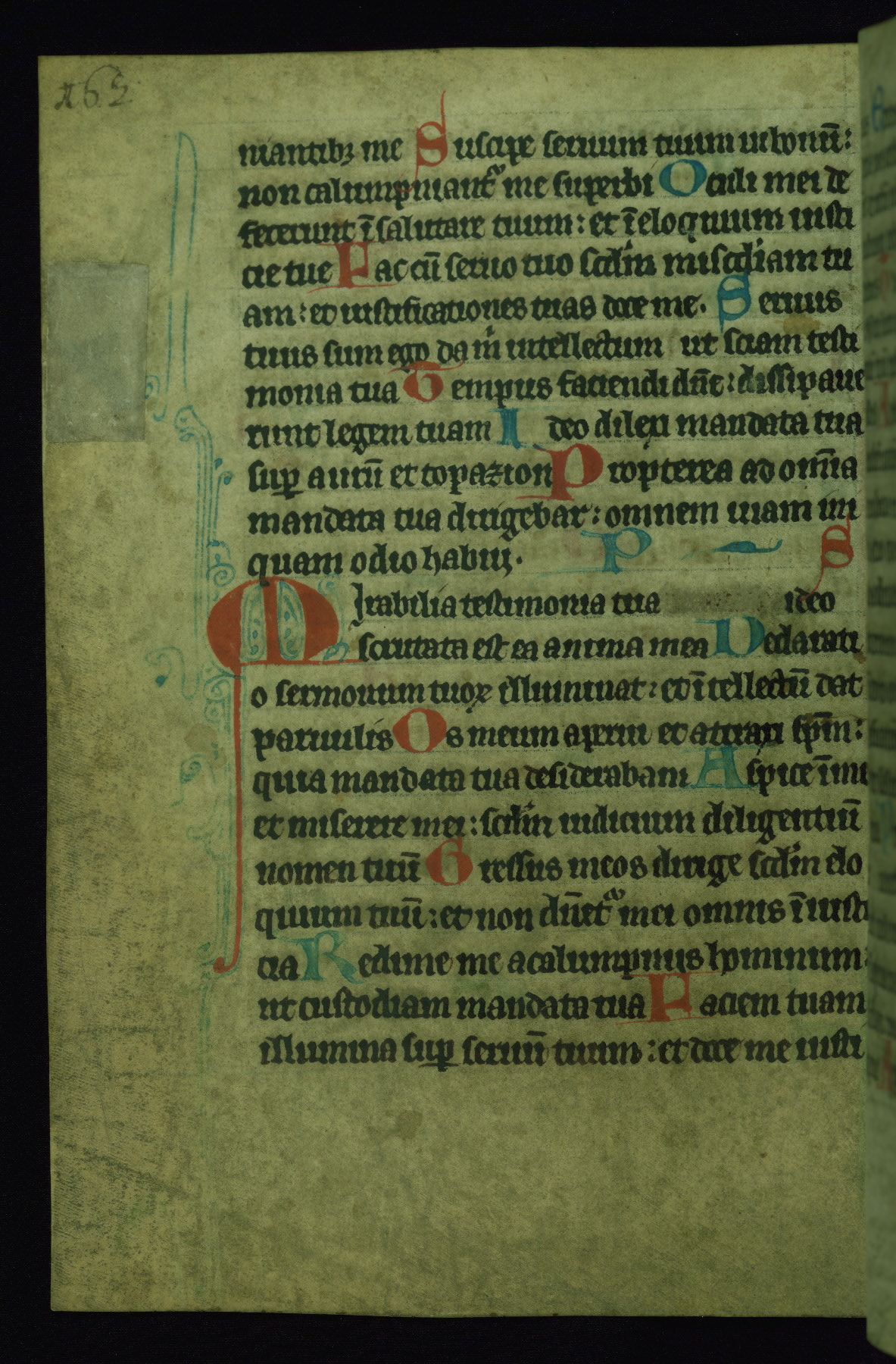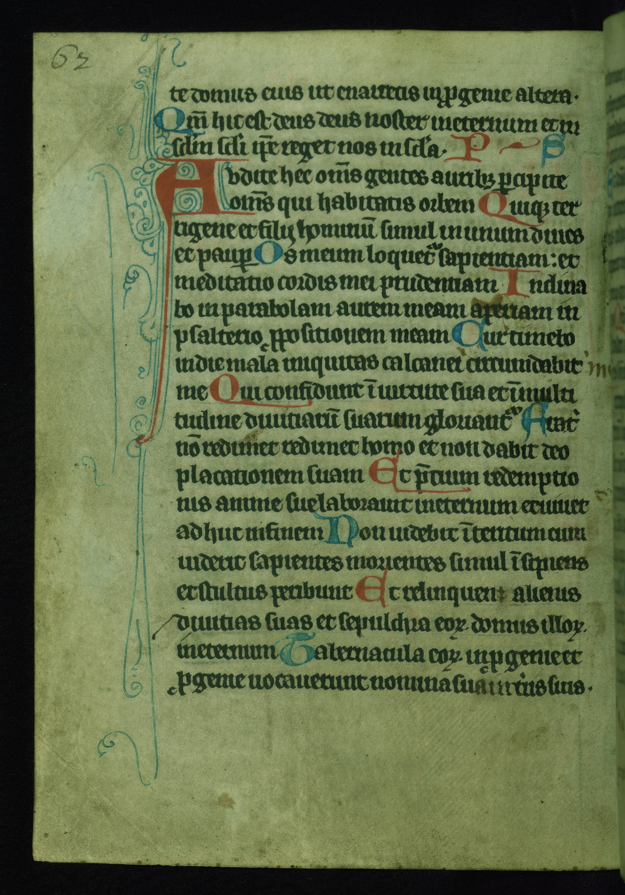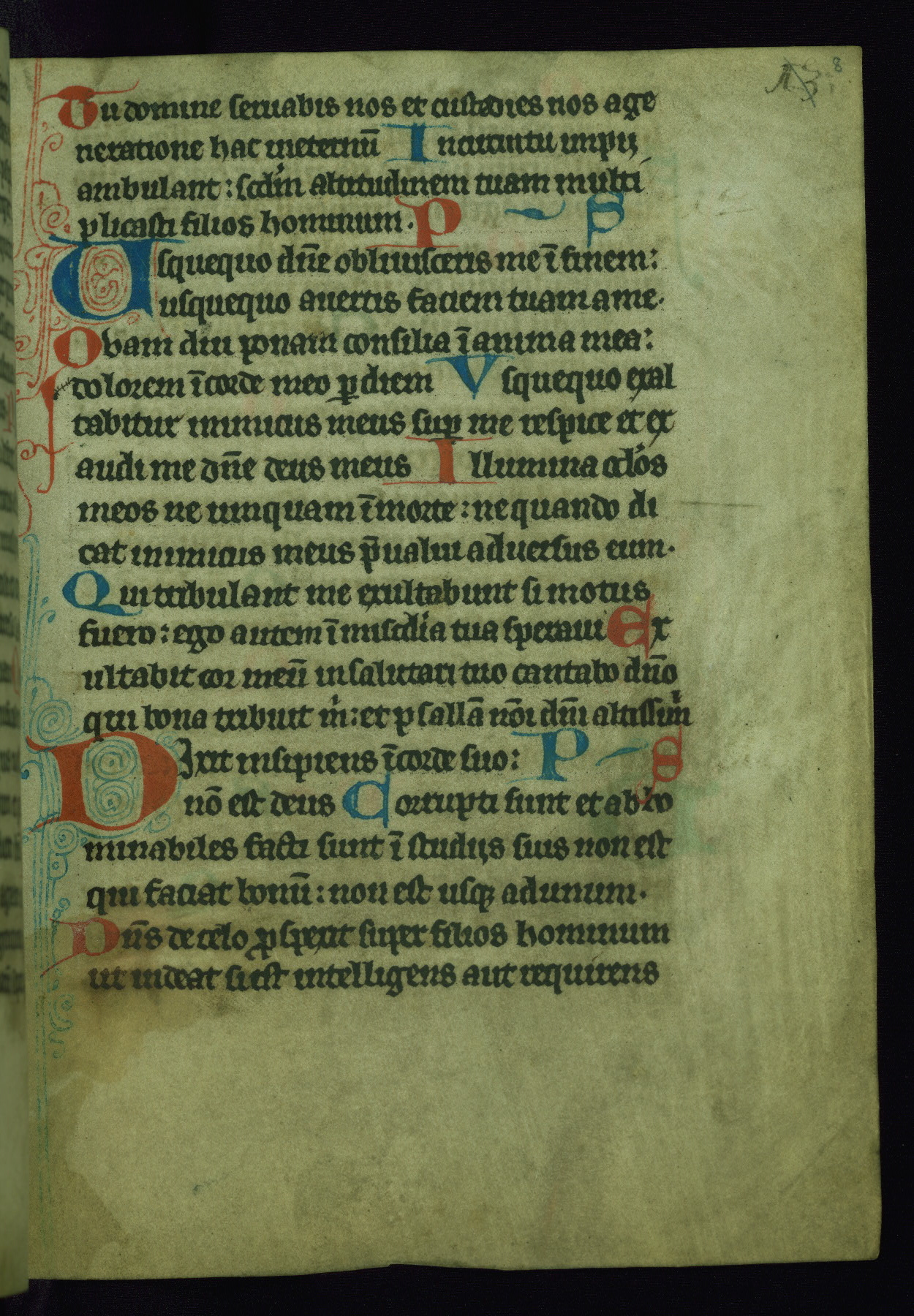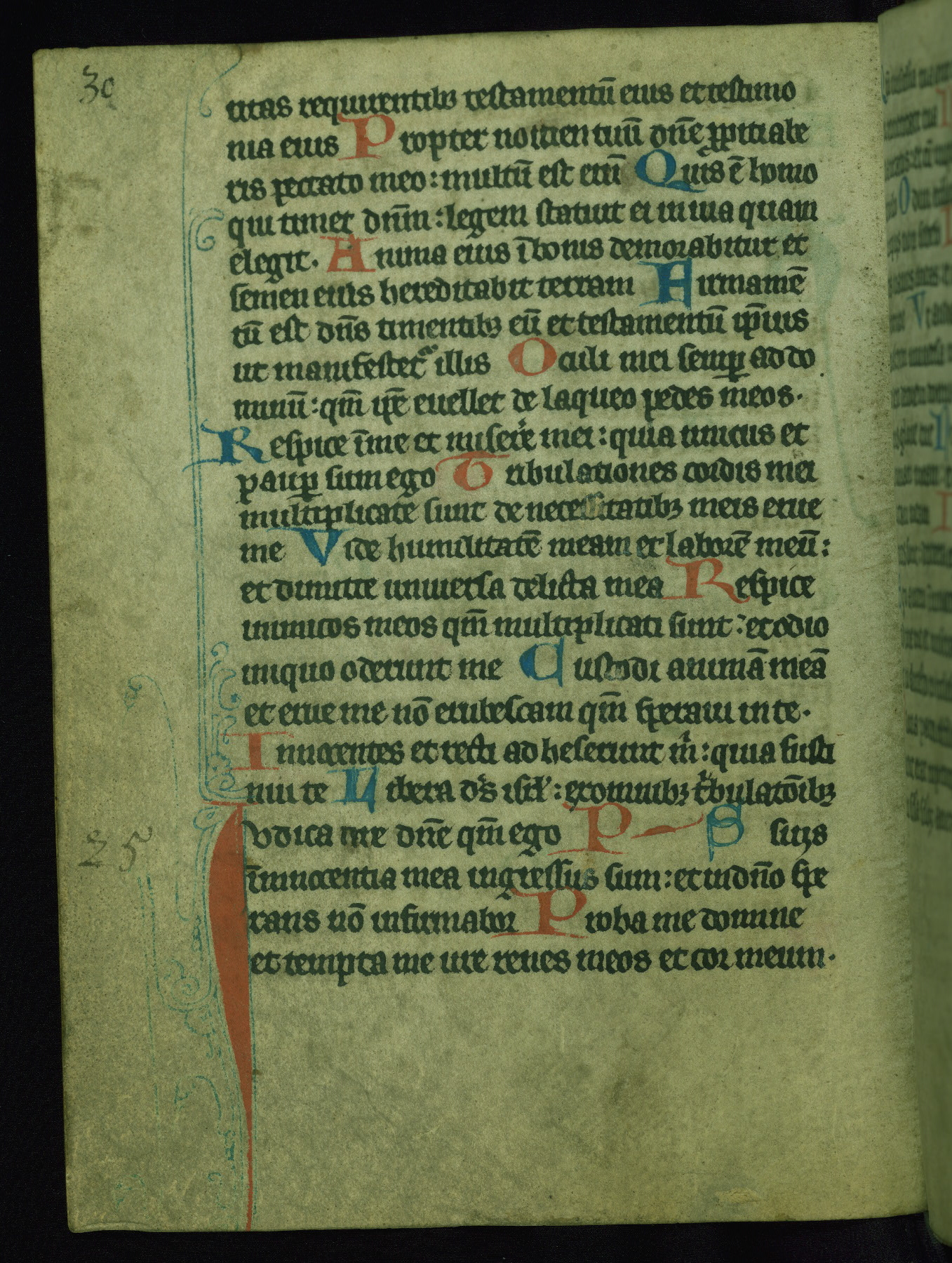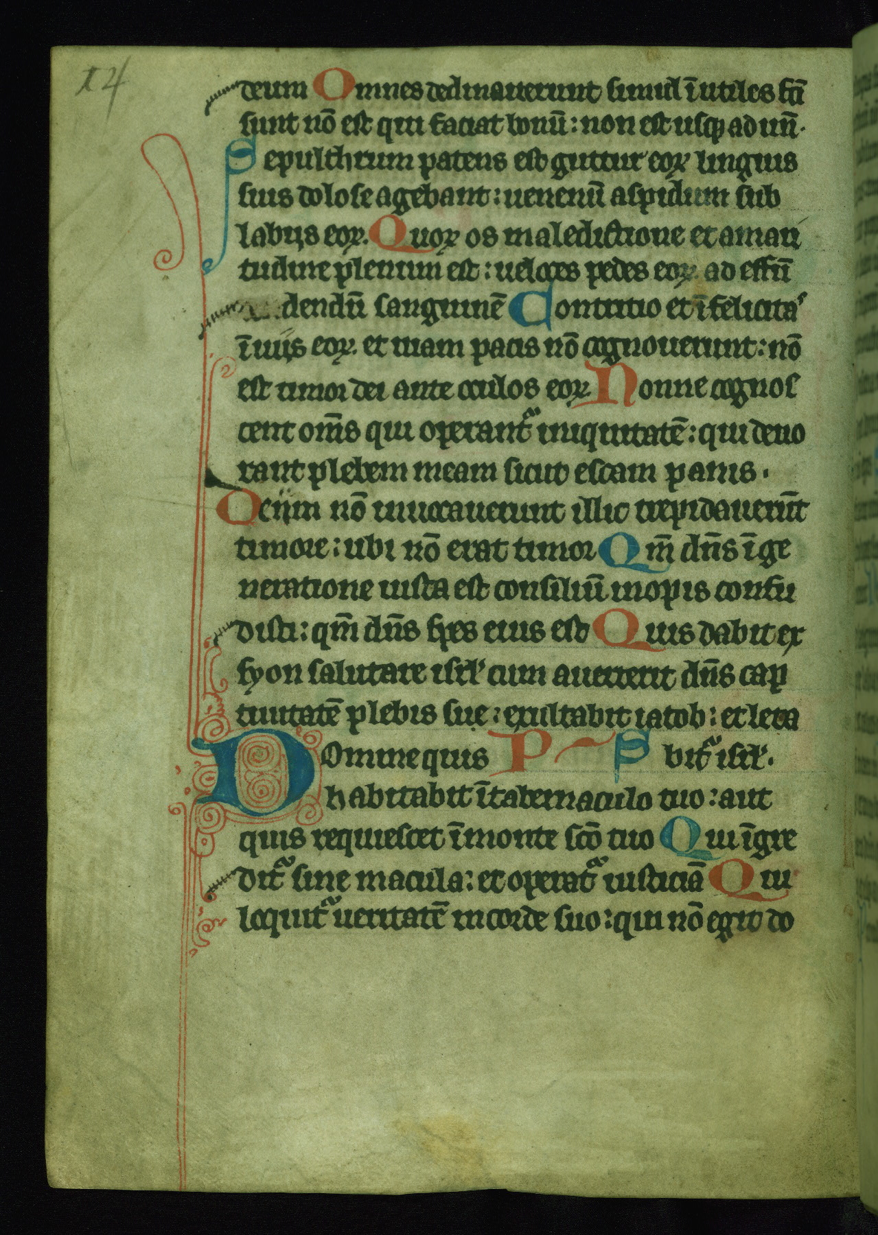 This Flemish Psalter was produced in the Hainaut region between 1265 and 1275. It was altered for Dominican use through the addition of antiphons in the margins in the late fifteenth century, at which point it was also rebound in its current inscribed leather binding. It was later among the books collected by Johann Anton Ramboux (1790-1866), a German painter and museum curator. The manuscript, which is illuminated throughout with twelve large historiated and inhabited initials, is a strong example of a group of manuscripts produced in the last quarter of the thirteenth century that combined the artistic styles of Hainaut and Liège, other examples including Paris, B.N. Lat. 1077, Biblioteca apostolica vaticana, BBR Ms. IV-1066, and Princeton University Art Museum 57.189.