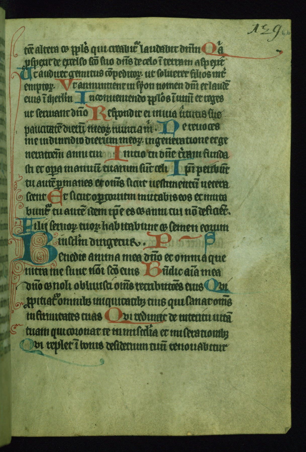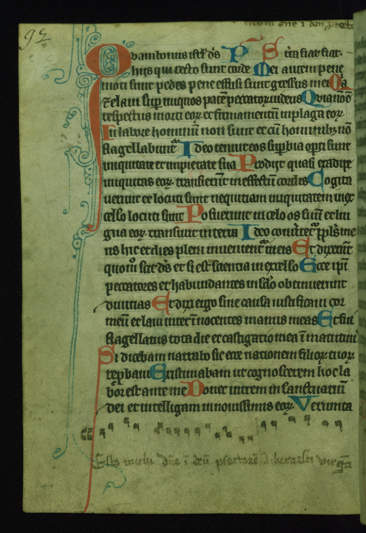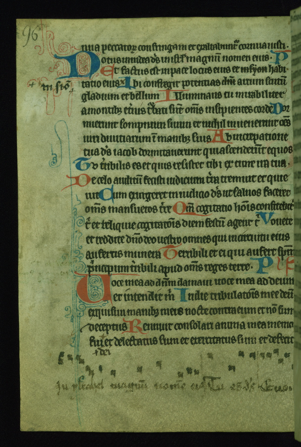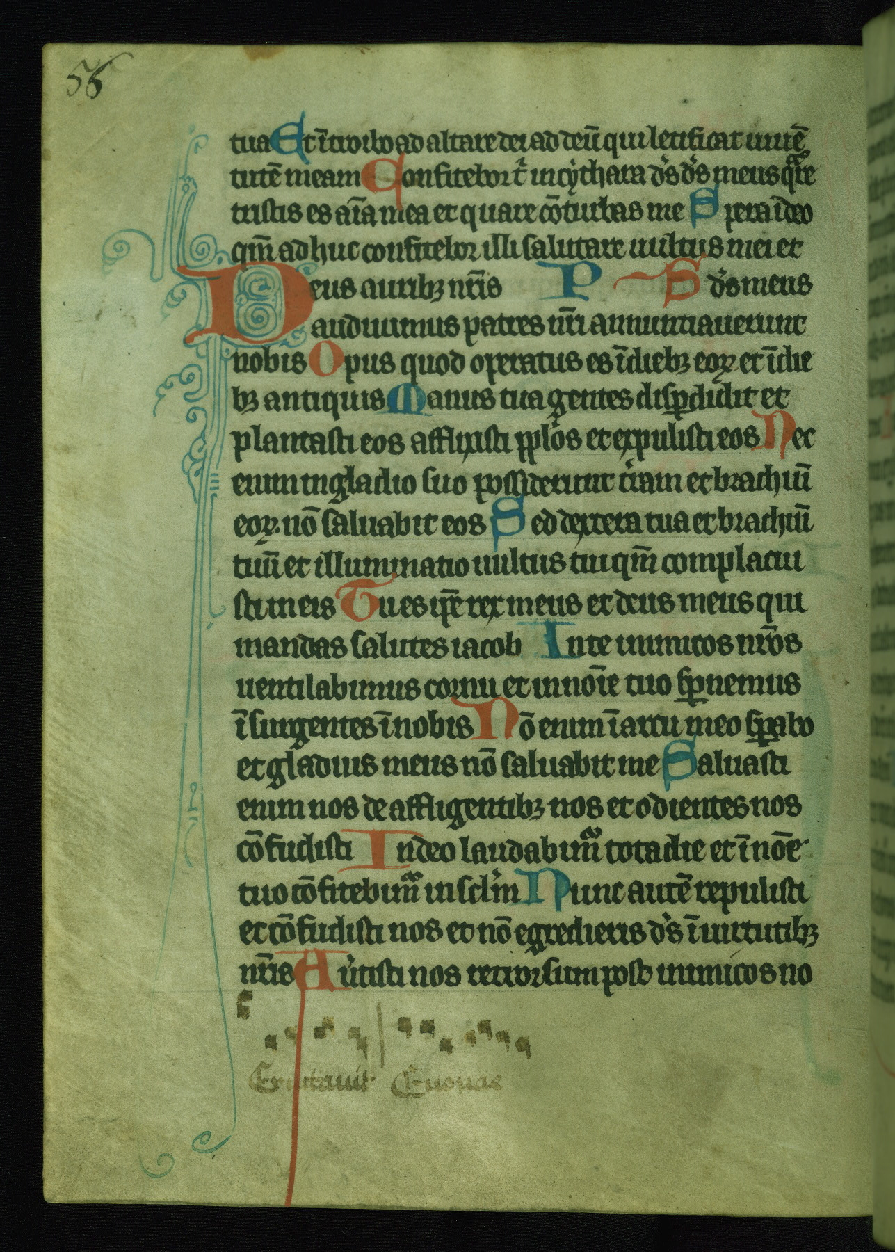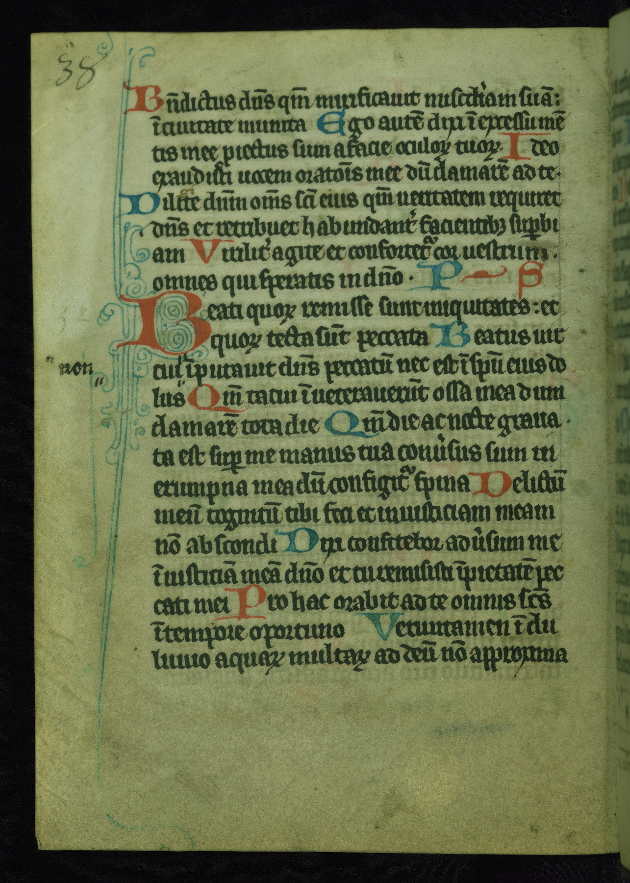 This Flemish Psalter was produced in the Hainaut region between 1265 and 1275. It was altered for Dominican use through the addition of antiphons in the margins in the late fifteenth century, at which point it was also rebound in its current inscribed leather binding. It was later among the books collected by Johann Anton Ramboux (1790-1866), a German painter and museum curator. The manuscript, which is illuminated throughout with twelve large historiated and inhabited initials, is a strong example of a group of manuscripts produced in the last quarter of the thirteenth century that combined the artistic styles of Hainaut and Liège, other examples including Paris, B.N. Lat. 1077, Biblioteca apostolica vaticana, BBR Ms. IV-1066, and Princeton University Art Museum 57.189.