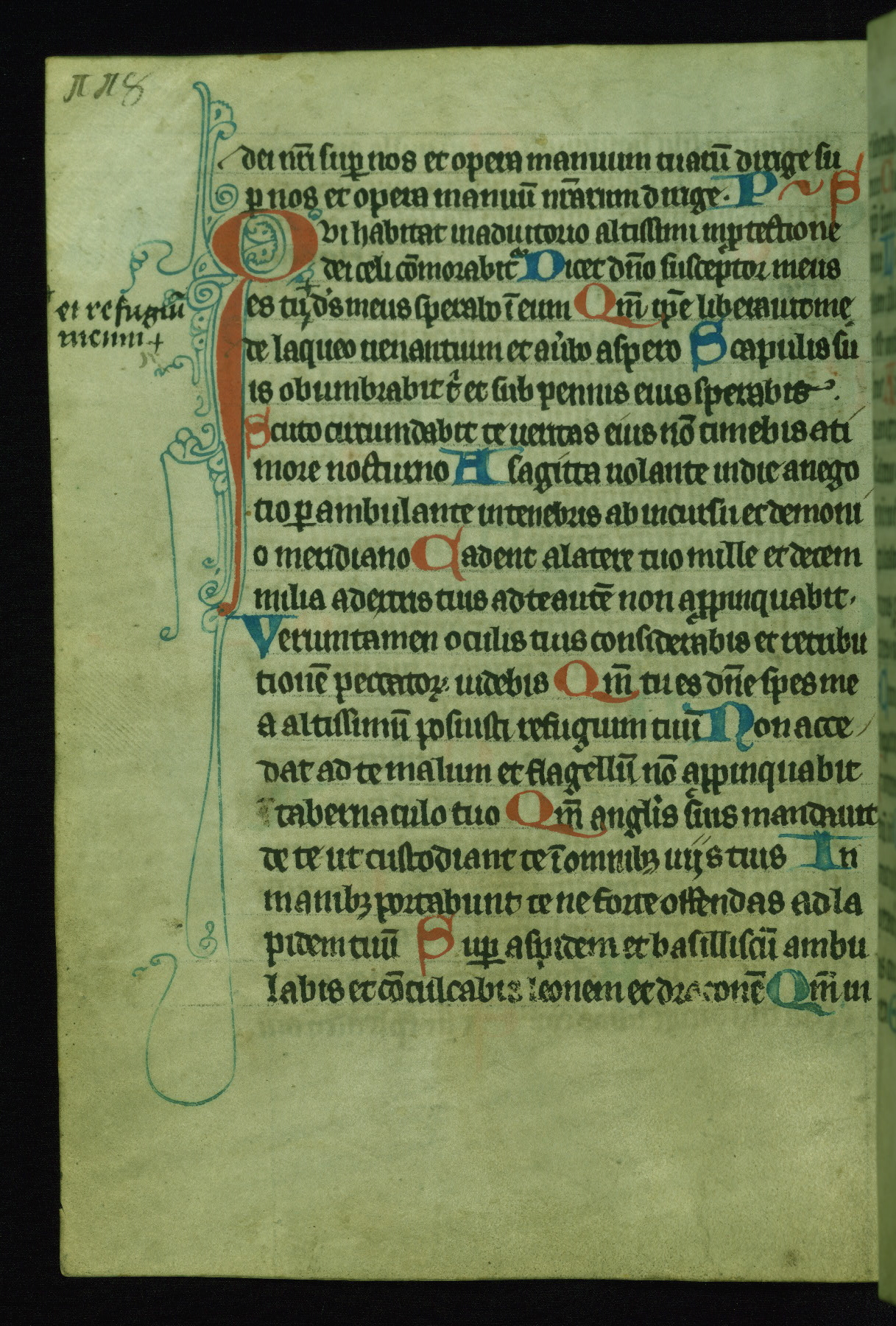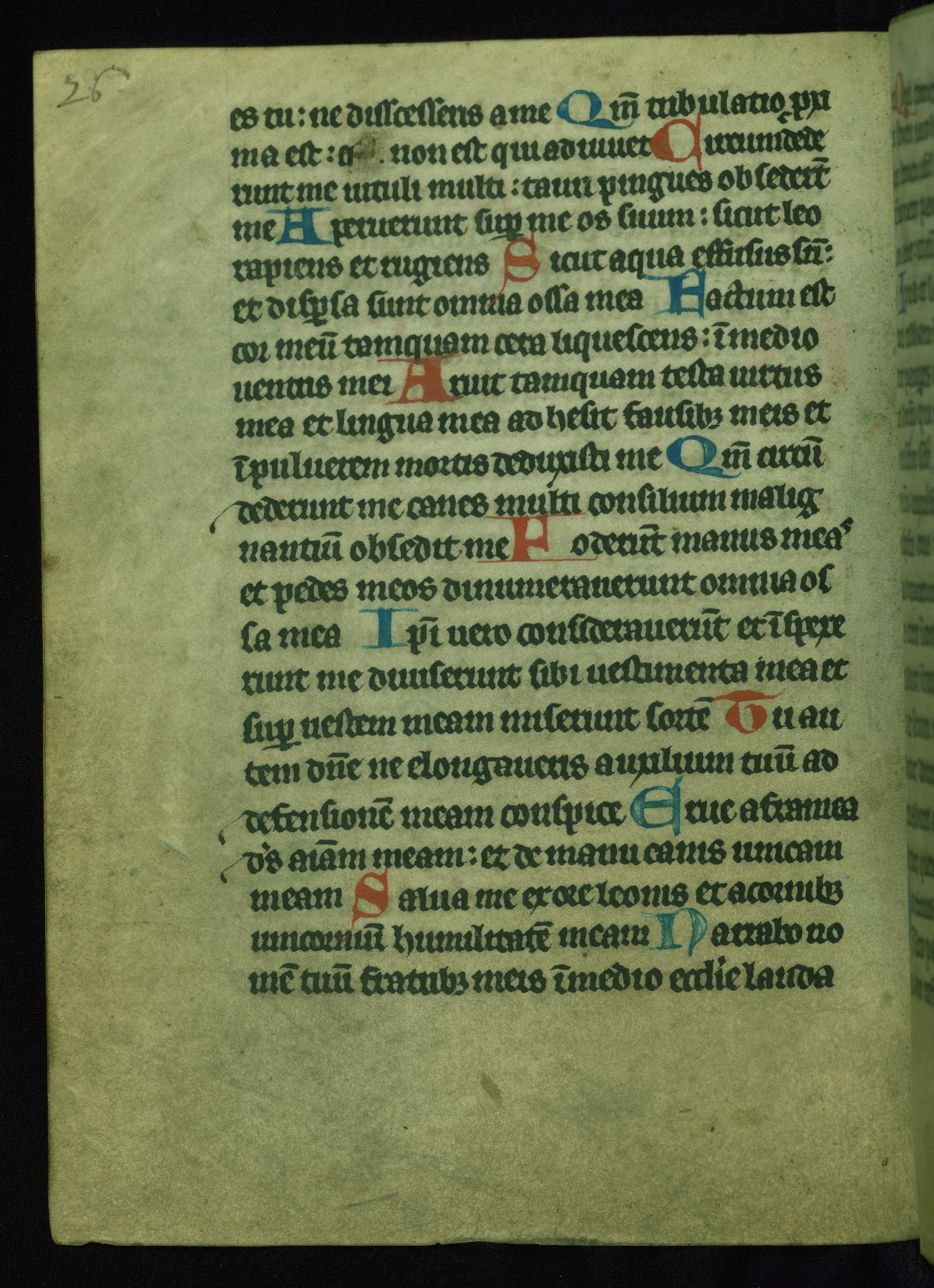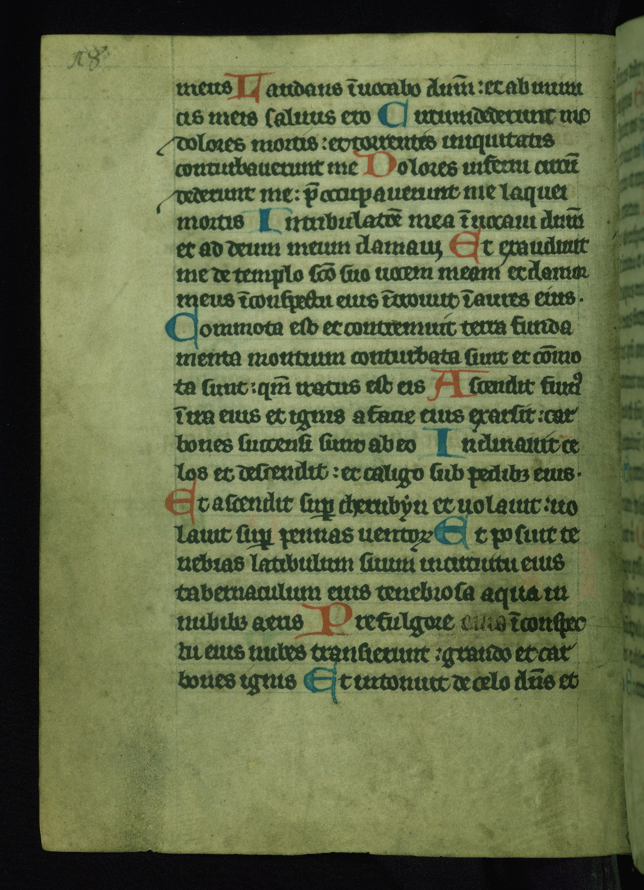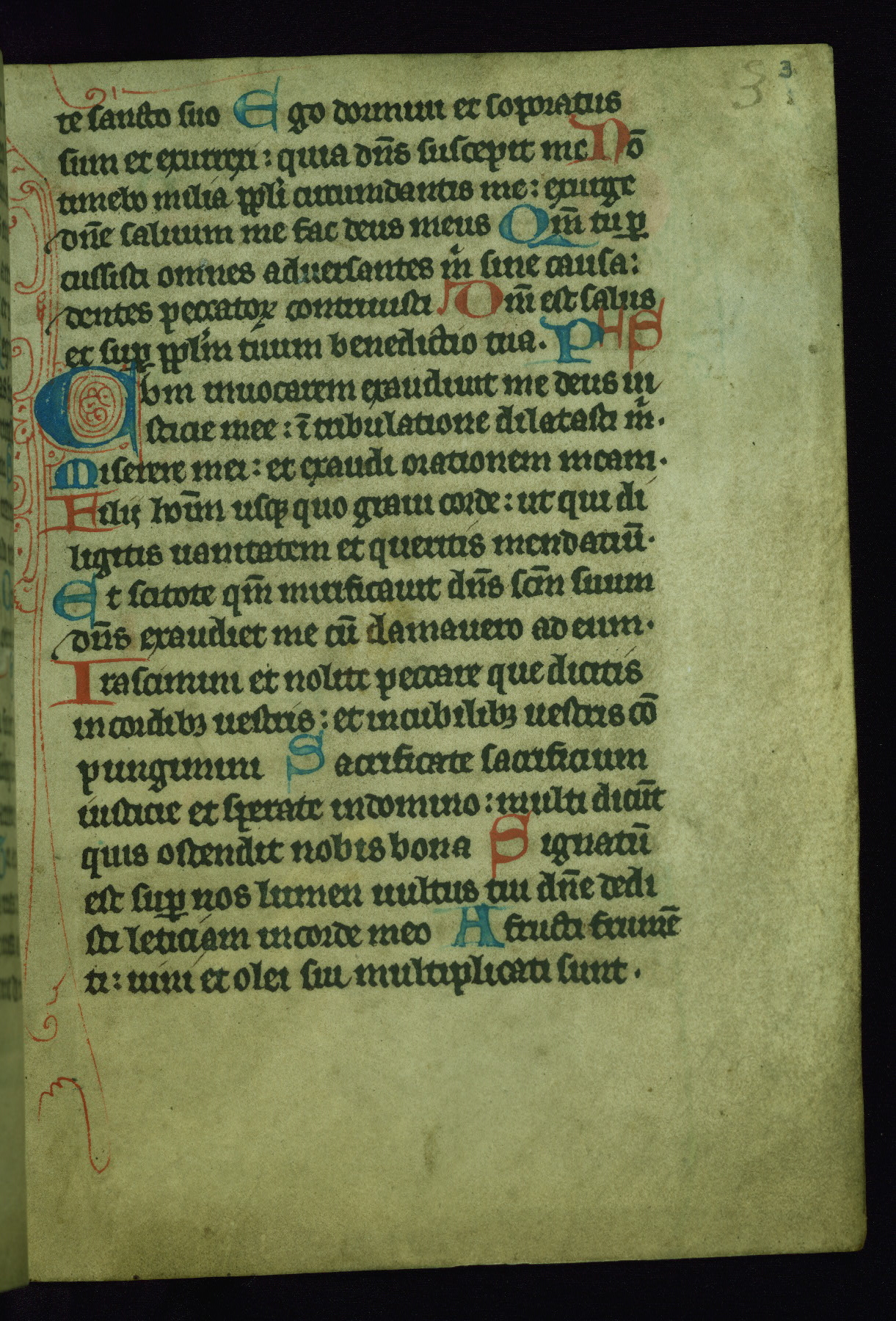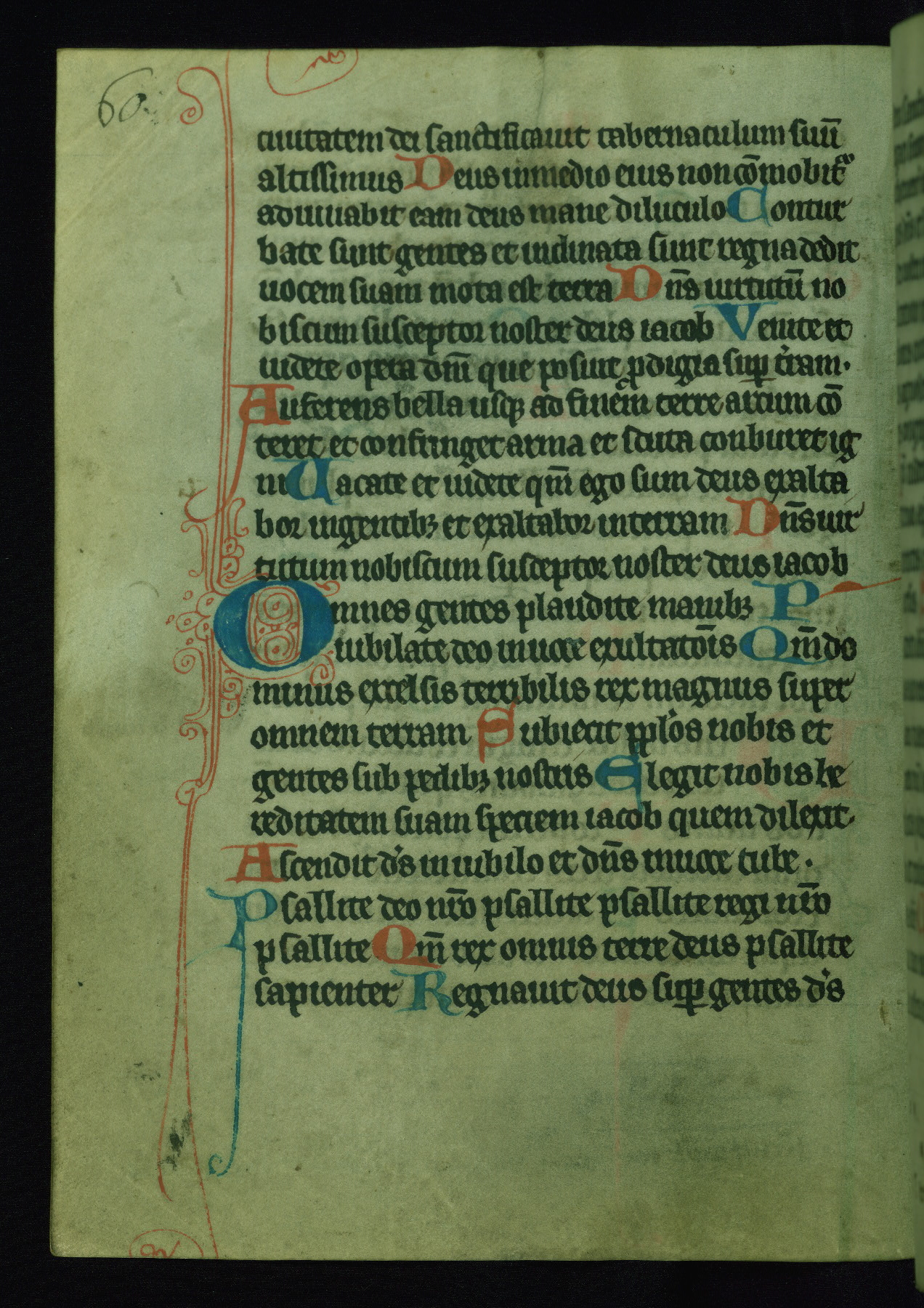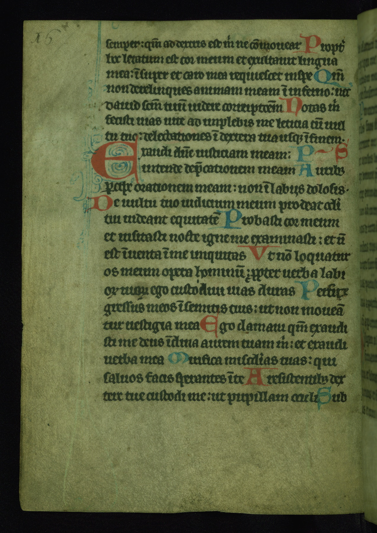 This Flemish Psalter was produced in the Hainaut region between 1265 and 1275. It was altered for Dominican use through the addition of antiphons in the margins in the late fifteenth century, at which point it was also rebound in its current inscribed leather binding. It was later among the books collected by Johann Anton Ramboux (1790-1866), a German painter and museum curator. The manuscript, which is illuminated throughout with twelve large historiated and inhabited initials, is a strong example of a group of manuscripts produced in the last quarter of the thirteenth century that combined the artistic styles of Hainaut and Liège, other examples including Paris, B.N. Lat. 1077, Biblioteca apostolica vaticana, BBR Ms. IV-1066, and Princeton University Art Museum 57.189.