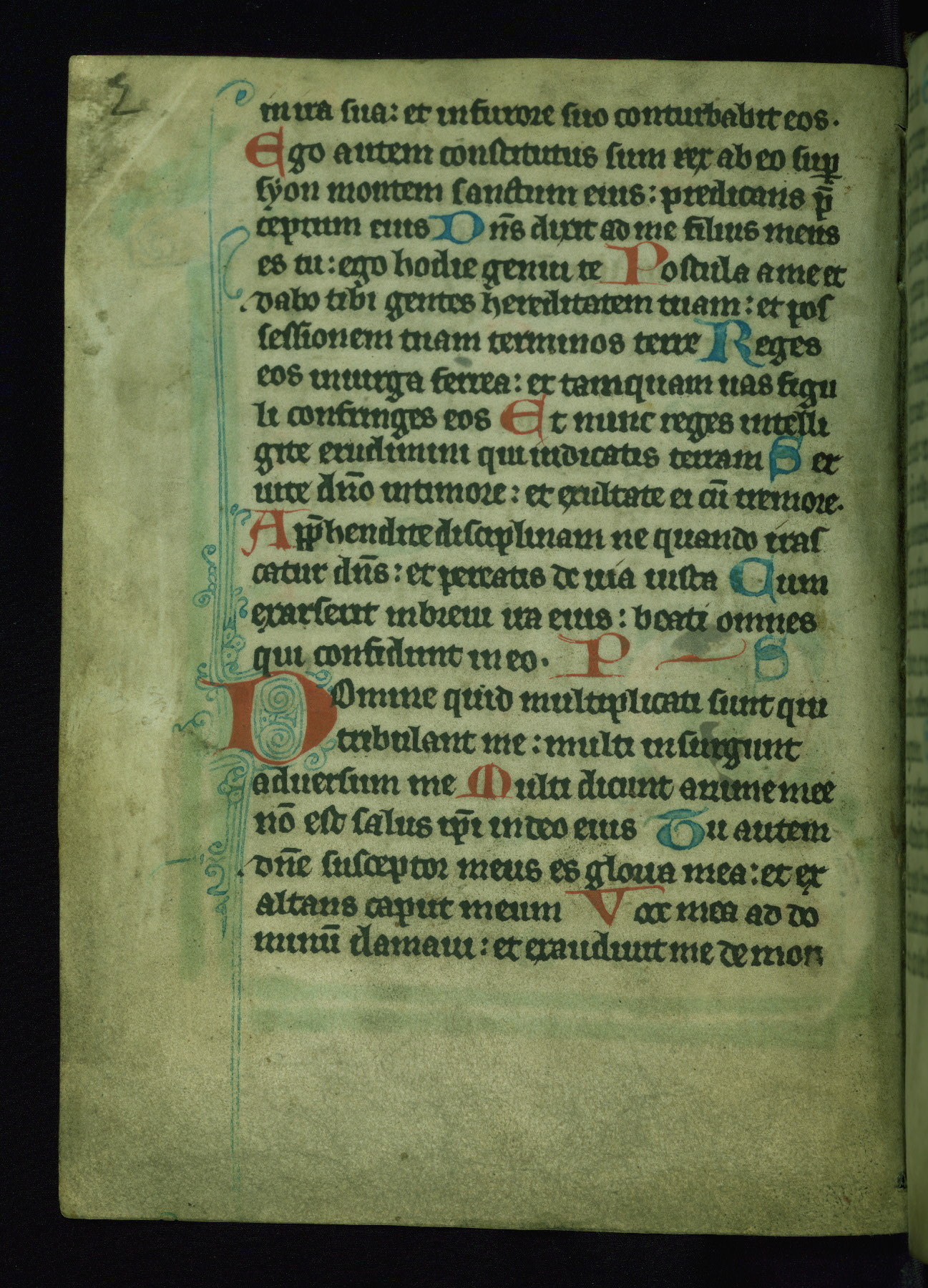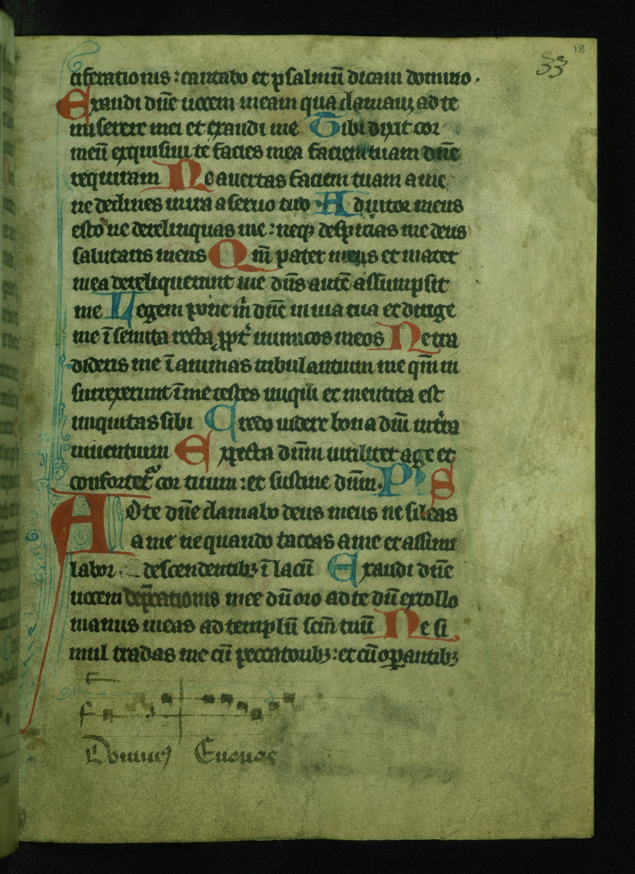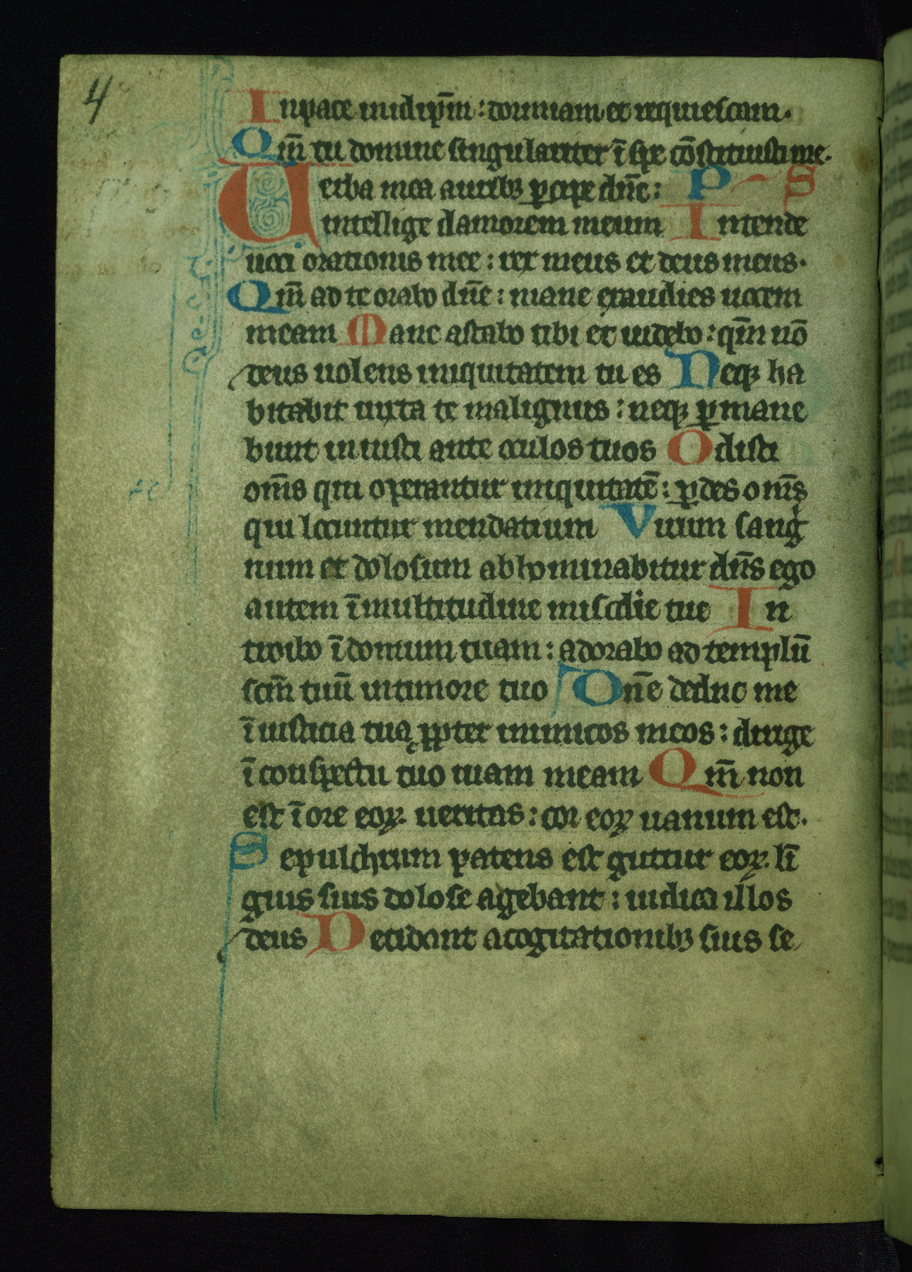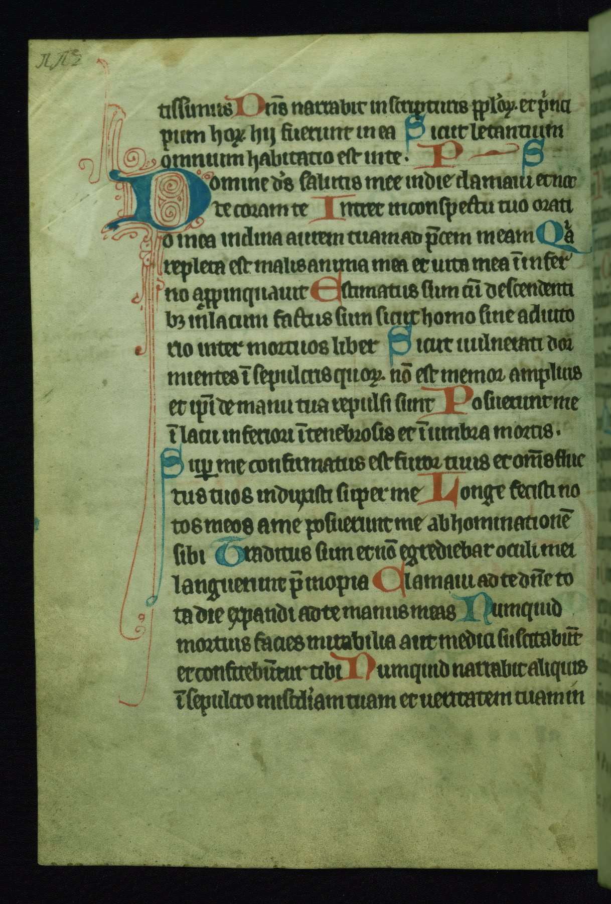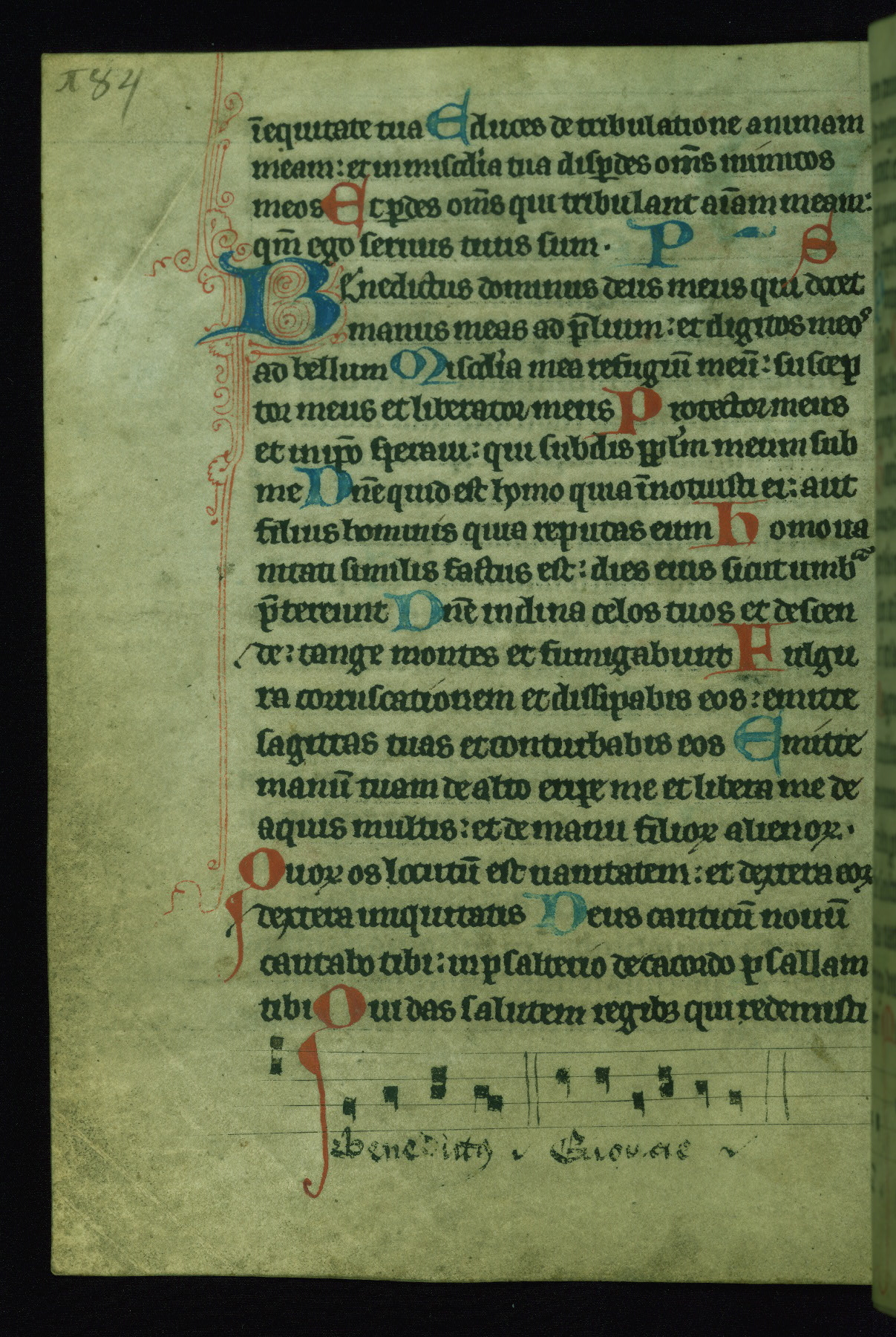 This Flemish Psalter was produced in the Hainaut region between 1265 and 1275. It was altered for Dominican use through the addition of antiphons in the margins in the late fifteenth century, at which point it was also rebound in its current inscribed leather binding. It was later among the books collected by Johann Anton Ramboux (1790-1866), a German painter and museum curator. The manuscript, which is illuminated throughout with twelve large historiated and inhabited initials, is a strong example of a group of manuscripts produced in the last quarter of the thirteenth century that combined the artistic styles of Hainaut and Liège, other examples including Paris, B.N. Lat. 1077, Biblioteca apostolica vaticana, BBR Ms. IV-1066, and Princeton University Art Museum 57.189.