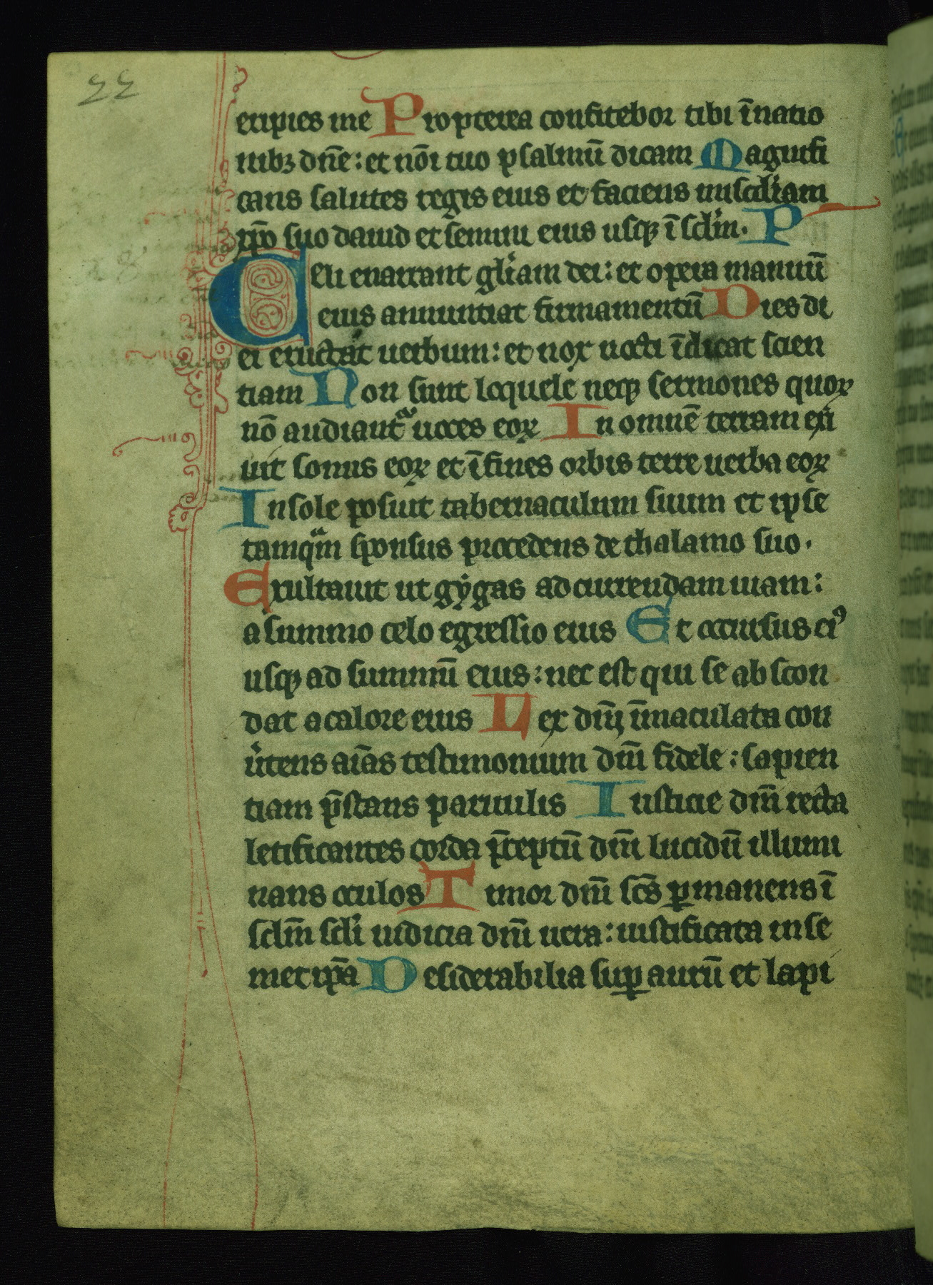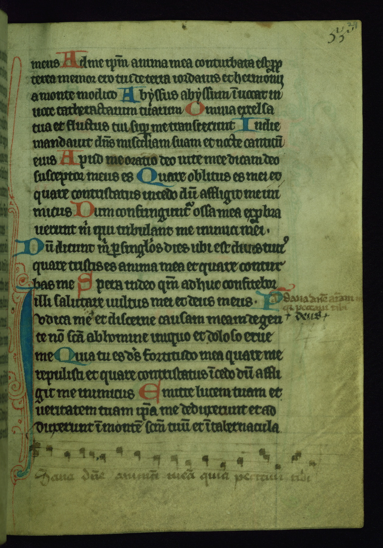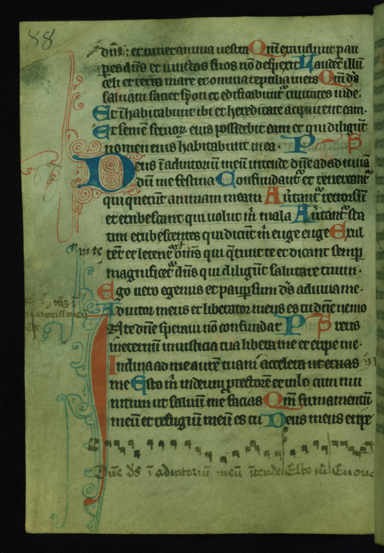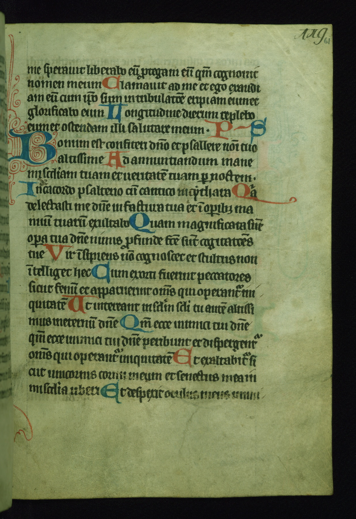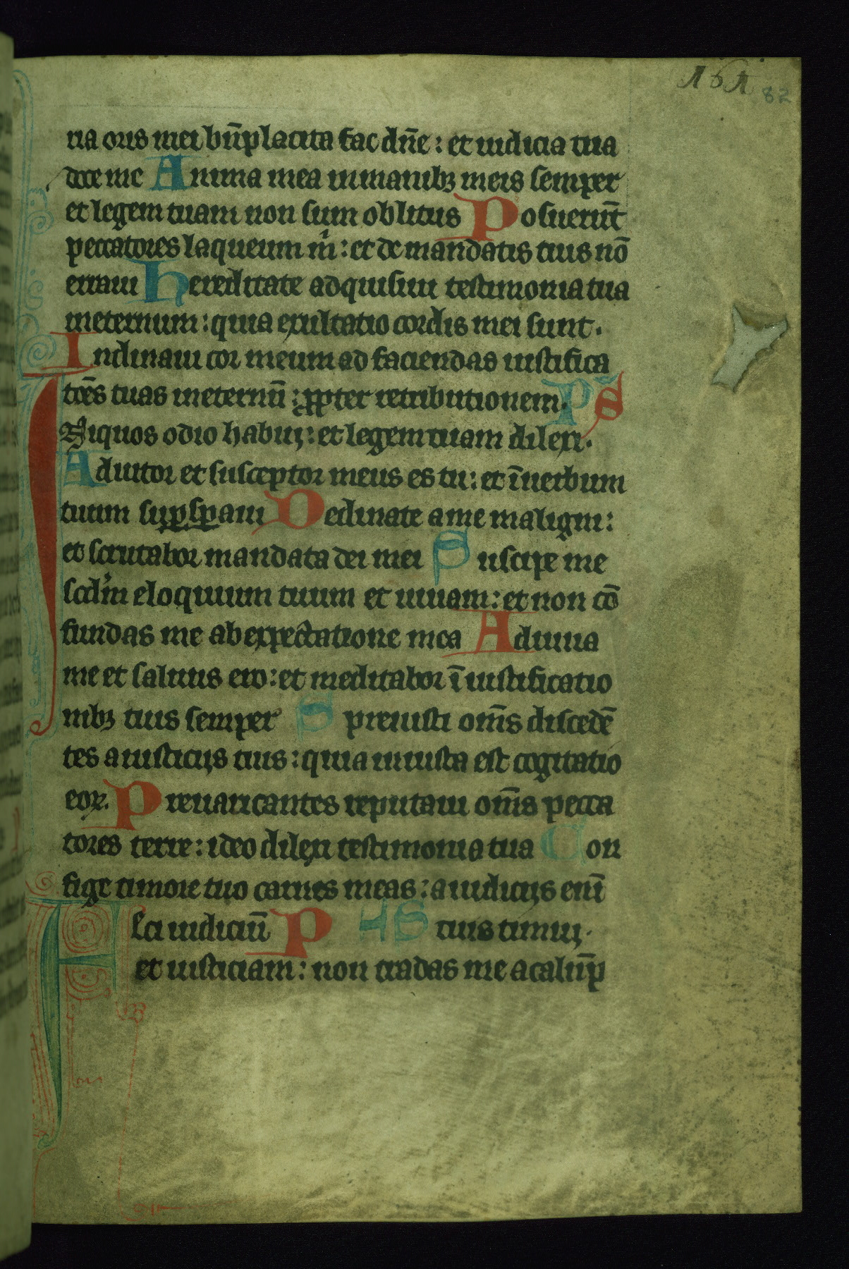 This Flemish Psalter was produced in the Hainaut region between 1265 and 1275. It was altered for Dominican use through the addition of antiphons in the margins in the late fifteenth century, at which point it was also rebound in its current inscribed leather binding. It was later among the books collected by Johann Anton Ramboux (1790-1866), a German painter and museum curator. The manuscript, which is illuminated throughout with twelve large historiated and inhabited initials, is a strong example of a group of manuscripts produced in the last quarter of the thirteenth century that combined the artistic styles of Hainaut and Liège, other examples including Paris, B.N. Lat. 1077, Biblioteca apostolica vaticana, BBR Ms. IV-1066, and Princeton University Art Museum 57.189.