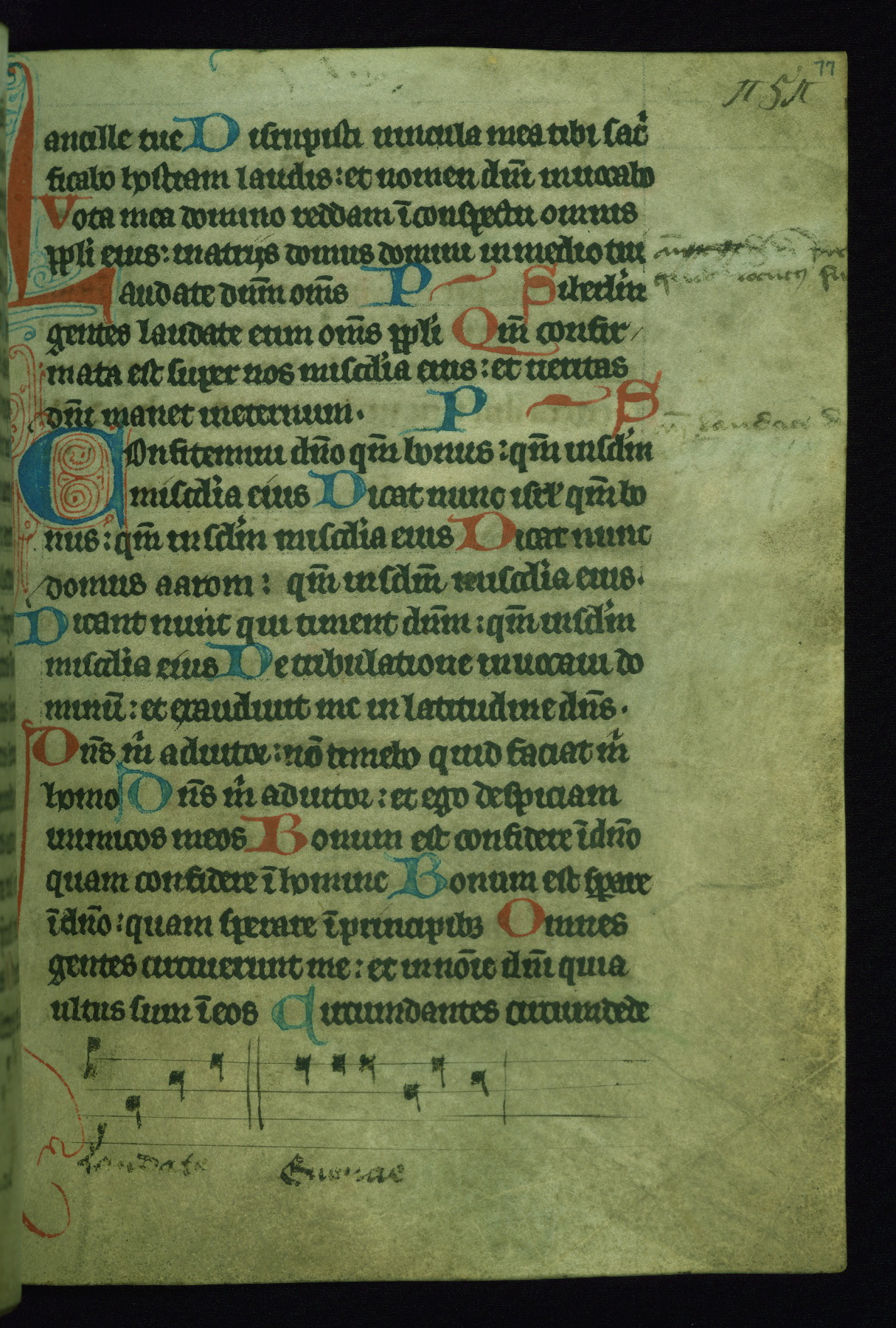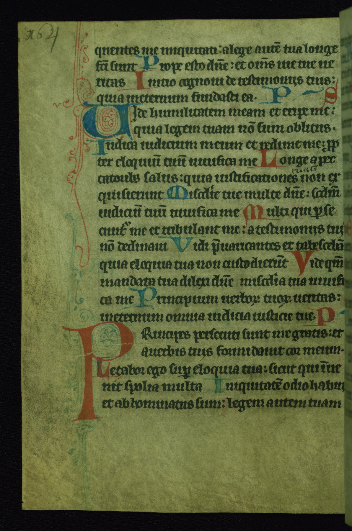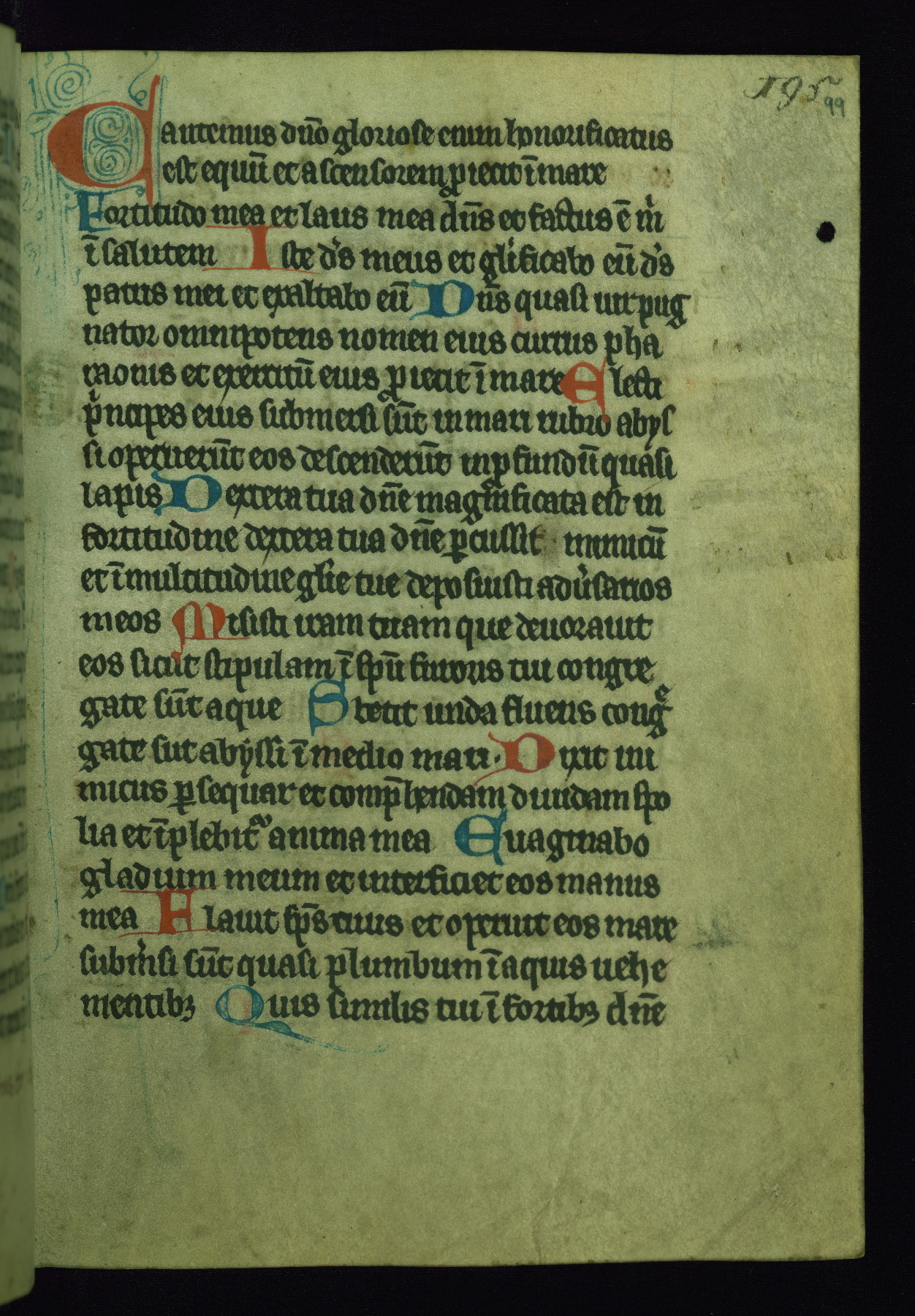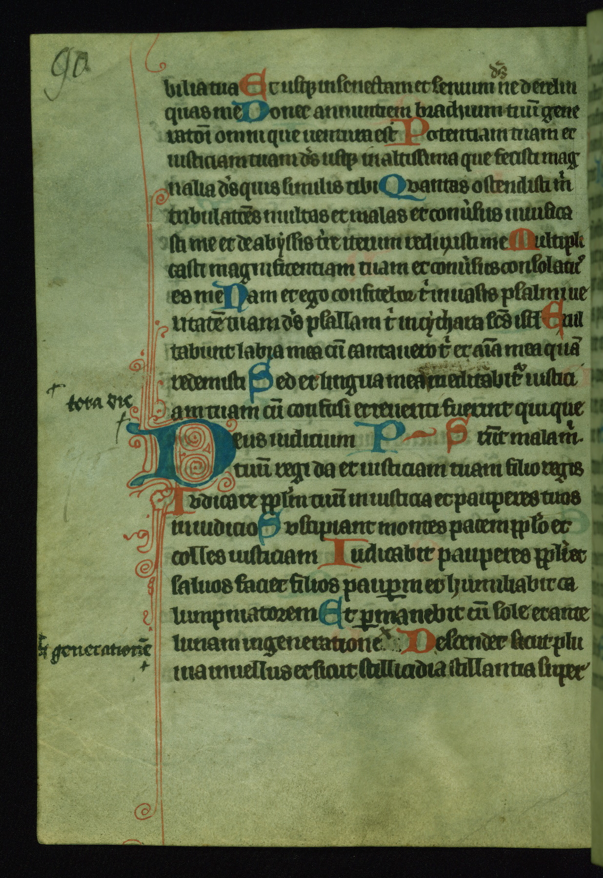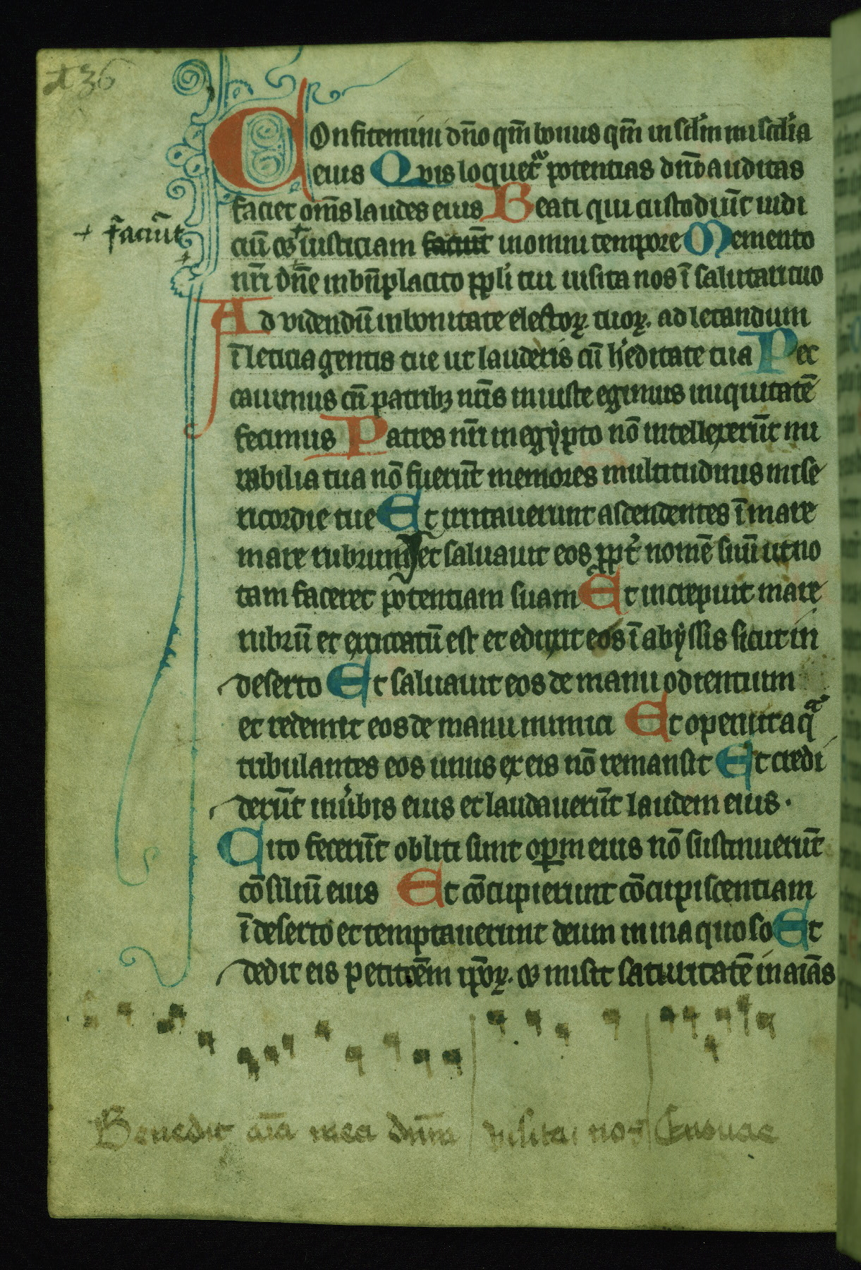 This Flemish Psalter was produced in the Hainaut region between 1265 and 1275. It was altered for Dominican use through the addition of antiphons in the margins in the late fifteenth century, at which point it was also rebound in its current inscribed leather binding. It was later among the books collected by Johann Anton Ramboux (1790-1866), a German painter and museum curator. The manuscript, which is illuminated throughout with twelve large historiated and inhabited initials, is a strong example of a group of manuscripts produced in the last quarter of the thirteenth century that combined the artistic styles of Hainaut and Liège, other examples including Paris, B.N. Lat. 1077, Biblioteca apostolica vaticana, BBR Ms. IV-1066, and Princeton University Art Museum 57.189.