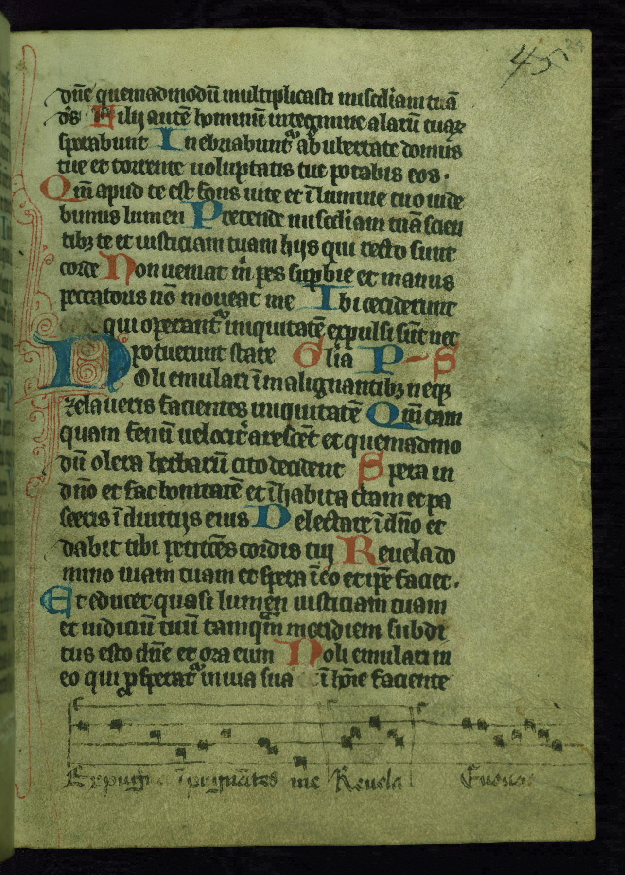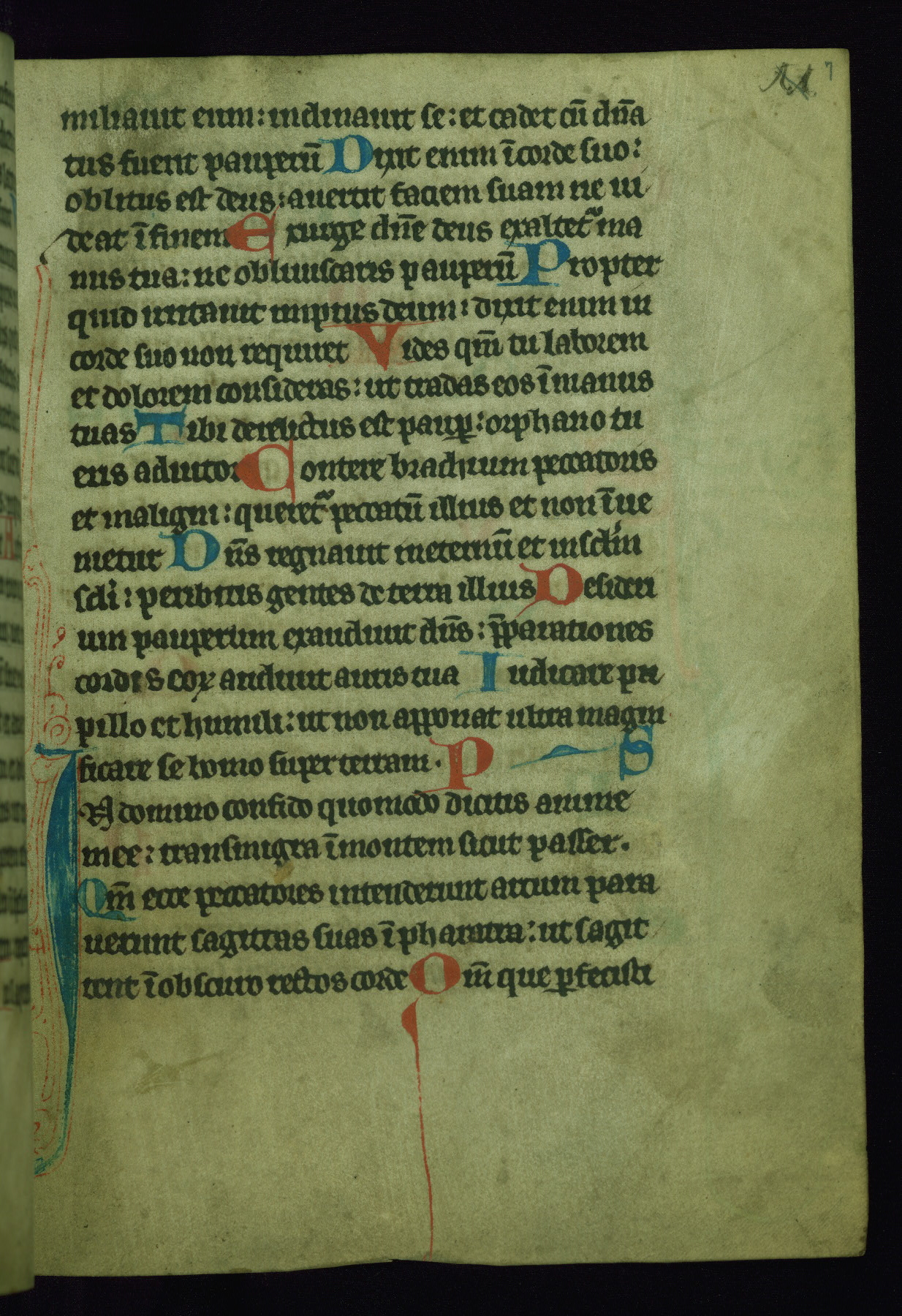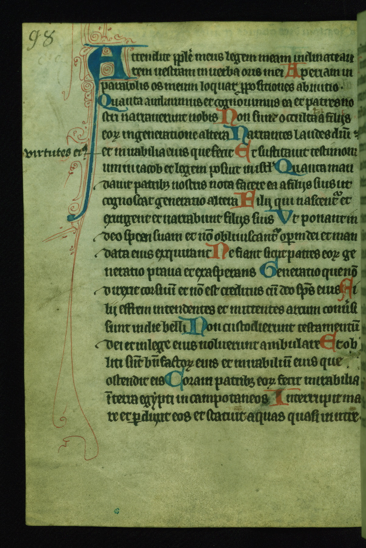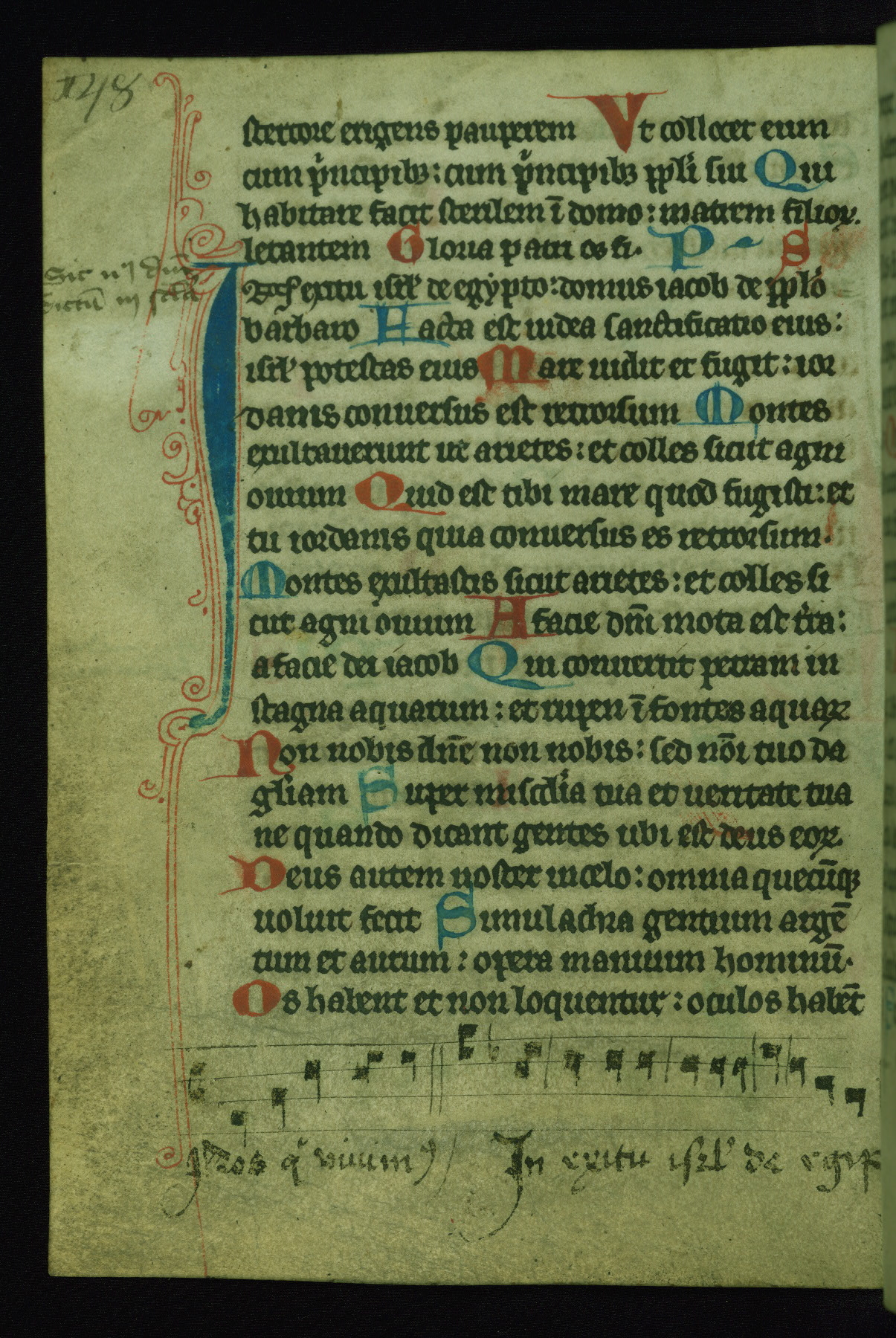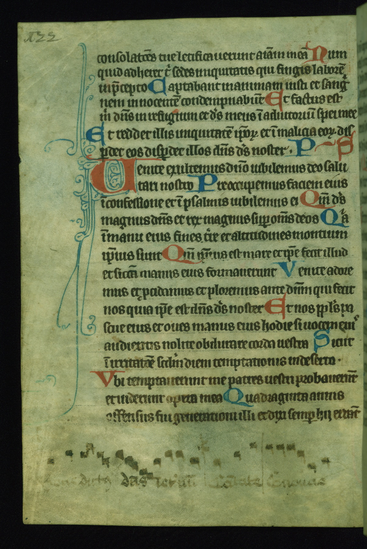 This Flemish Psalter was produced in the Hainaut region between 1265 and 1275. It was altered for Dominican use through the addition of antiphons in the margins in the late fifteenth century, at which point it was also rebound in its current inscribed leather binding. It was later among the books collected by Johann Anton Ramboux (1790-1866), a German painter and museum curator. The manuscript, which is illuminated throughout with twelve large historiated and inhabited initials, is a strong example of a group of manuscripts produced in the last quarter of the thirteenth century that combined the artistic styles of Hainaut and Liège, other examples including Paris, B.N. Lat. 1077, Biblioteca apostolica vaticana, BBR Ms. IV-1066, and Princeton University Art Museum 57.189.