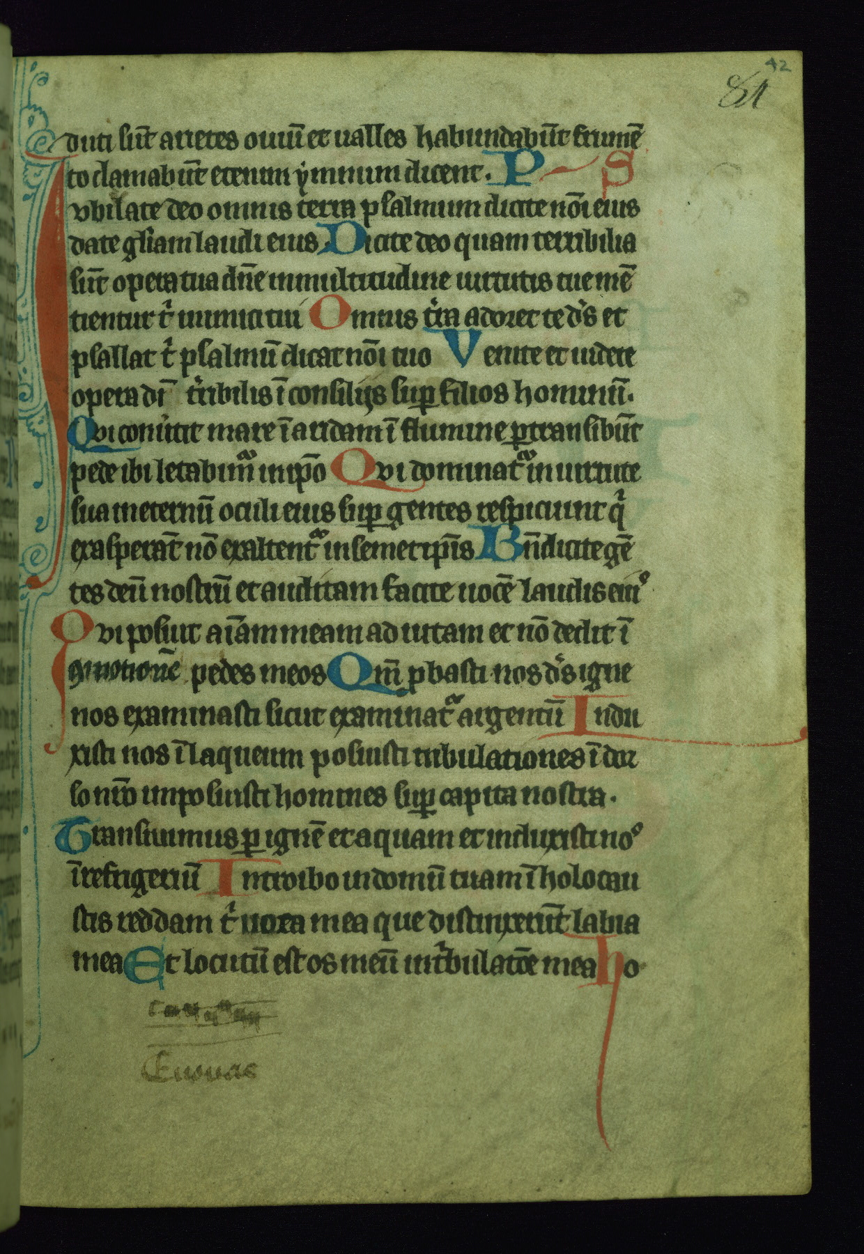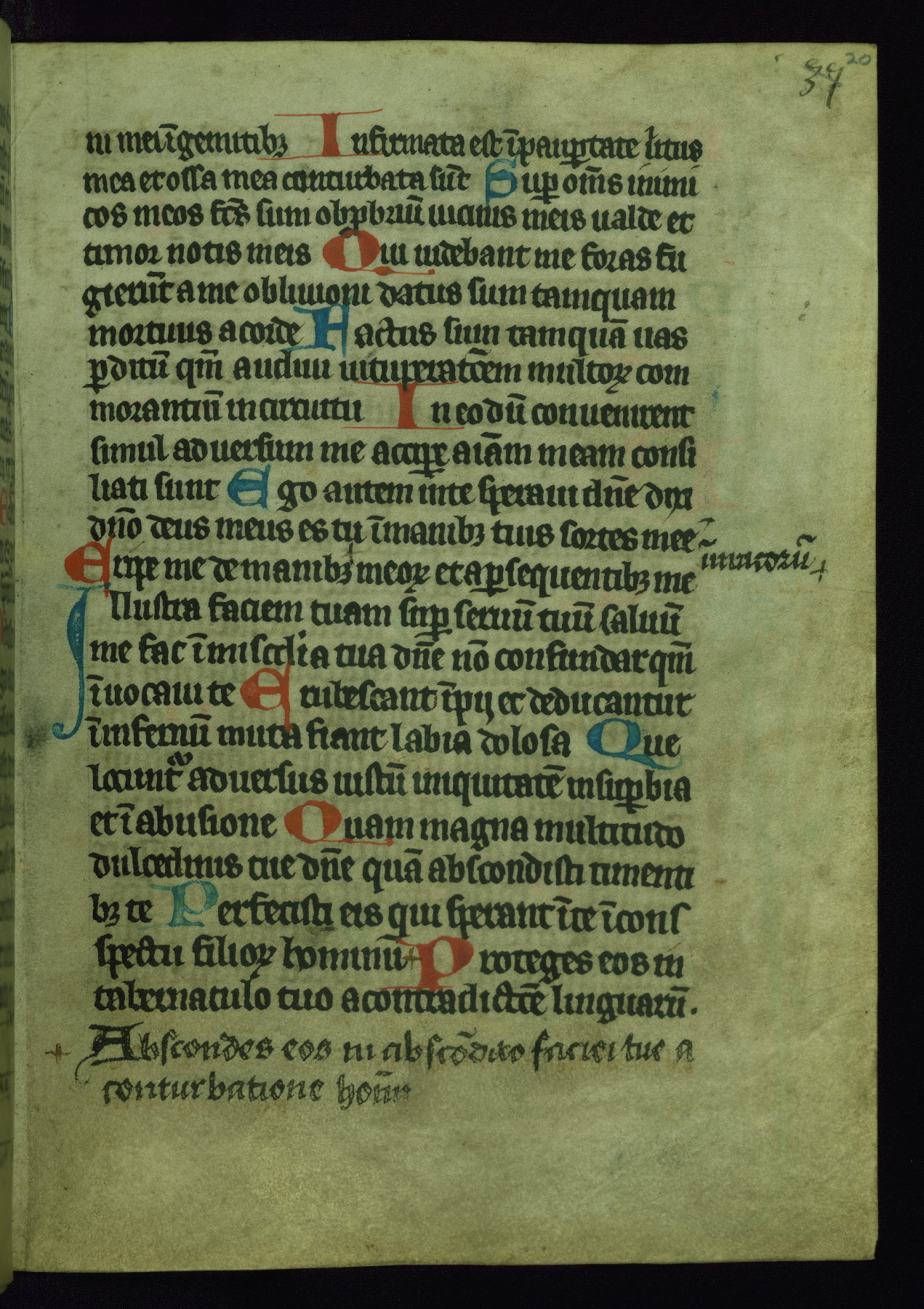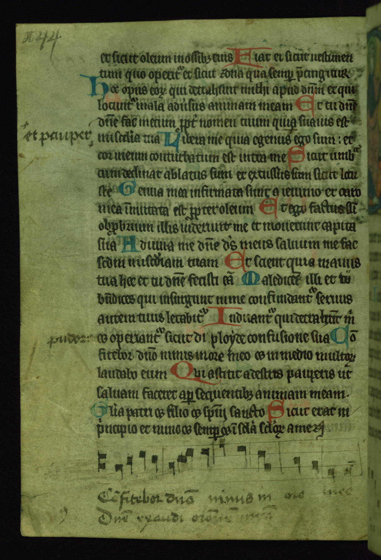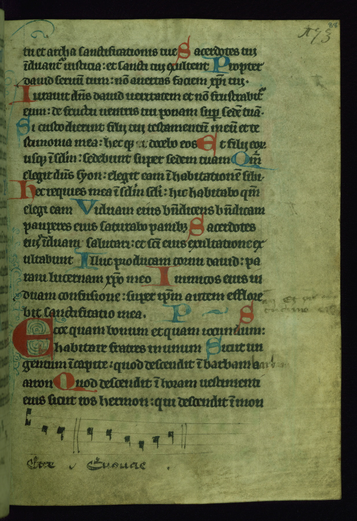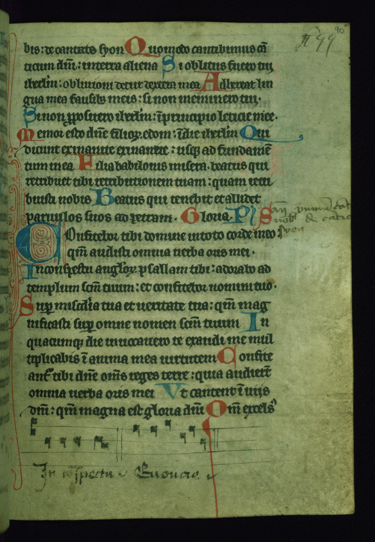 This Flemish Psalter was produced in the Hainaut region between 1265 and 1275. It was altered for Dominican use through the addition of antiphons in the margins in the late fifteenth century, at which point it was also rebound in its current inscribed leather binding. It was later among the books collected by Johann Anton Ramboux (1790-1866), a German painter and museum curator. The manuscript, which is illuminated throughout with twelve large historiated and inhabited initials, is a strong example of a group of manuscripts produced in the last quarter of the thirteenth century that combined the artistic styles of Hainaut and Liège, other examples including Paris, B.N. Lat. 1077, Biblioteca apostolica vaticana, BBR Ms. IV-1066, and Princeton University Art Museum 57.189.