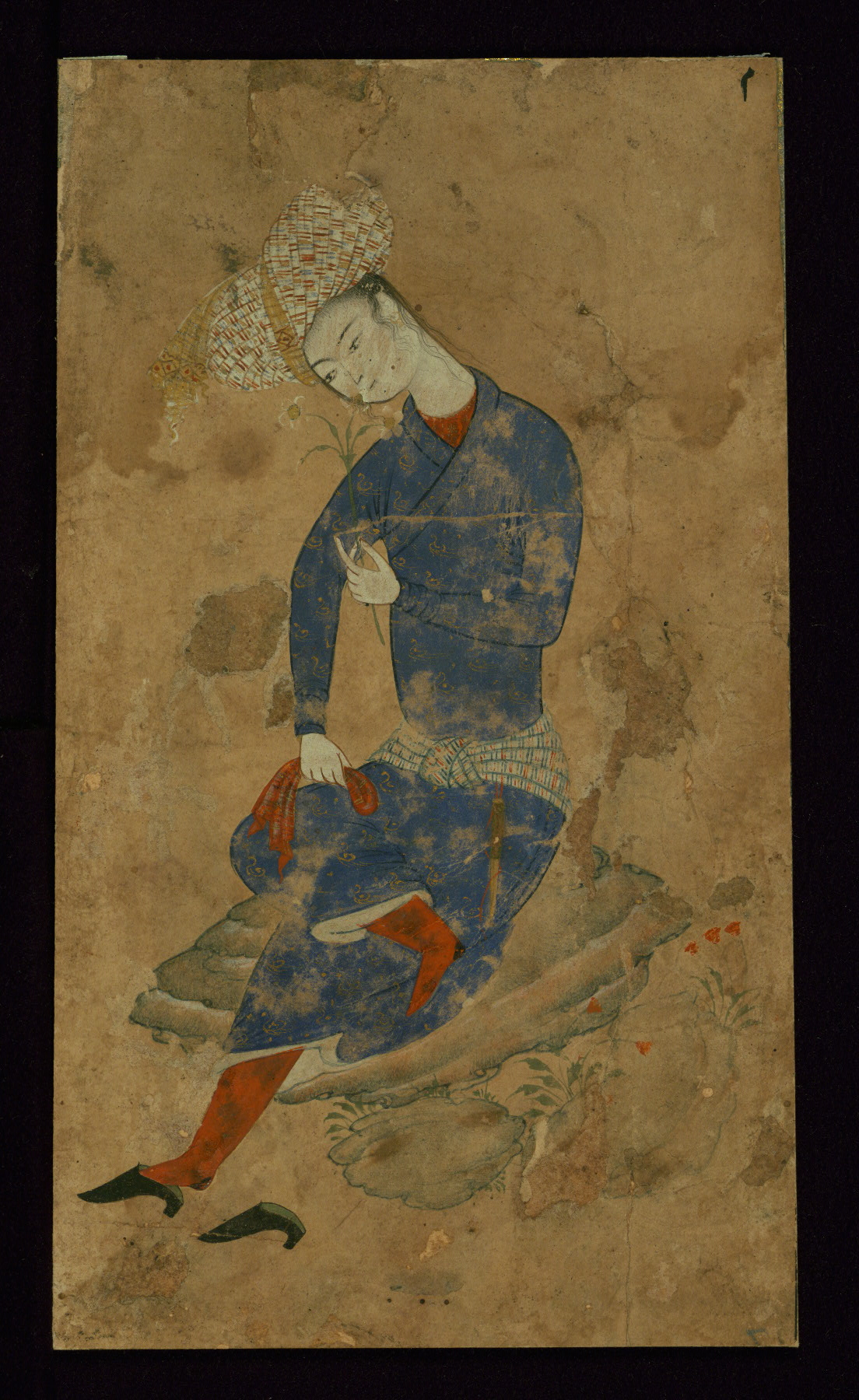 This single-leaf painting of a young man in a blue robe and red undergarment was produced in Safavid Iran in the eleventh century AH / seventeenth CE. The youth sits in a landscape smelling a flower. Images of elegantly dressed men and women were exceedingly popular in Safavid Iran. They circulated as loose leaves and were collected into albums (muraqqaʿ). The work is painted in opaque watercolor and gold.