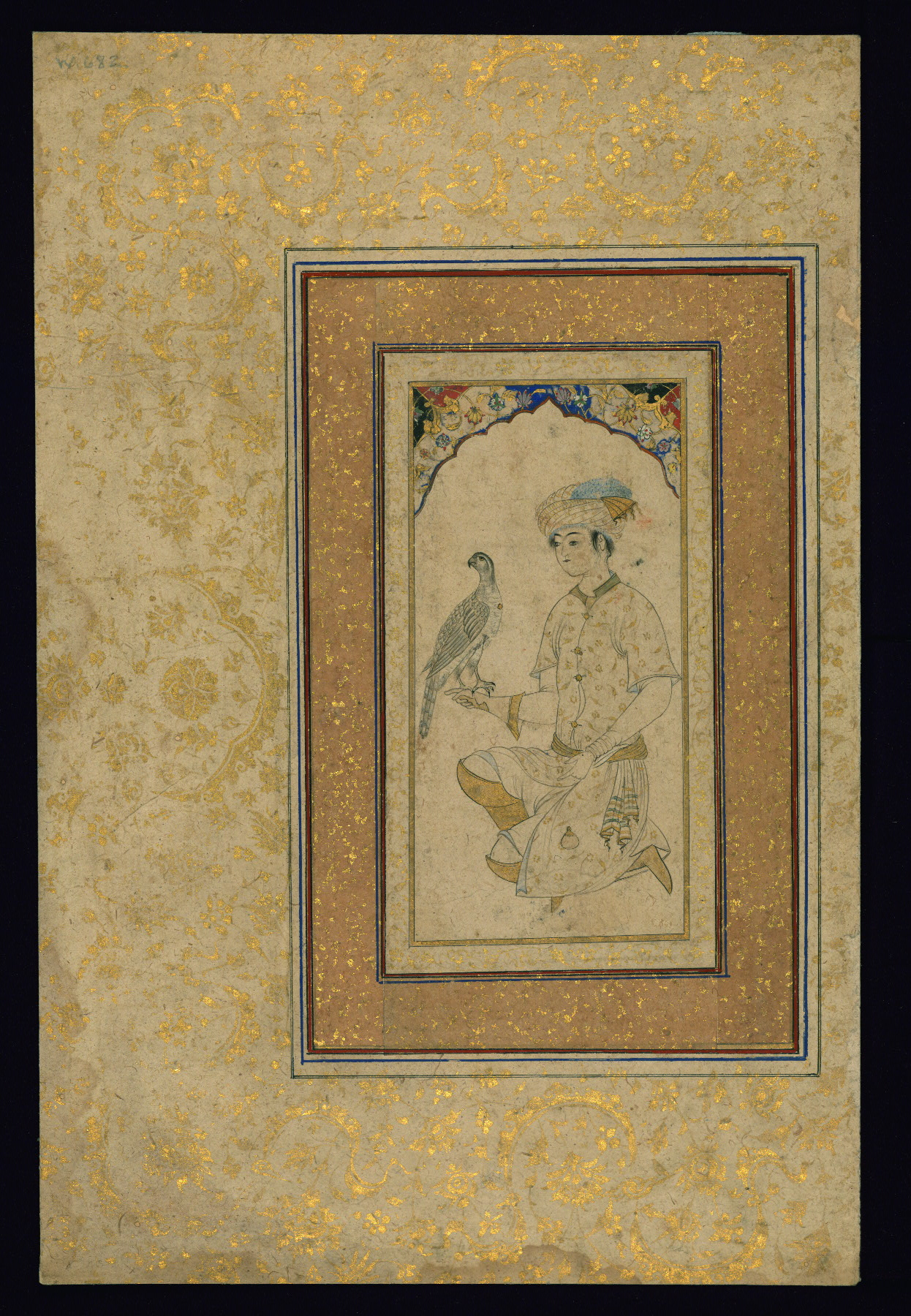 This Safavid drawing depicts a kneeling young man with a falcon. It dates to the late tenth century AH / sixteenth CE or early eleventh century AH / seventeenth CE and was likely produced in Qazvin or Isfahan. Gilt and blue pigment are used to highlight the figure's clothing. Polychrome floral decoration in a decorative arch fills the upper portion of the composition.