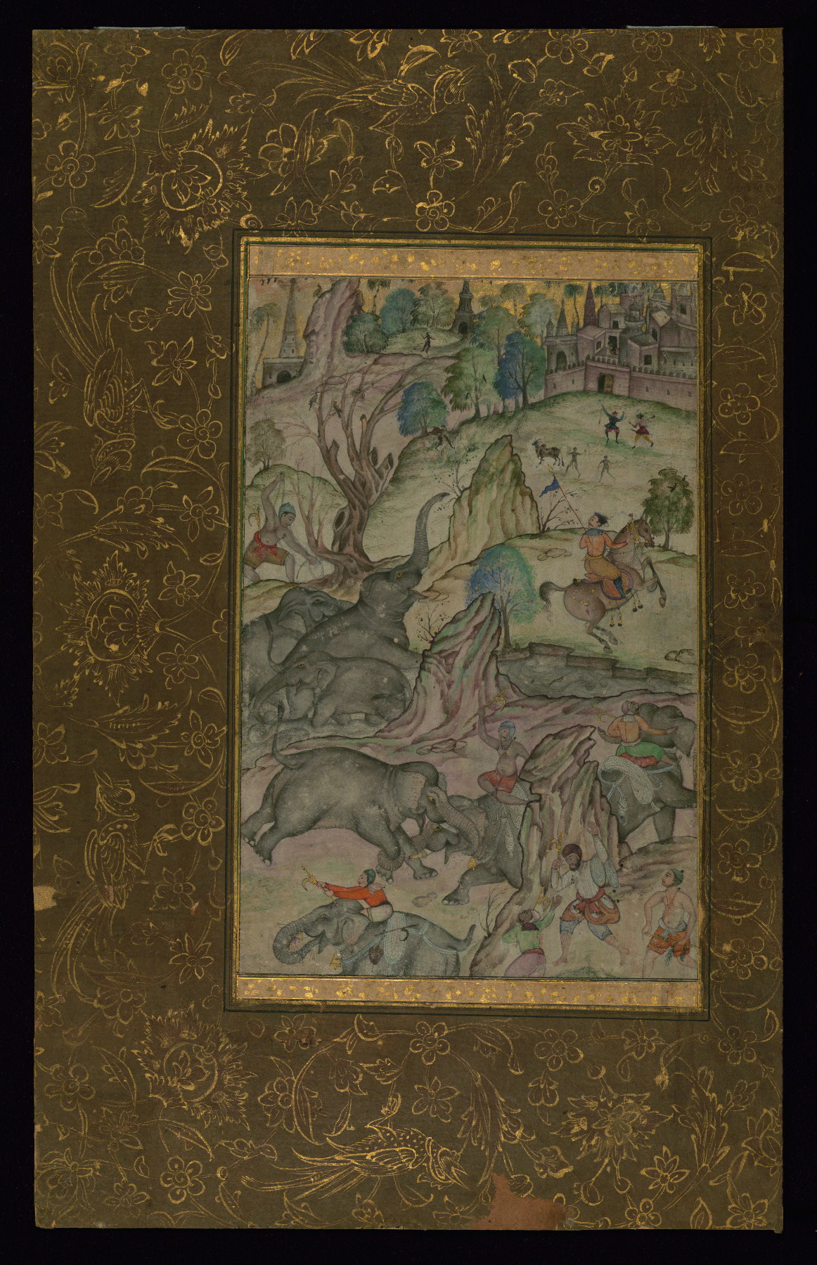 - Label: This Mughal painting dates to the late tenth century AH / sixteenth CE or the early eleventh century AH / seventeenth CE. It depicts elephants on the bank of a river in a rocky landscape with a fortified city in the background. It appears that the wild elephants are being captured with a view to taming them. The figures in grisaille and the architectural vignettes in the background represent early contacts between Mughal India and Europe. The painting has a brown border with illuminated flora and fauna motifs.