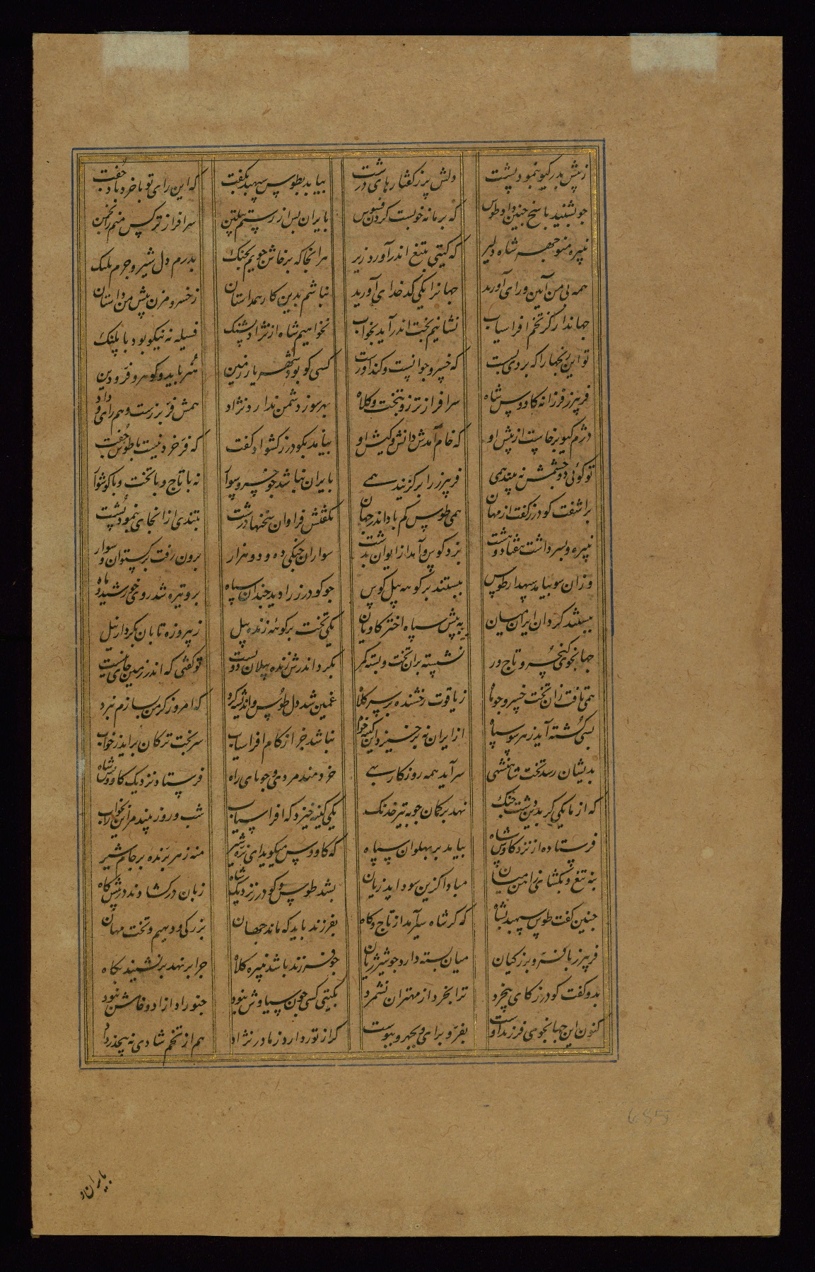This Mughal painting dates to the late tenth century AH / sixteenth CE or the early eleventh century AH / seventeenth CE. It depicts elephants on the bank of a river in a rocky landscape with a fortified city in the background. It appears that the wild elephants are being captured with a view to taming them. The figures in grisaille and the architectural vignettes in the background represent early contacts between Mughal India and Europe. The painting has a brown border with illuminated flora and fauna motifs.