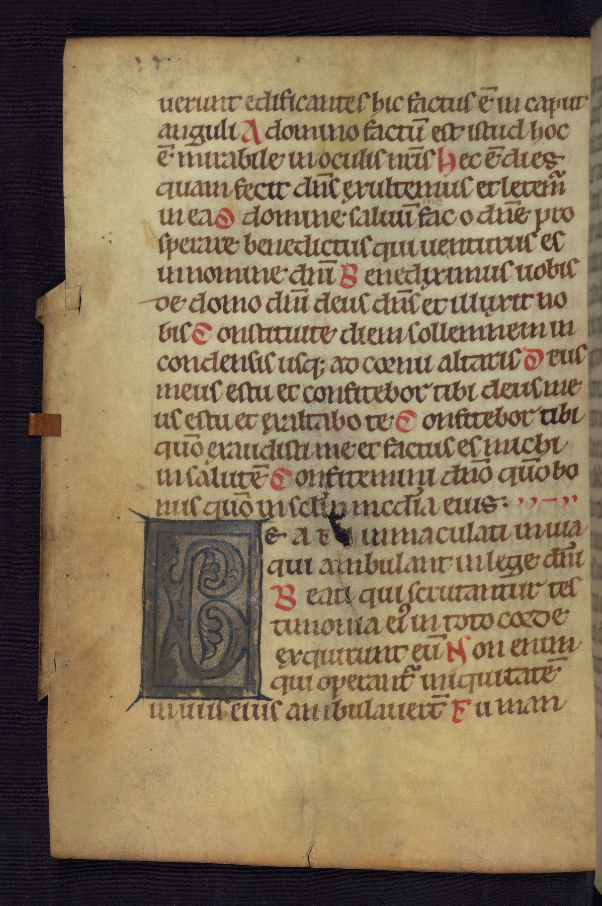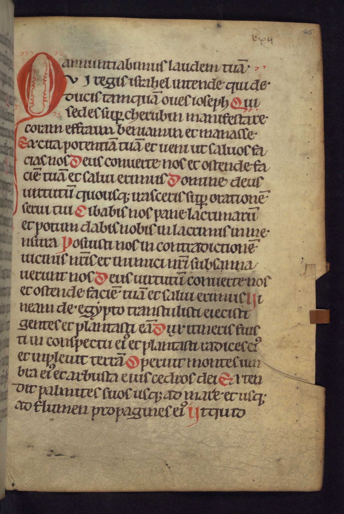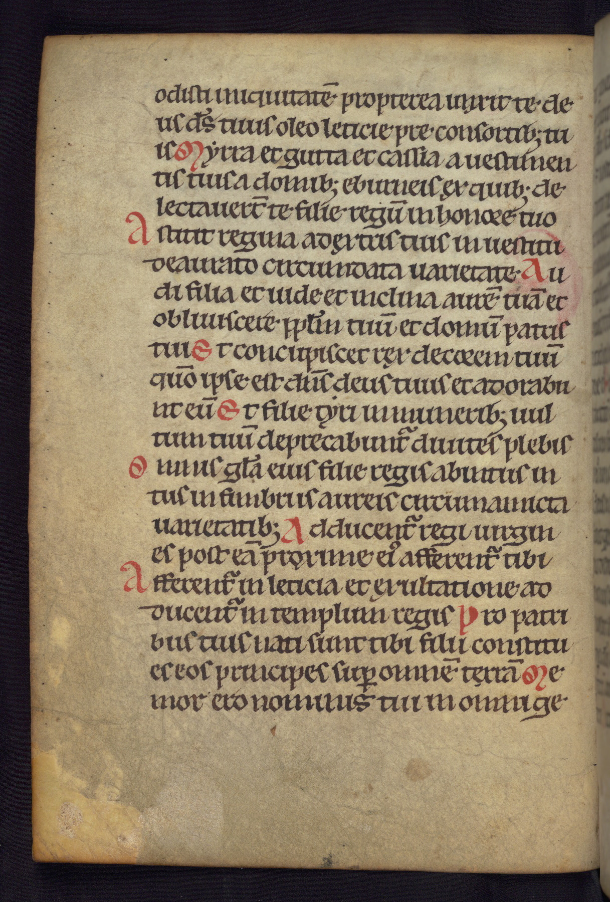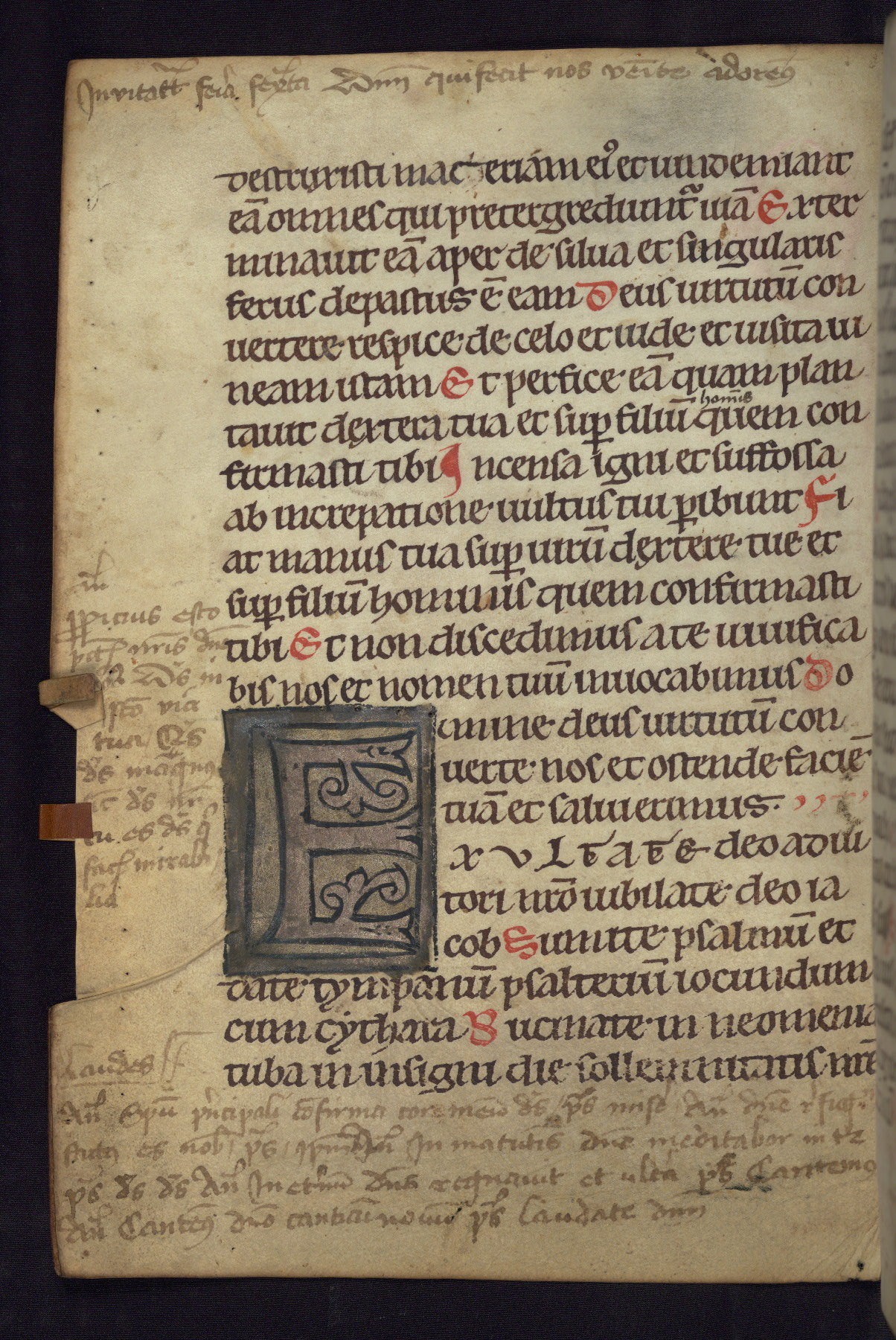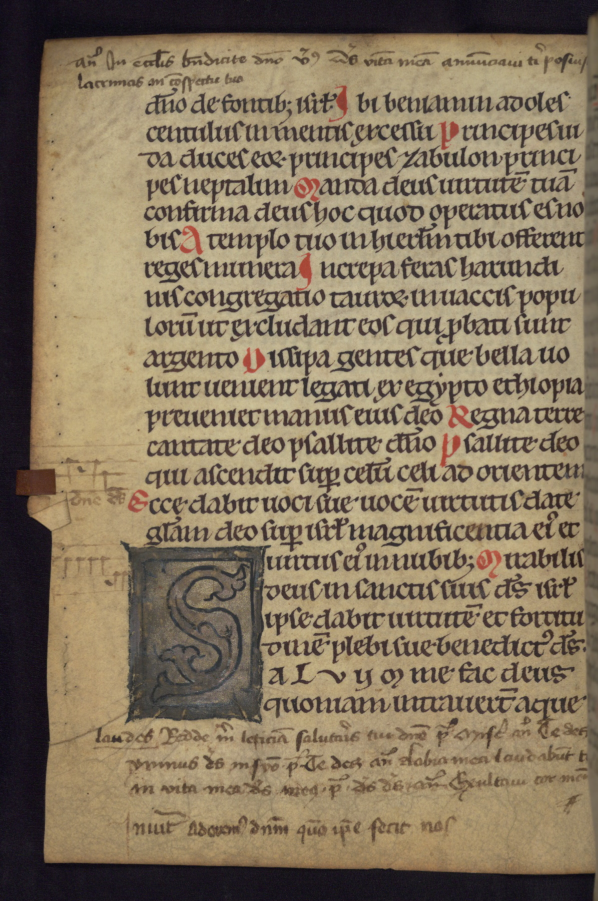 This Latin psalter was made in the second half of the thirteenth century for use in the Diocese of Constance, Germany. By the fourteenth century, it was owned by the Church of St. Mary of Strasbourg, from which it gets its name. The long life and enthusiastic use of the manuscript is attested by a multitude of added inscriptions, prayers, and antiphons with neumes, most dating to the fifteenth or sixteenth century. An early system of bookmarking is also evident; strips of parchment have been cut in some of the margins and folded through a slit in the leaf, creating tabs that would have helped the reader navigate through the text. Illumination also served this function, for while a short cycle of images from the life of Christ introduces the manuscript, the rest of the illuminations--large decorated initials as well as smaller ones in silver and gold--mark the important psalms for the reader. The style of illumination found here is closely related to two other psalters from Constance: Sigmaringen, Royal State Archives Ms. 11 and Hessische Landesbibliothek Fulda Ms. Aa 82.