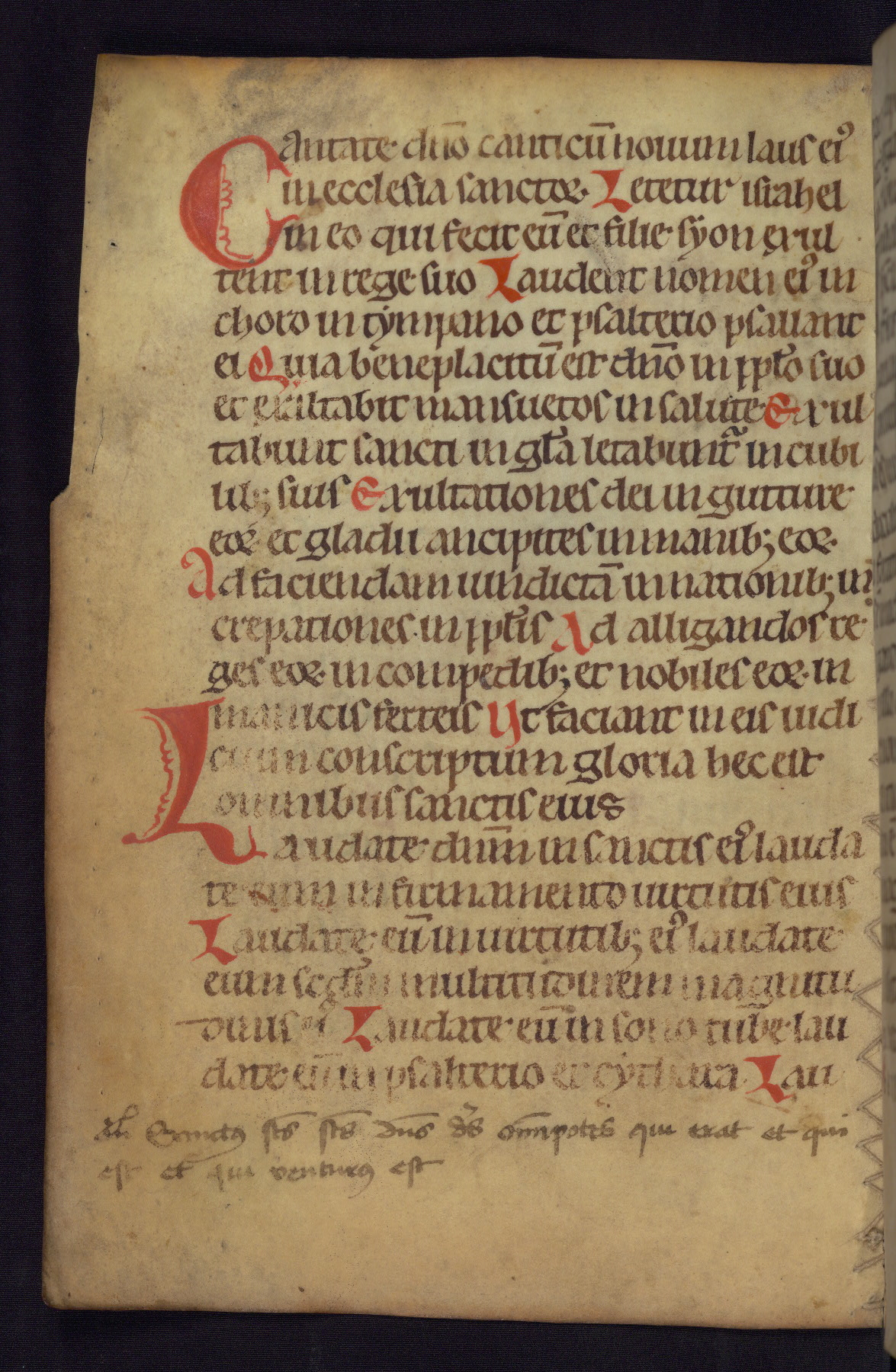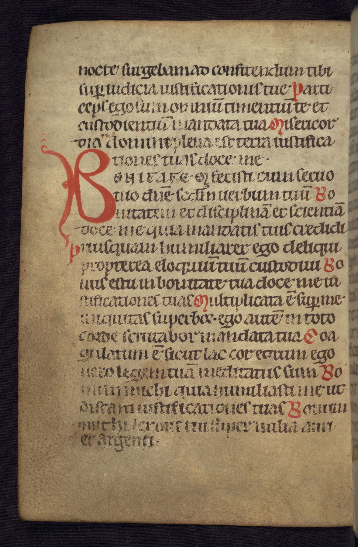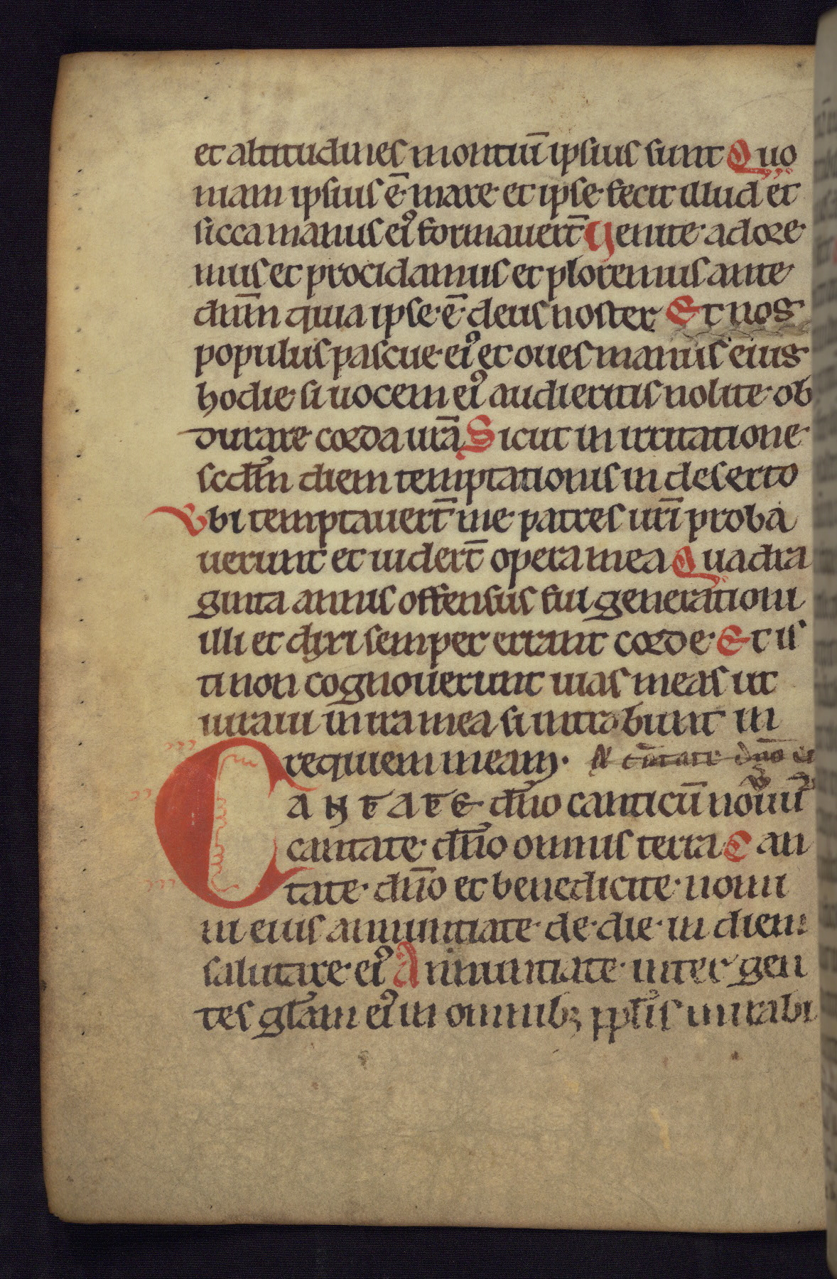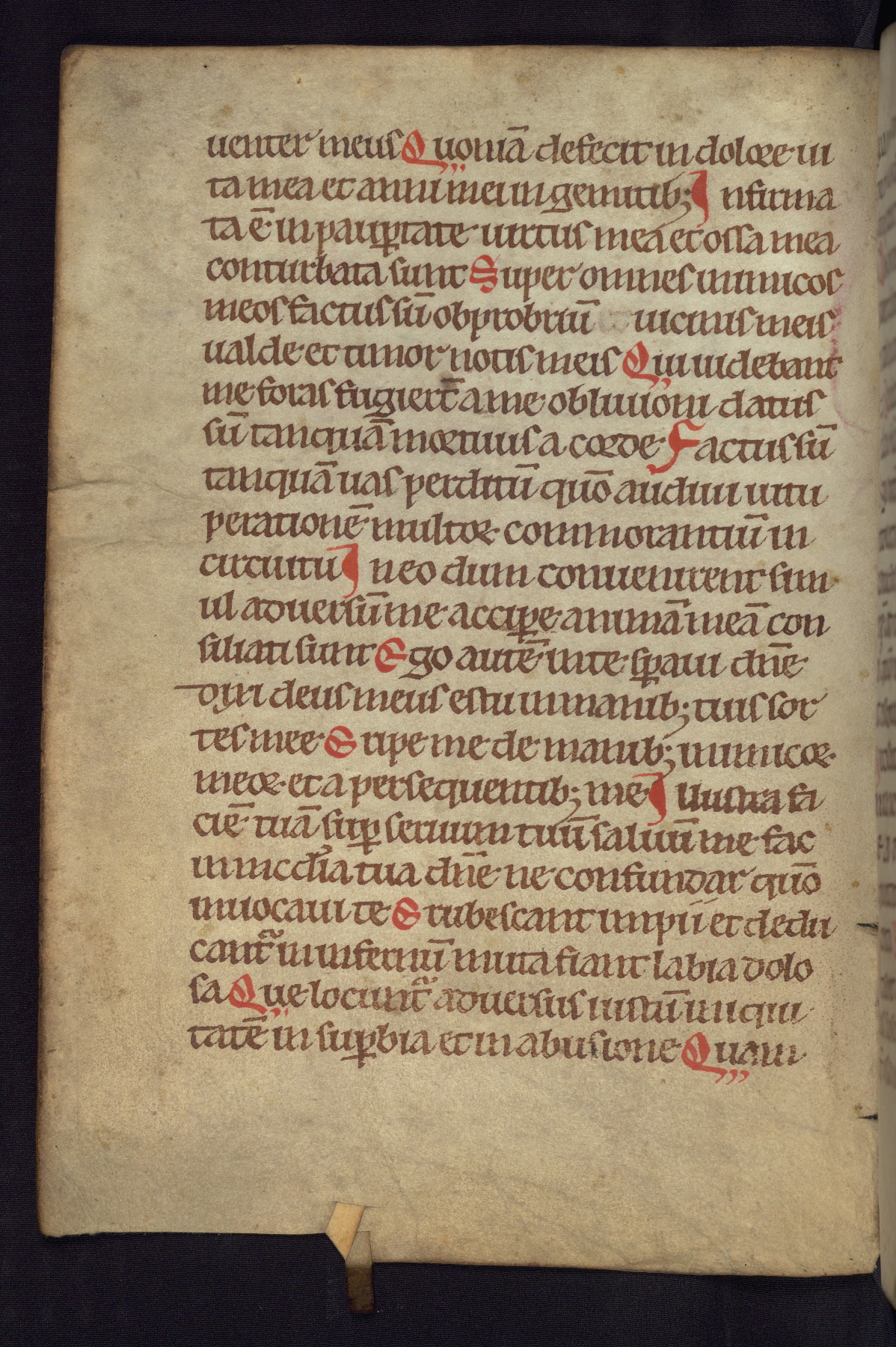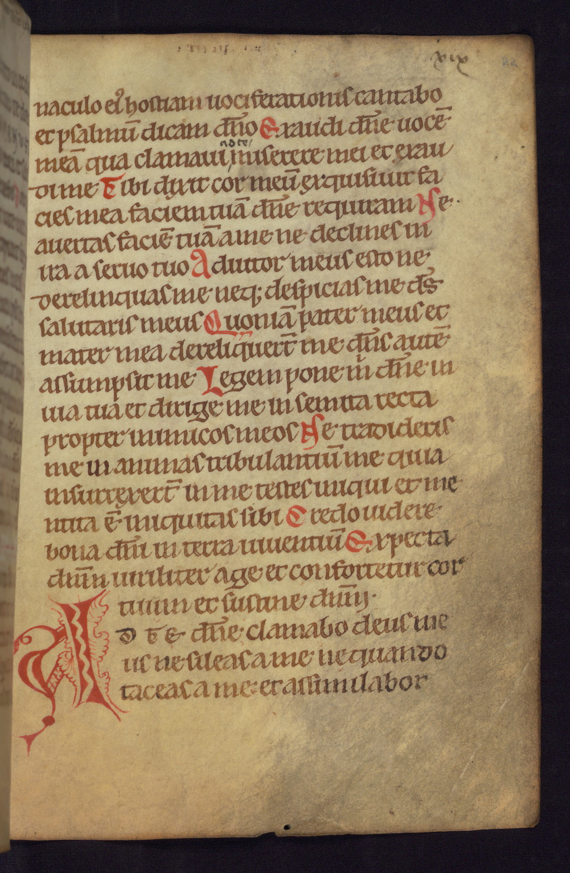 This Latin psalter was made in the second half of the thirteenth century for use in the Diocese of Constance, Germany. By the fourteenth century, it was owned by the Church of St. Mary of Strasbourg, from which it gets its name. The long life and enthusiastic use of the manuscript is attested by a multitude of added inscriptions, prayers, and antiphons with neumes, most dating to the fifteenth or sixteenth century. An early system of bookmarking is also evident; strips of parchment have been cut in some of the margins and folded through a slit in the leaf, creating tabs that would have helped the reader navigate through the text. Illumination also served this function, for while a short cycle of images from the life of Christ introduces the manuscript, the rest of the illuminations--large decorated initials as well as smaller ones in silver and gold--mark the important psalms for the reader. The style of illumination found here is closely related to two other psalters from Constance: Sigmaringen, Royal State Archives Ms. 11 and Hessische Landesbibliothek Fulda Ms. Aa 82.