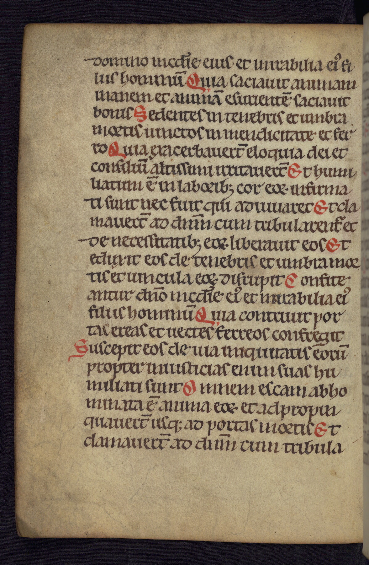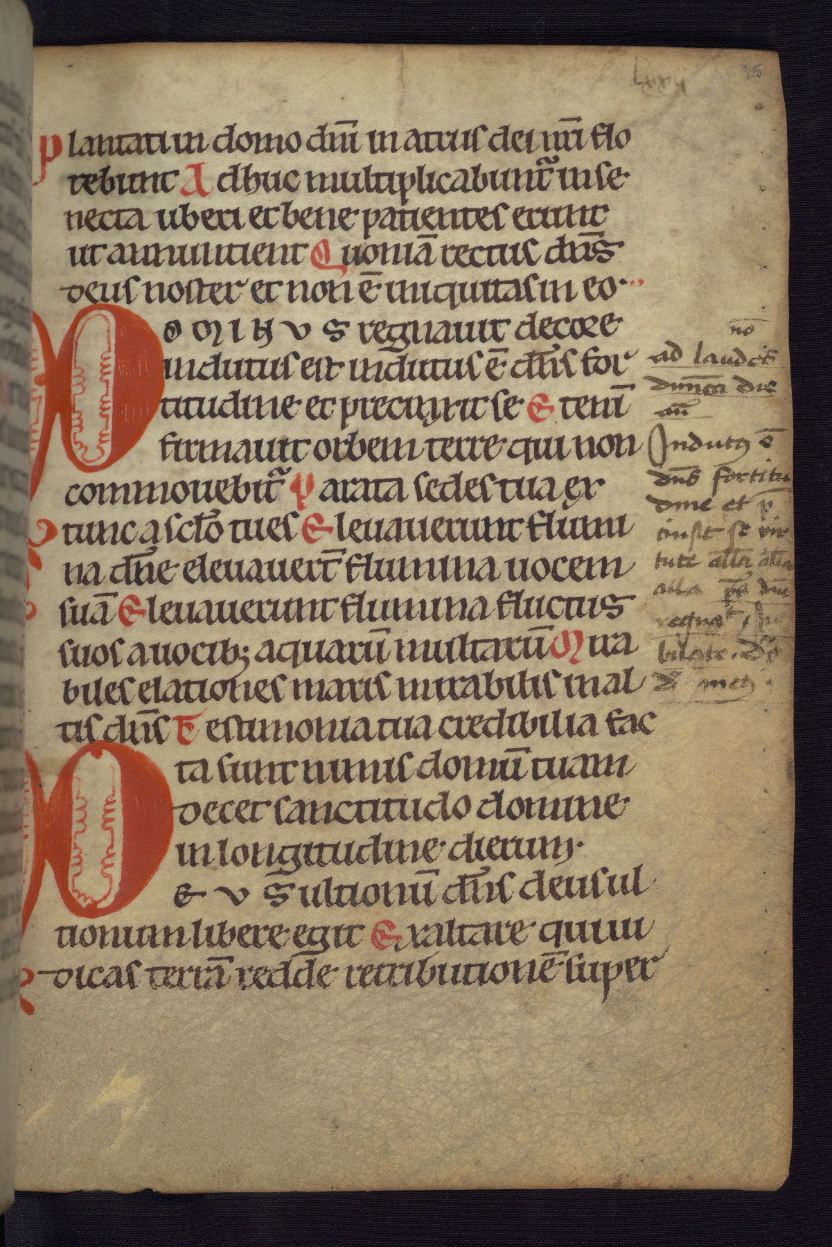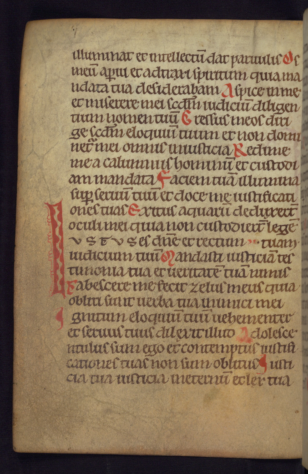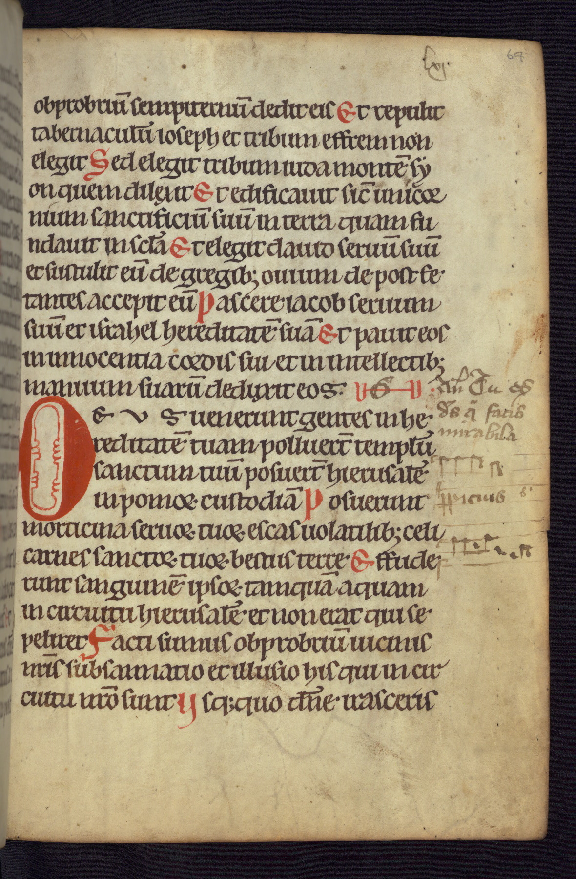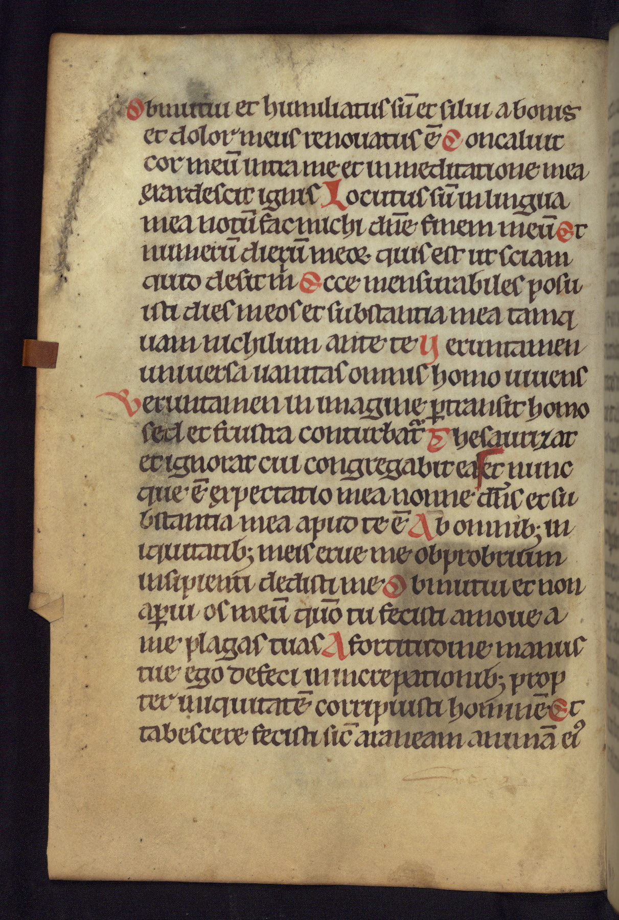 This Latin psalter was made in the second half of the thirteenth century for use in the Diocese of Constance, Germany. By the fourteenth century, it was owned by the Church of St. Mary of Strasbourg, from which it gets its name. The long life and enthusiastic use of the manuscript is attested by a multitude of added inscriptions, prayers, and antiphons with neumes, most dating to the fifteenth or sixteenth century. An early system of bookmarking is also evident; strips of parchment have been cut in some of the margins and folded through a slit in the leaf, creating tabs that would have helped the reader navigate through the text. Illumination also served this function, for while a short cycle of images from the life of Christ introduces the manuscript, the rest of the illuminations--large decorated initials as well as smaller ones in silver and gold--mark the important psalms for the reader. The style of illumination found here is closely related to two other psalters from Constance: Sigmaringen, Royal State Archives Ms. 11 and Hessische Landesbibliothek Fulda Ms. Aa 82.