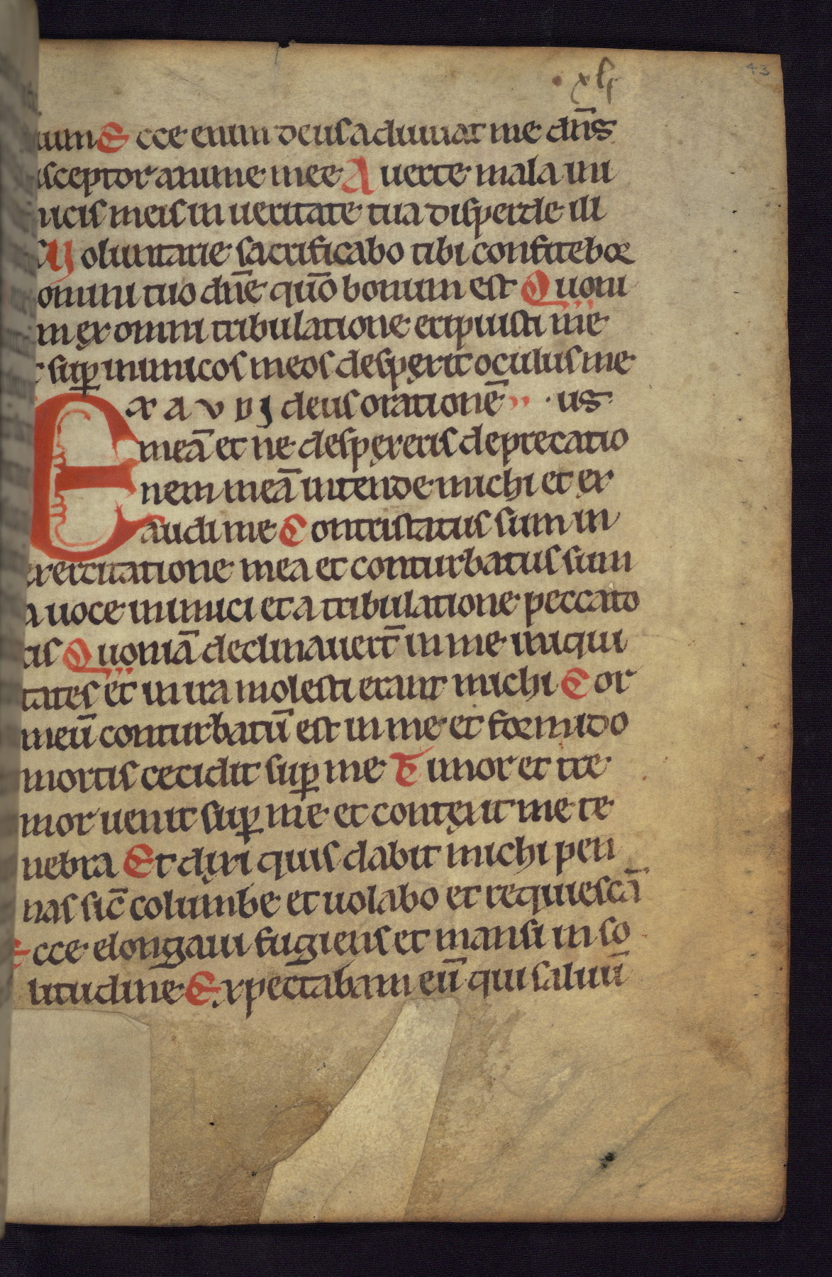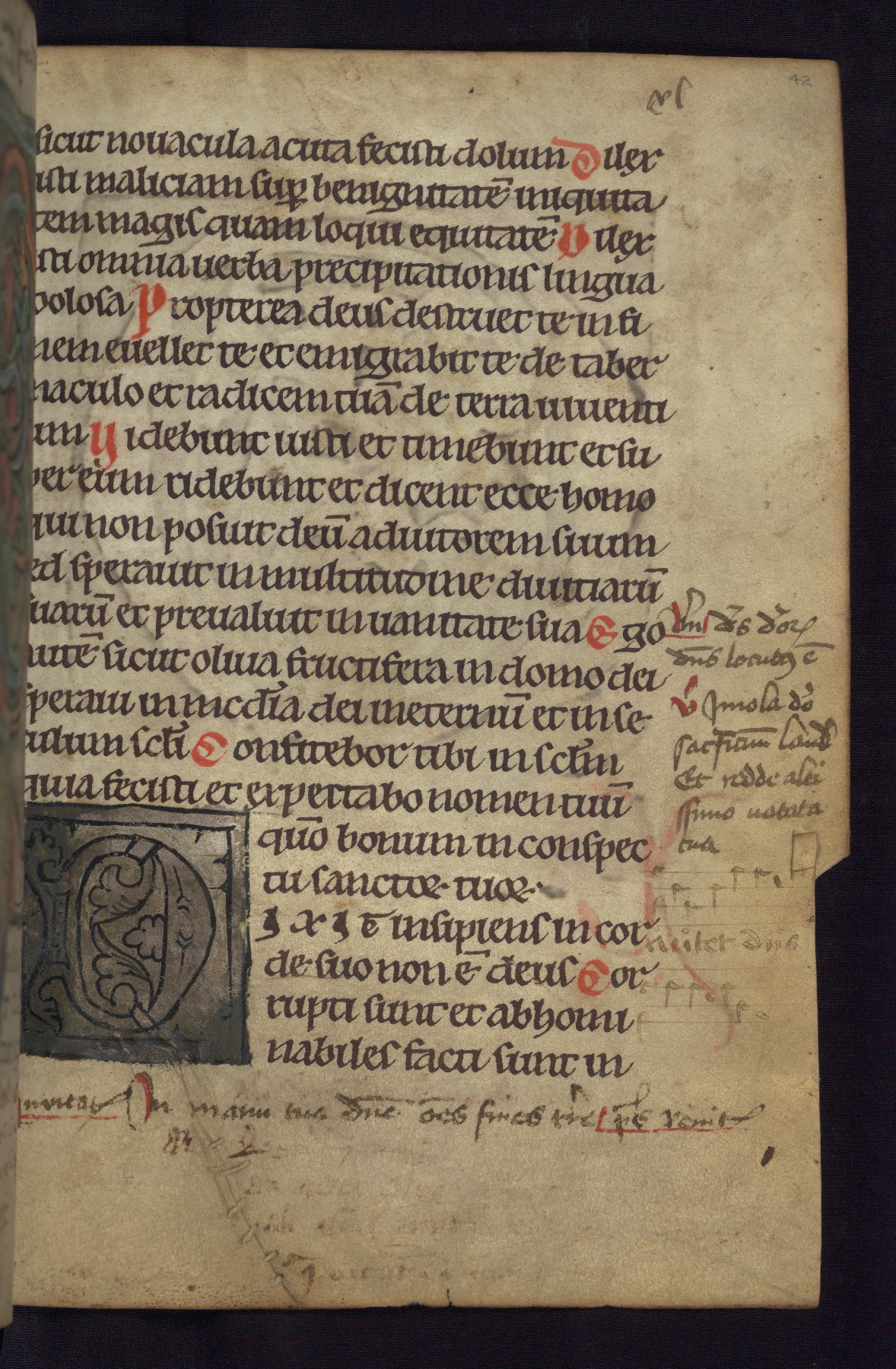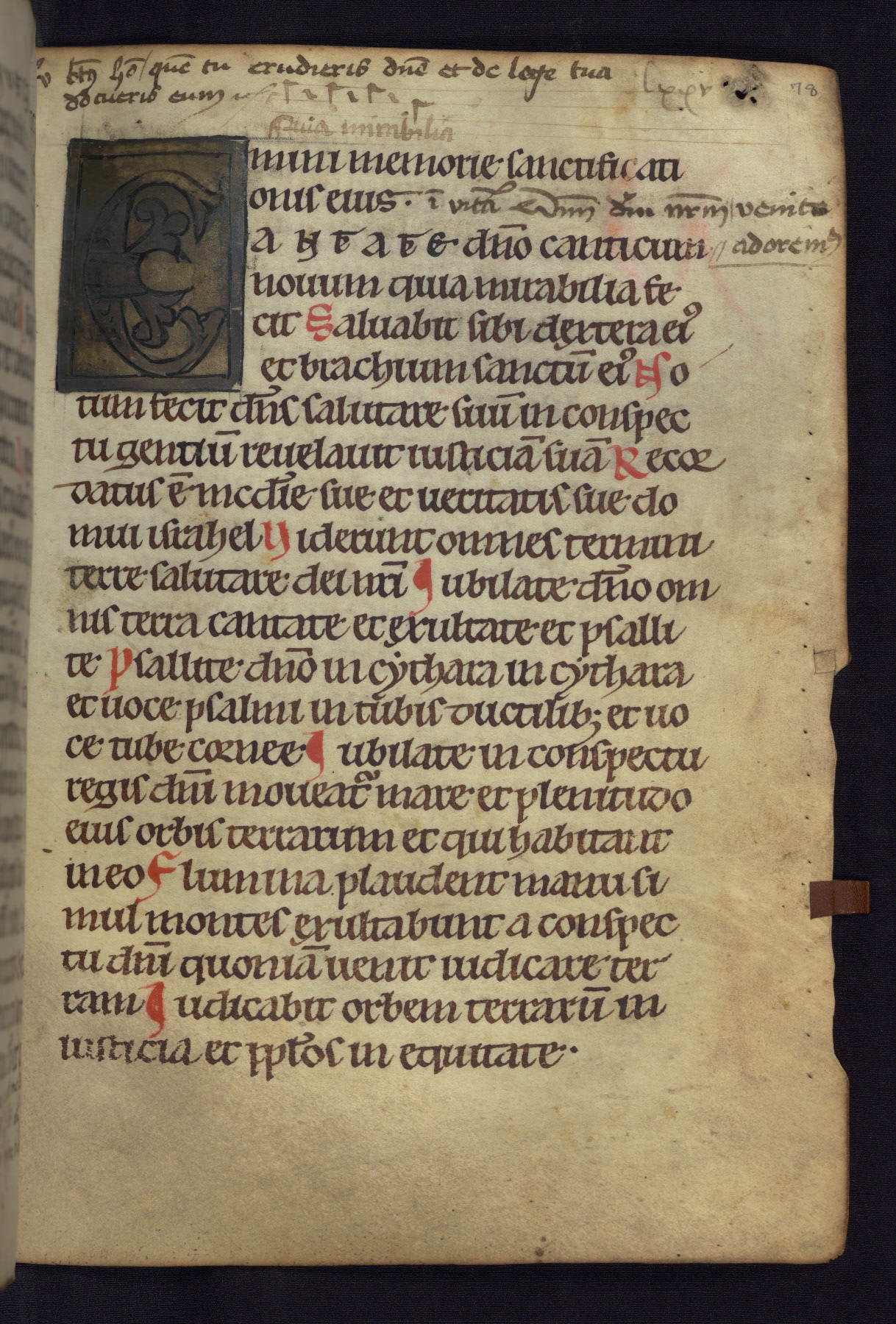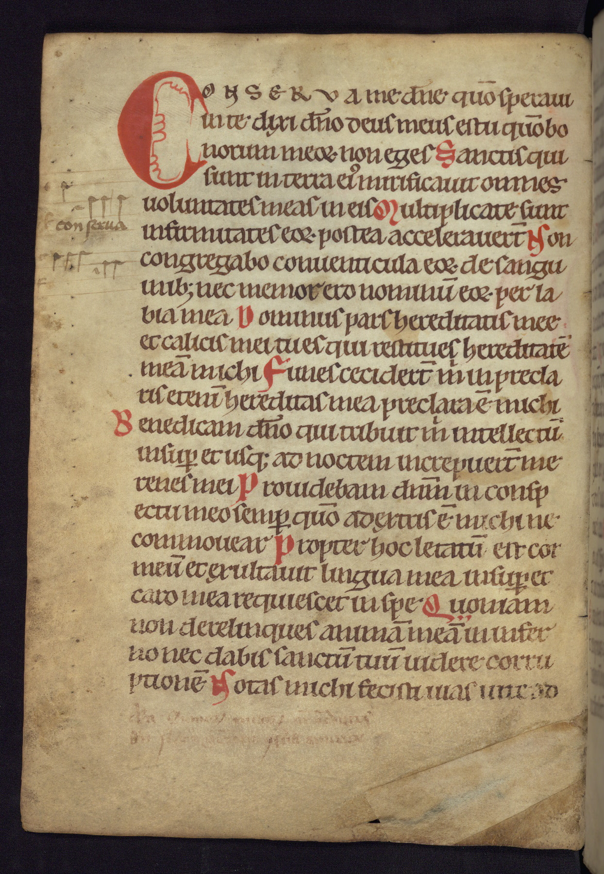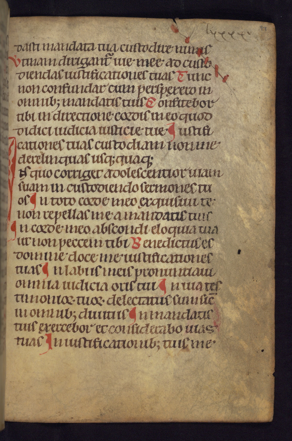 This Latin psalter was made in the second half of the thirteenth century for use in the Diocese of Constance, Germany. By the fourteenth century, it was owned by the Church of St. Mary of Strasbourg, from which it gets its name. The long life and enthusiastic use of the manuscript is attested by a multitude of added inscriptions, prayers, and antiphons with neumes, most dating to the fifteenth or sixteenth century. An early system of bookmarking is also evident; strips of parchment have been cut in some of the margins and folded through a slit in the leaf, creating tabs that would have helped the reader navigate through the text. Illumination also served this function, for while a short cycle of images from the life of Christ introduces the manuscript, the rest of the illuminations--large decorated initials as well as smaller ones in silver and gold--mark the important psalms for the reader. The style of illumination found here is closely related to two other psalters from Constance: Sigmaringen, Royal State Archives Ms. 11 and Hessische Landesbibliothek Fulda Ms. Aa 82.