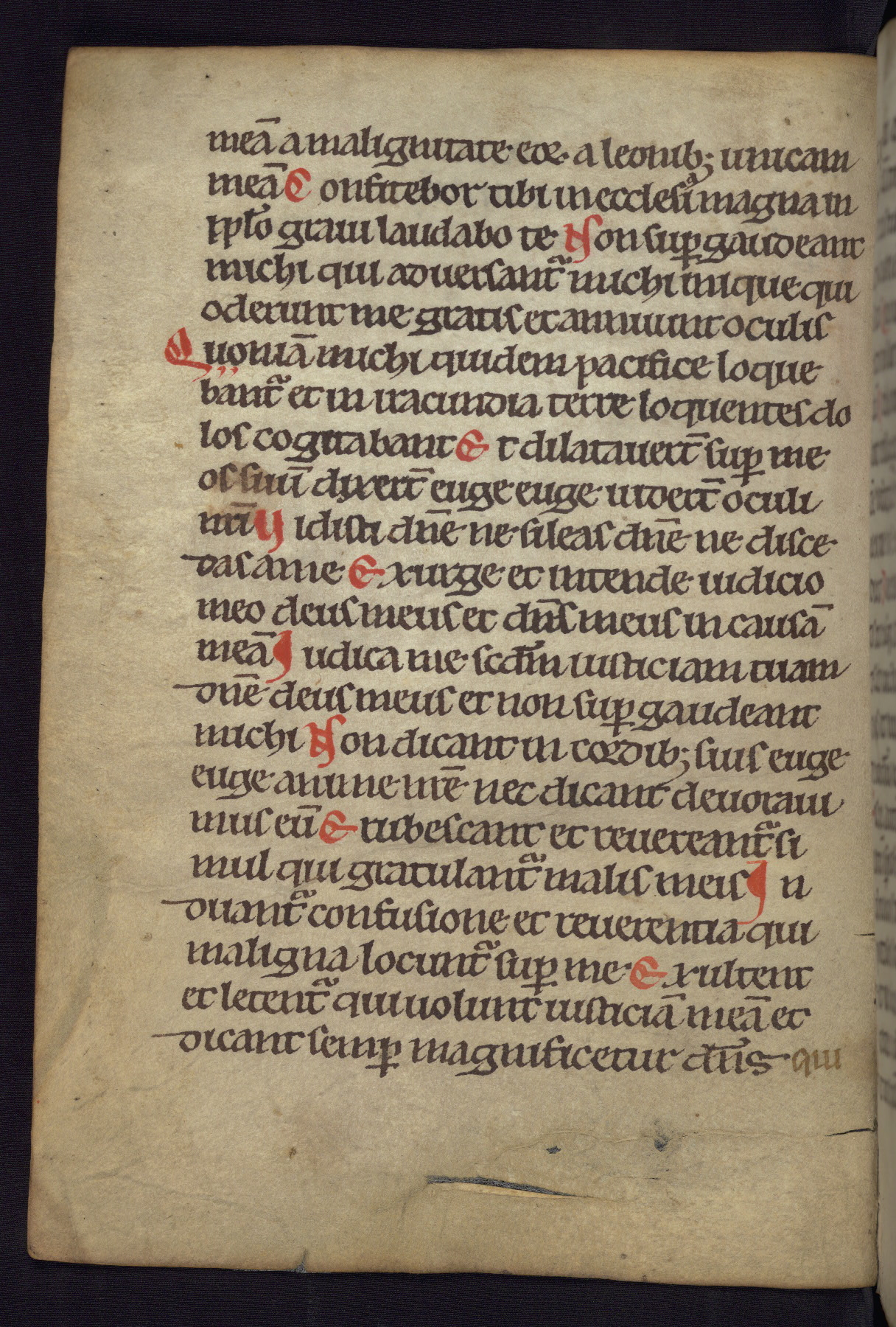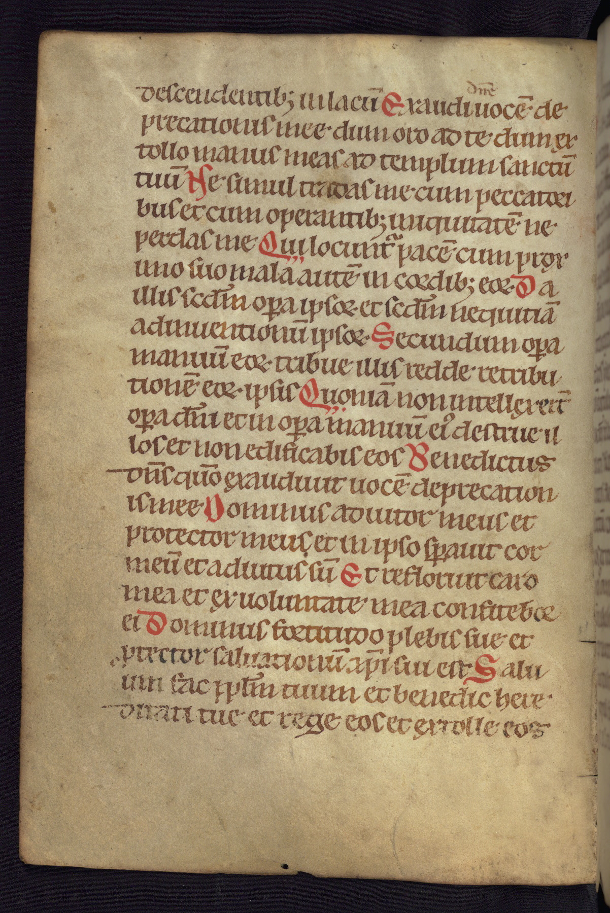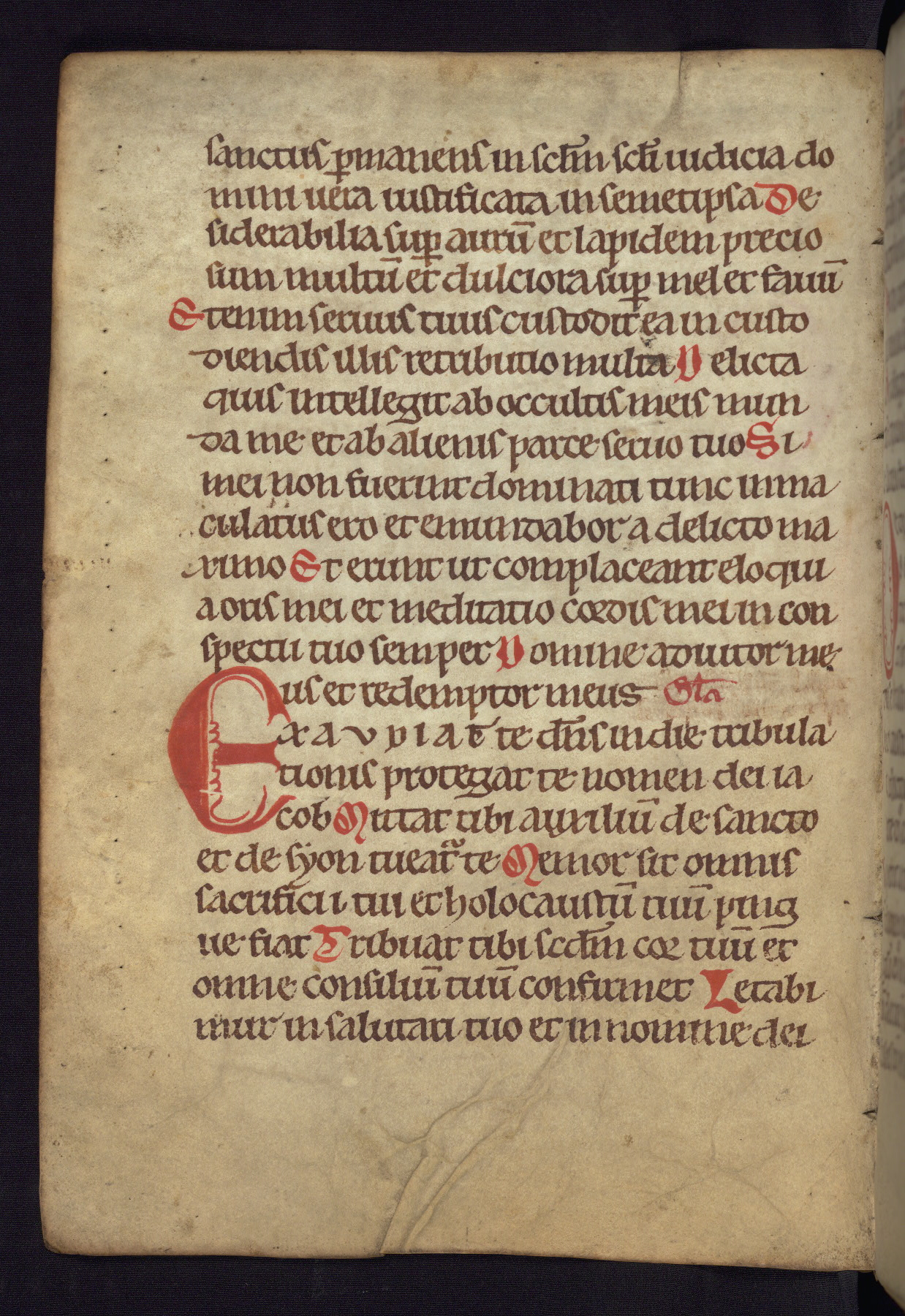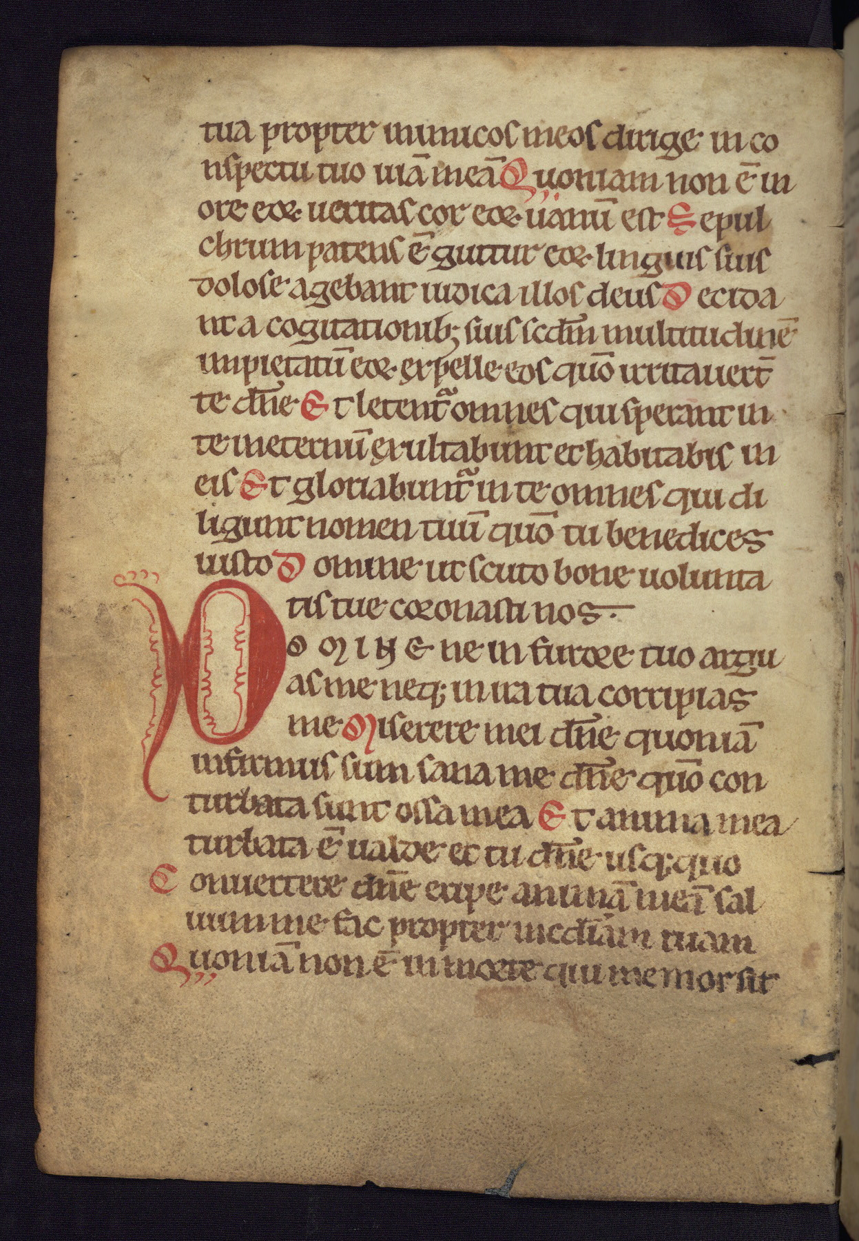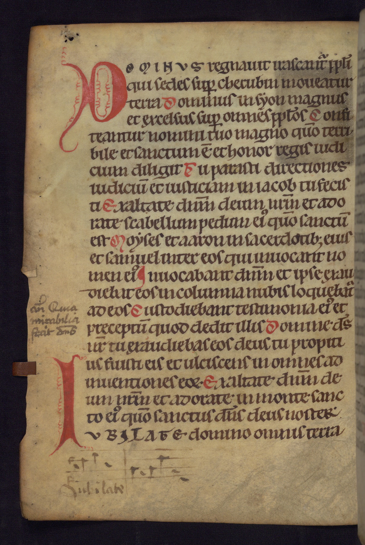 This Latin psalter was made in the second half of the thirteenth century for use in the Diocese of Constance, Germany. By the fourteenth century, it was owned by the Church of St. Mary of Strasbourg, from which it gets its name. The long life and enthusiastic use of the manuscript is attested by a multitude of added inscriptions, prayers, and antiphons with neumes, most dating to the fifteenth or sixteenth century. An early system of bookmarking is also evident; strips of parchment have been cut in some of the margins and folded through a slit in the leaf, creating tabs that would have helped the reader navigate through the text. Illumination also served this function, for while a short cycle of images from the life of Christ introduces the manuscript, the rest of the illuminations--large decorated initials as well as smaller ones in silver and gold--mark the important psalms for the reader. The style of illumination found here is closely related to two other psalters from Constance: Sigmaringen, Royal State Archives Ms. 11 and Hessische Landesbibliothek Fulda Ms. Aa 82.