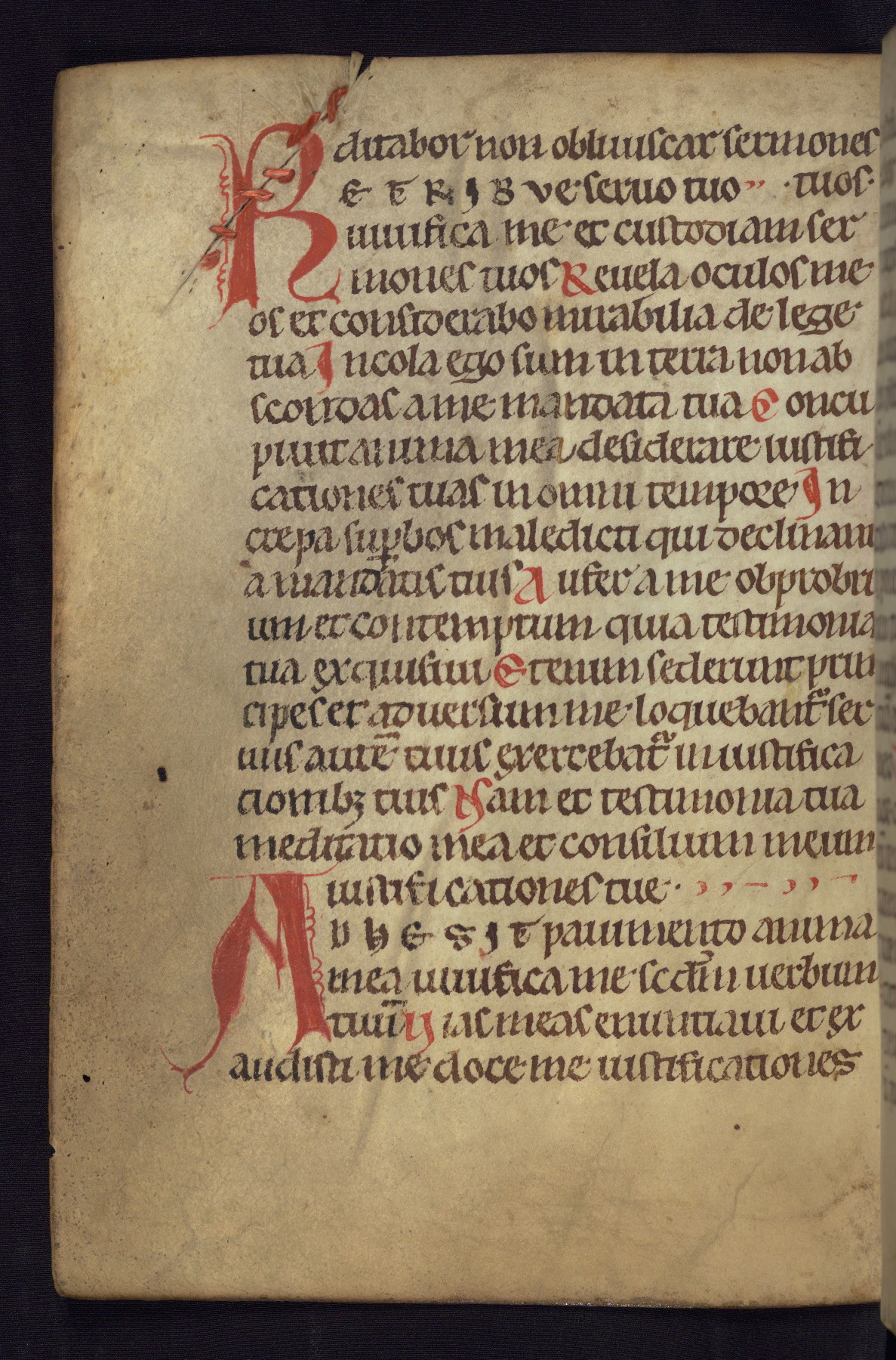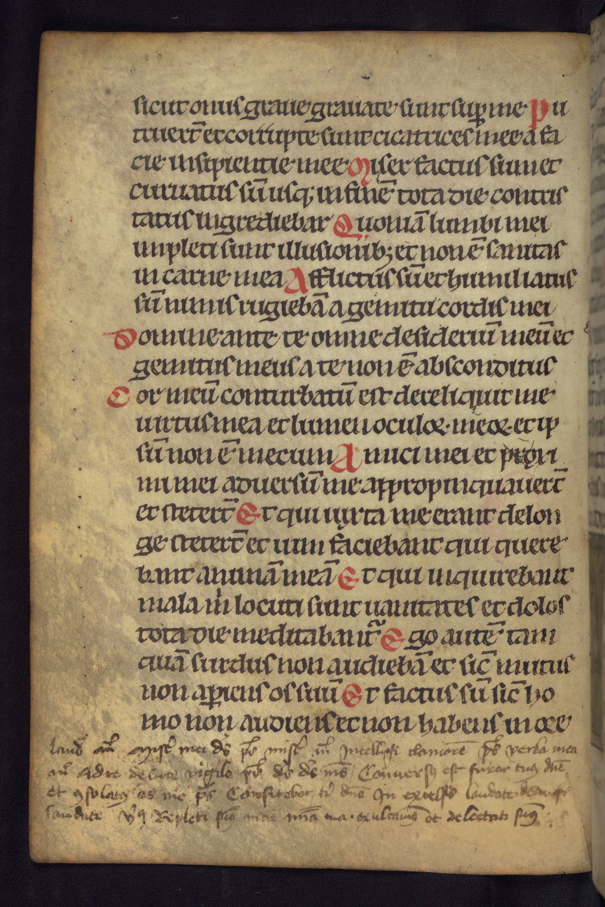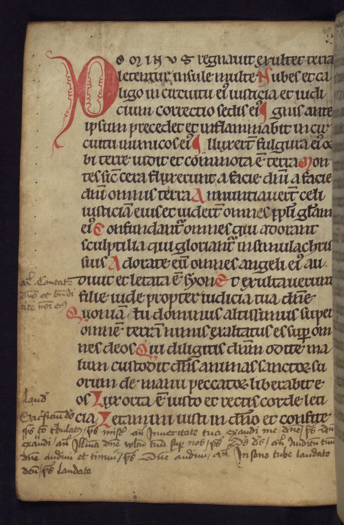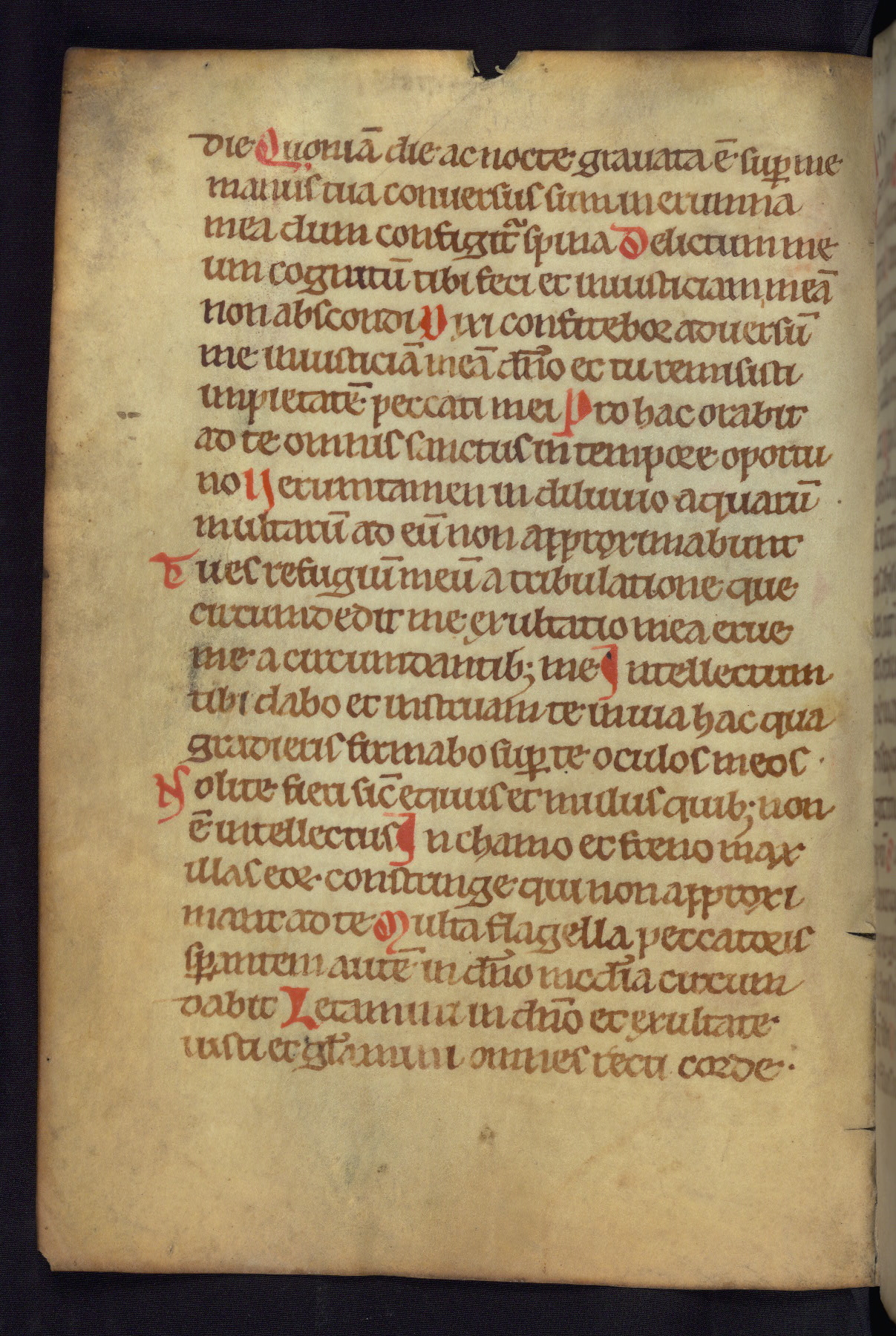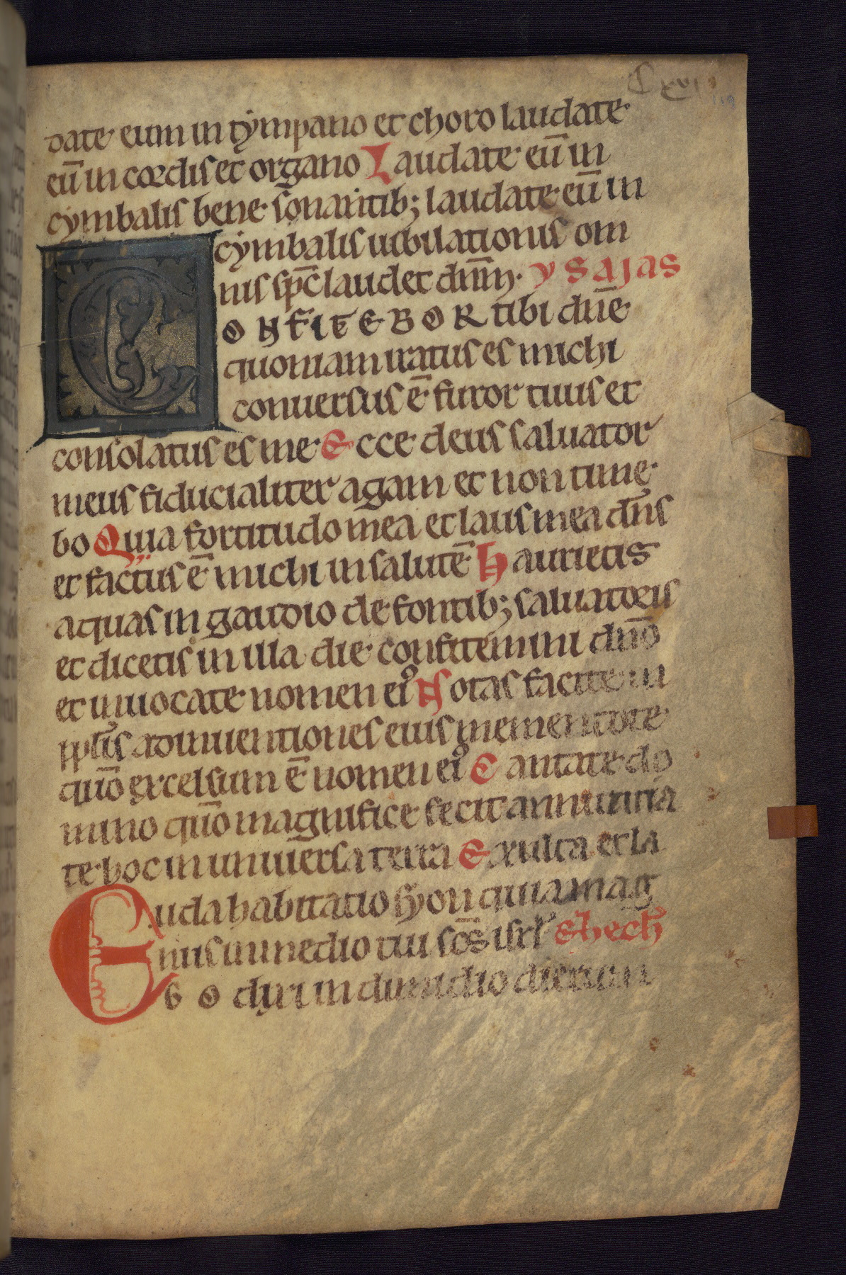 This Latin psalter was made in the second half of the thirteenth century for use in the Diocese of Constance, Germany. By the fourteenth century, it was owned by the Church of St. Mary of Strasbourg, from which it gets its name. The long life and enthusiastic use of the manuscript is attested by a multitude of added inscriptions, prayers, and antiphons with neumes, most dating to the fifteenth or sixteenth century. An early system of bookmarking is also evident; strips of parchment have been cut in some of the margins and folded through a slit in the leaf, creating tabs that would have helped the reader navigate through the text. Illumination also served this function, for while a short cycle of images from the life of Christ introduces the manuscript, the rest of the illuminations--large decorated initials as well as smaller ones in silver and gold--mark the important psalms for the reader. The style of illumination found here is closely related to two other psalters from Constance: Sigmaringen, Royal State Archives Ms. 11 and Hessische Landesbibliothek Fulda Ms. Aa 82.