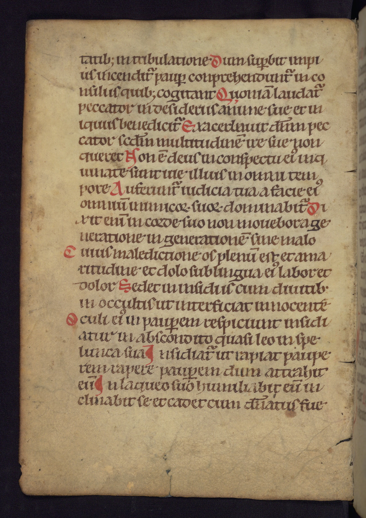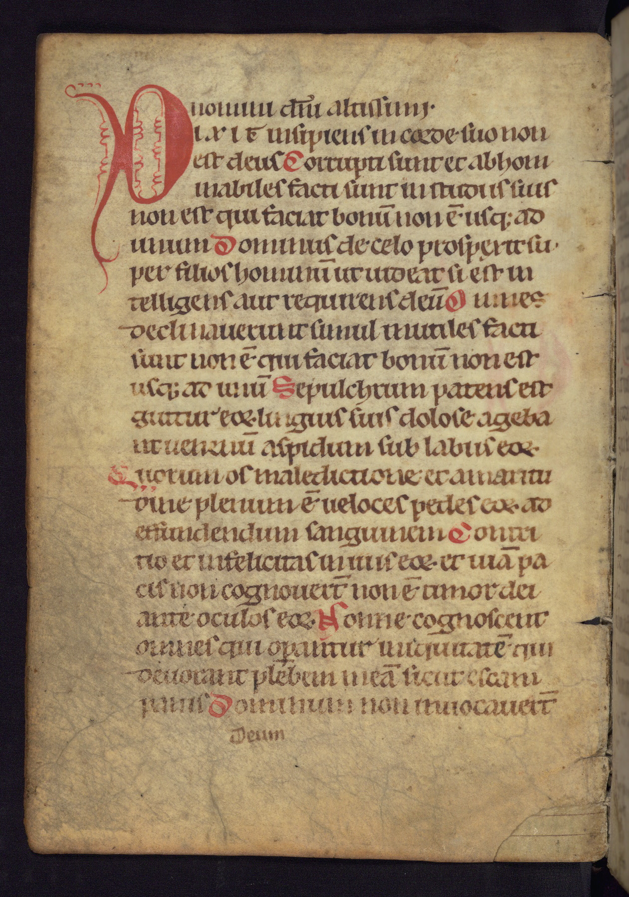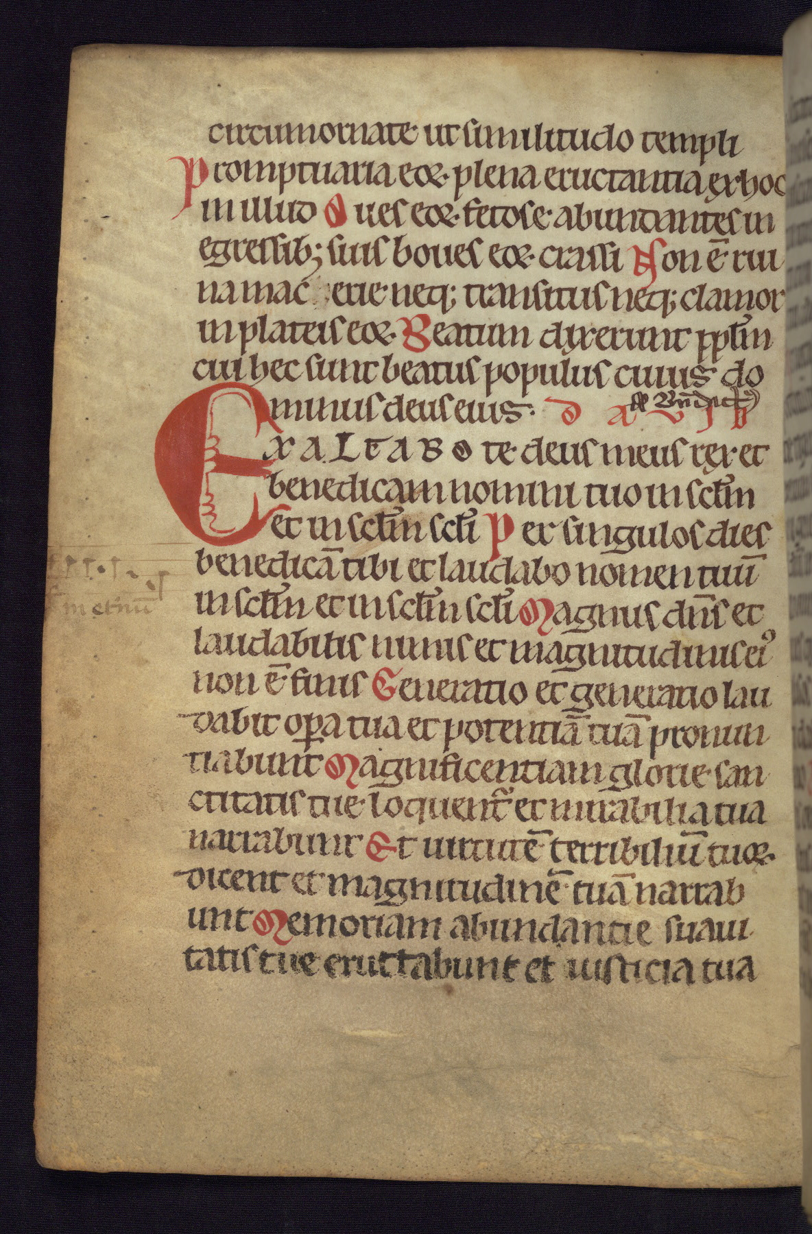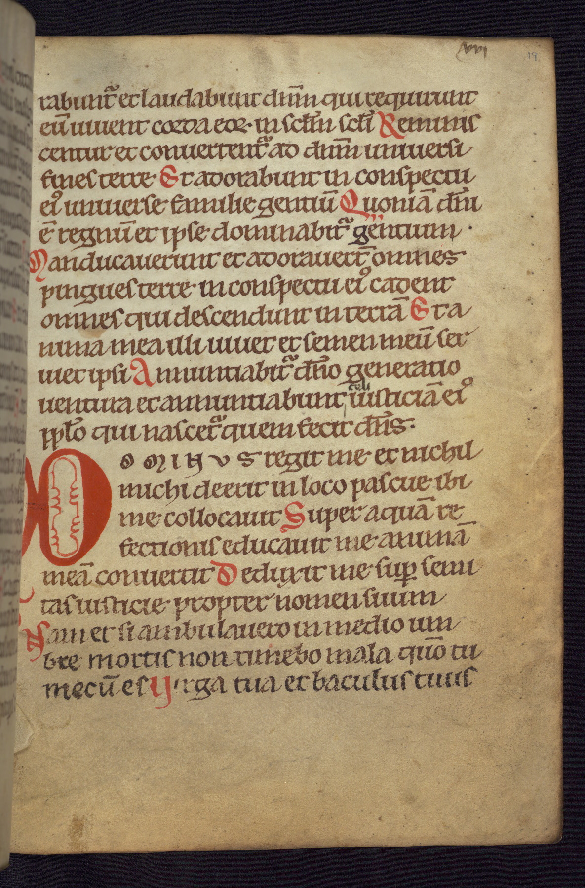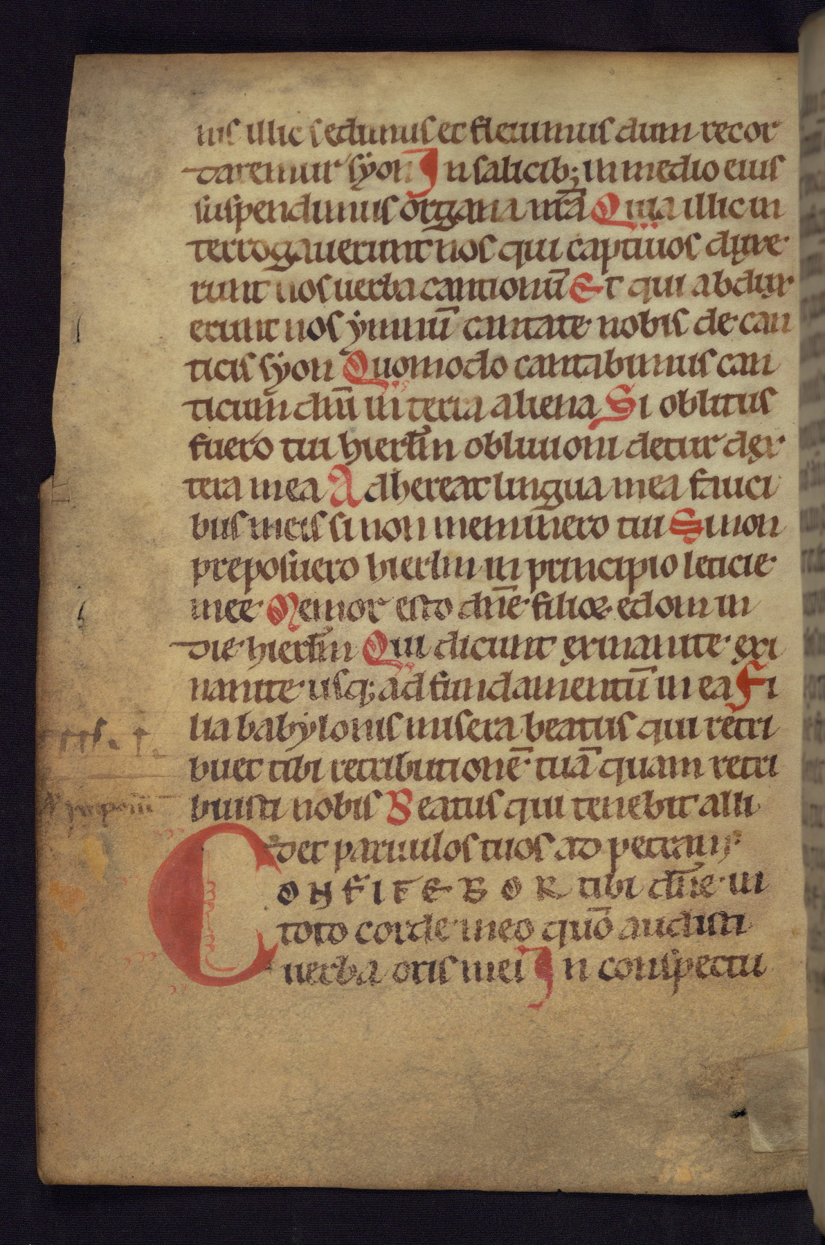 This Latin psalter was made in the second half of the thirteenth century for use in the Diocese of Constance, Germany. By the fourteenth century, it was owned by the Church of St. Mary of Strasbourg, from which it gets its name. The long life and enthusiastic use of the manuscript is attested by a multitude of added inscriptions, prayers, and antiphons with neumes, most dating to the fifteenth or sixteenth century. An early system of bookmarking is also evident; strips of parchment have been cut in some of the margins and folded through a slit in the leaf, creating tabs that would have helped the reader navigate through the text. Illumination also served this function, for while a short cycle of images from the life of Christ introduces the manuscript, the rest of the illuminations--large decorated initials as well as smaller ones in silver and gold--mark the important psalms for the reader. The style of illumination found here is closely related to two other psalters from Constance: Sigmaringen, Royal State Archives Ms. 11 and Hessische Landesbibliothek Fulda Ms. Aa 82.