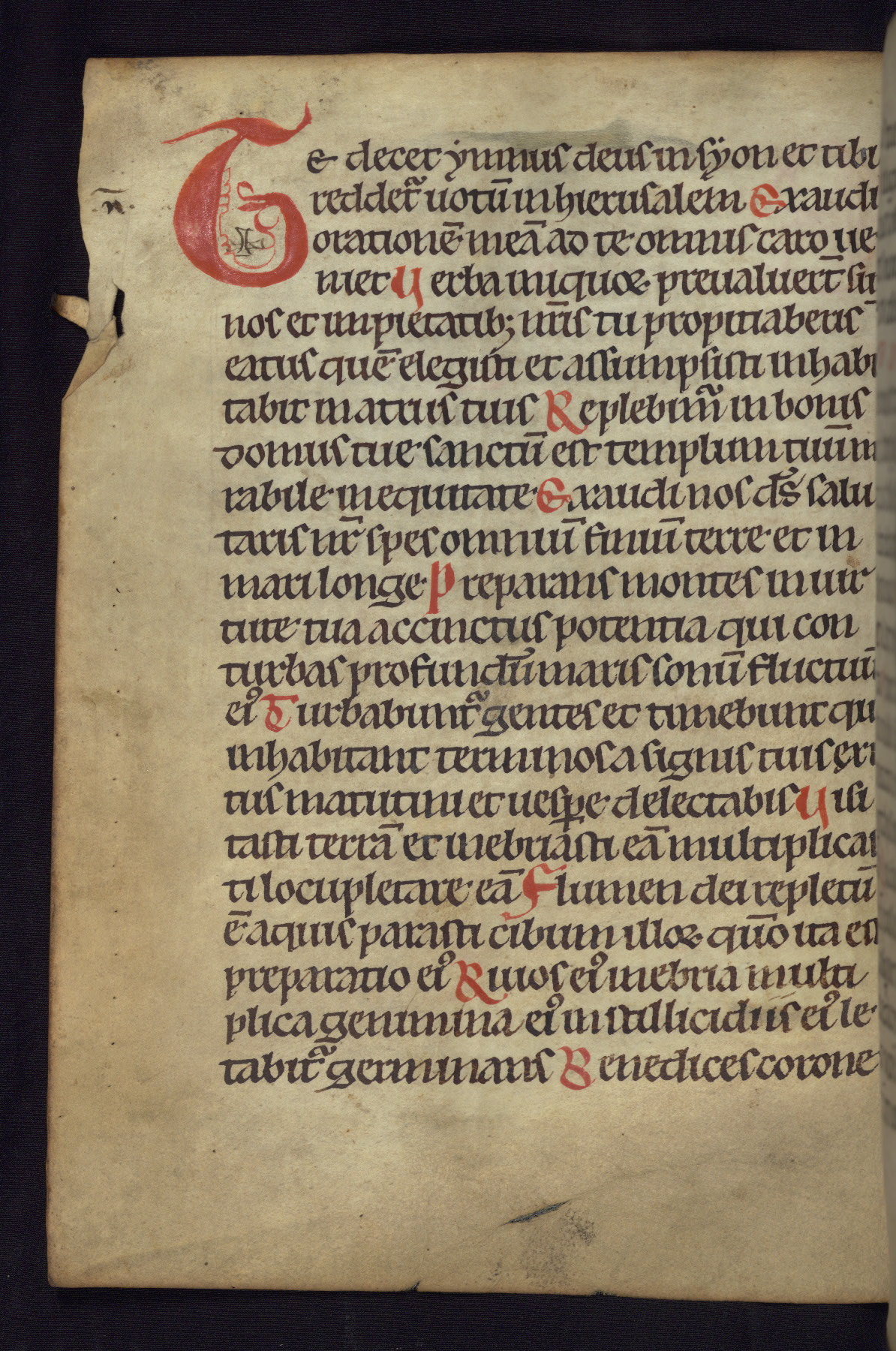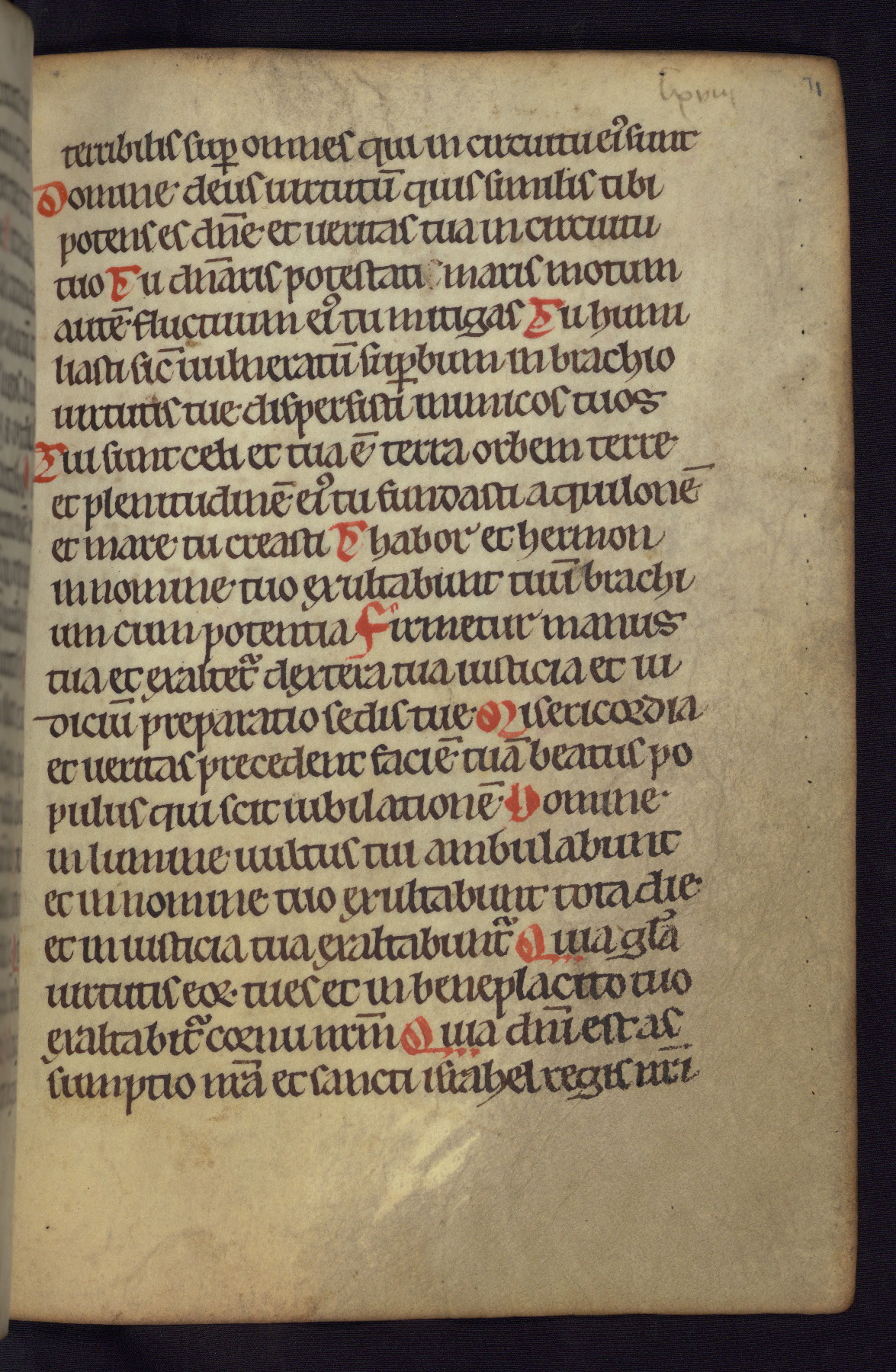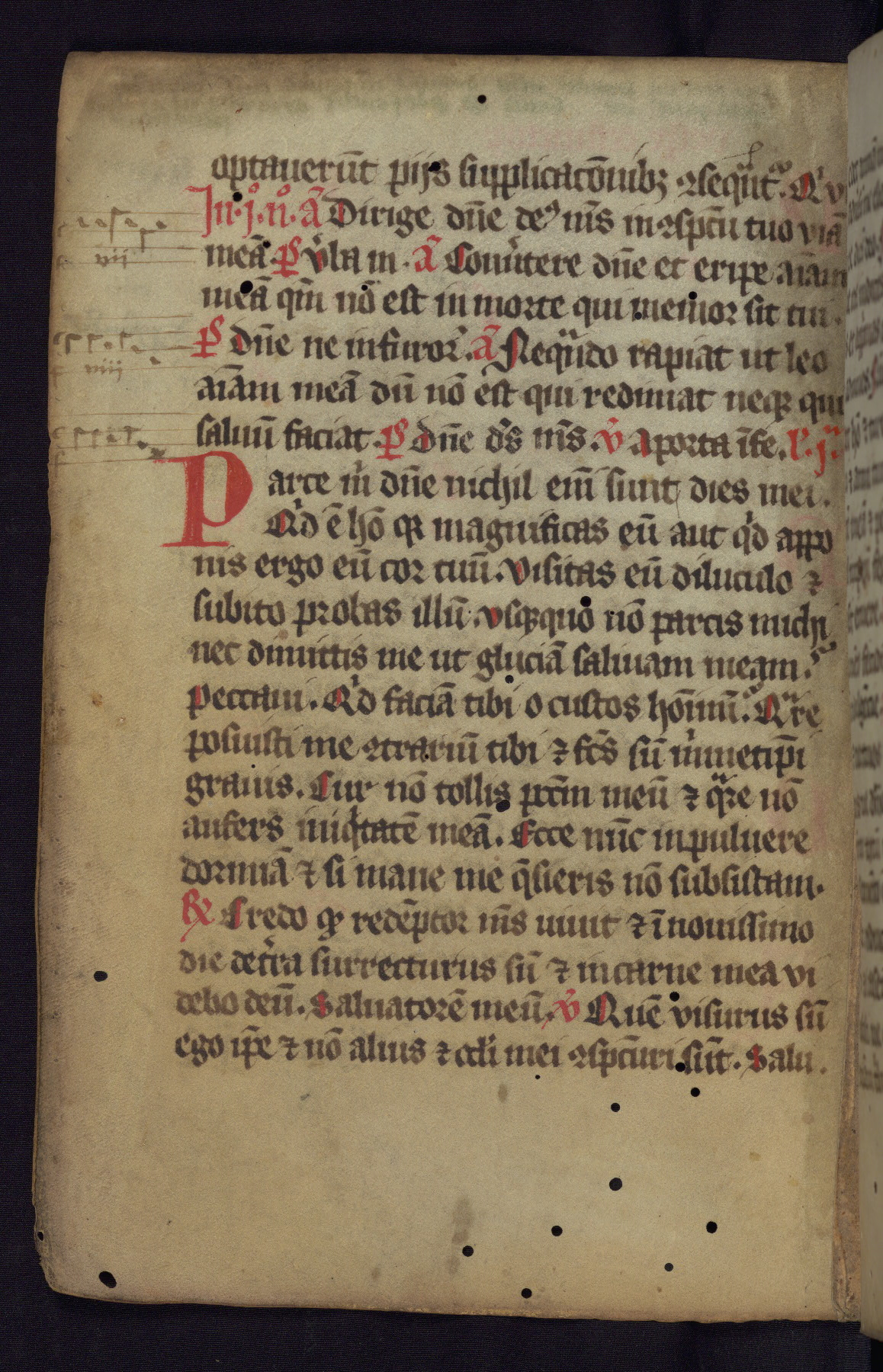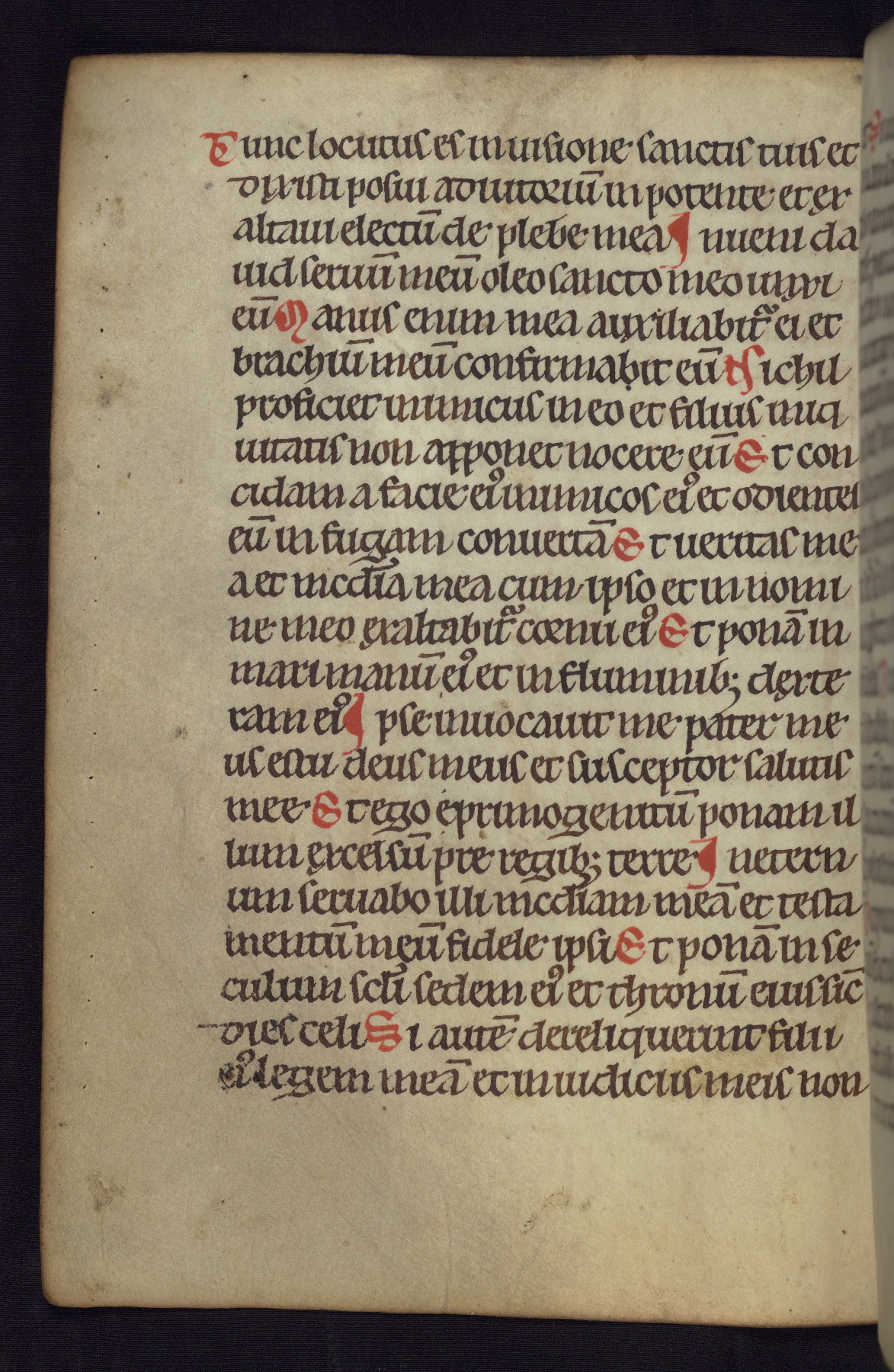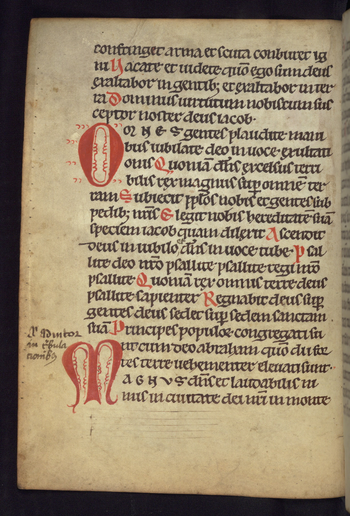 This Latin psalter was made in the second half of the thirteenth century for use in the Diocese of Constance, Germany. By the fourteenth century, it was owned by the Church of St. Mary of Strasbourg, from which it gets its name. The long life and enthusiastic use of the manuscript is attested by a multitude of added inscriptions, prayers, and antiphons with neumes, most dating to the fifteenth or sixteenth century. An early system of bookmarking is also evident; strips of parchment have been cut in some of the margins and folded through a slit in the leaf, creating tabs that would have helped the reader navigate through the text. Illumination also served this function, for while a short cycle of images from the life of Christ introduces the manuscript, the rest of the illuminations--large decorated initials as well as smaller ones in silver and gold--mark the important psalms for the reader. The style of illumination found here is closely related to two other psalters from Constance: Sigmaringen, Royal State Archives Ms. 11 and Hessische Landesbibliothek Fulda Ms. Aa 82.