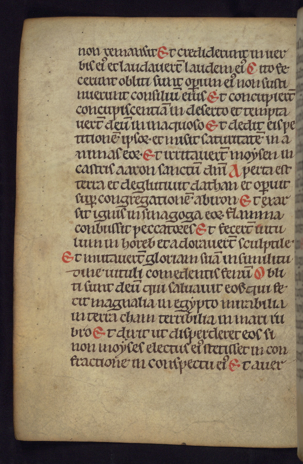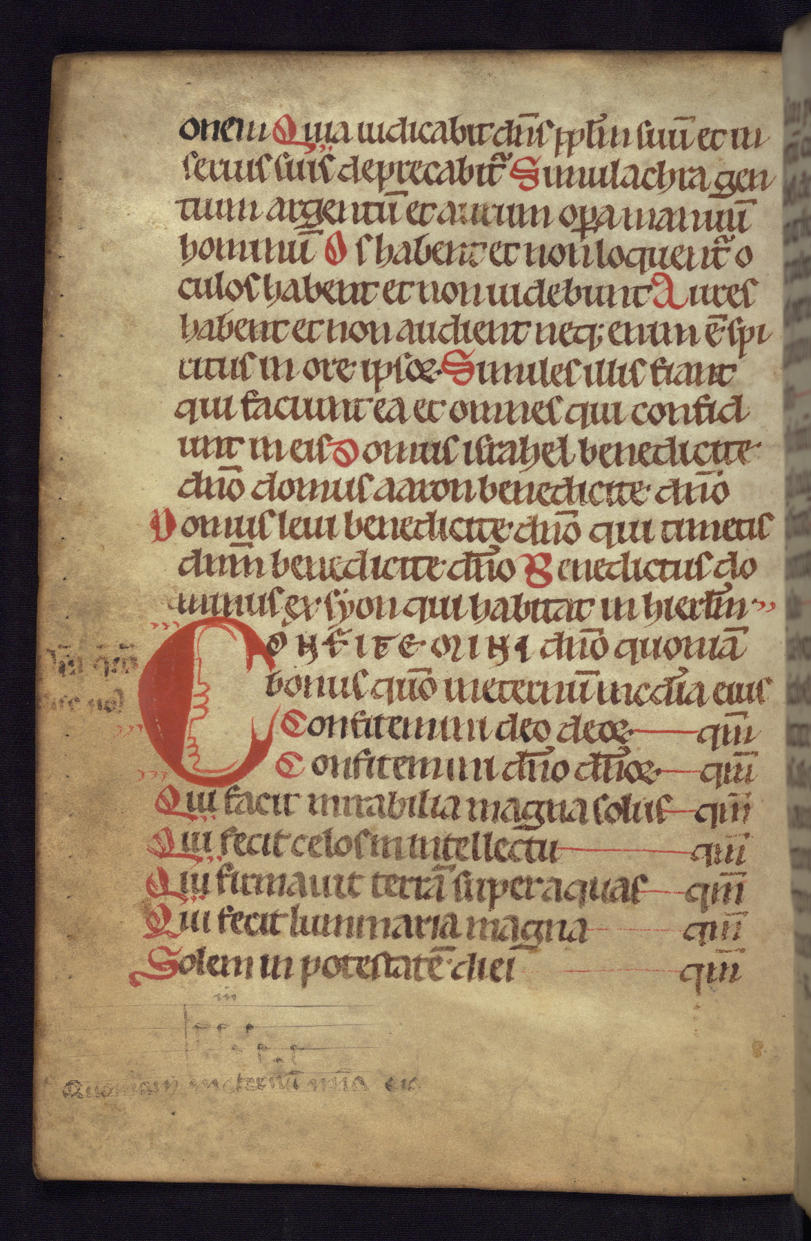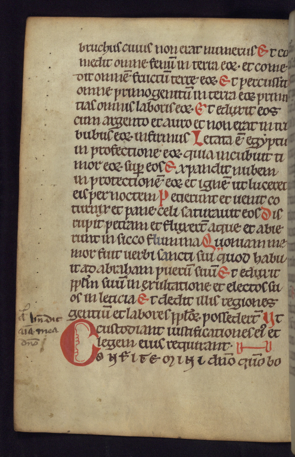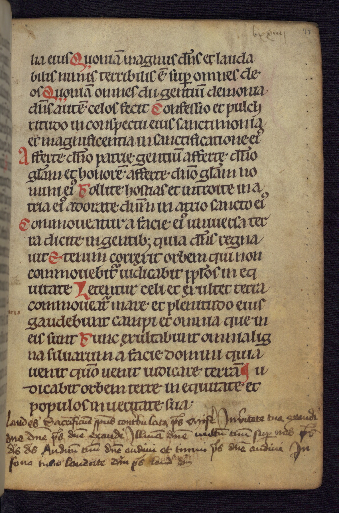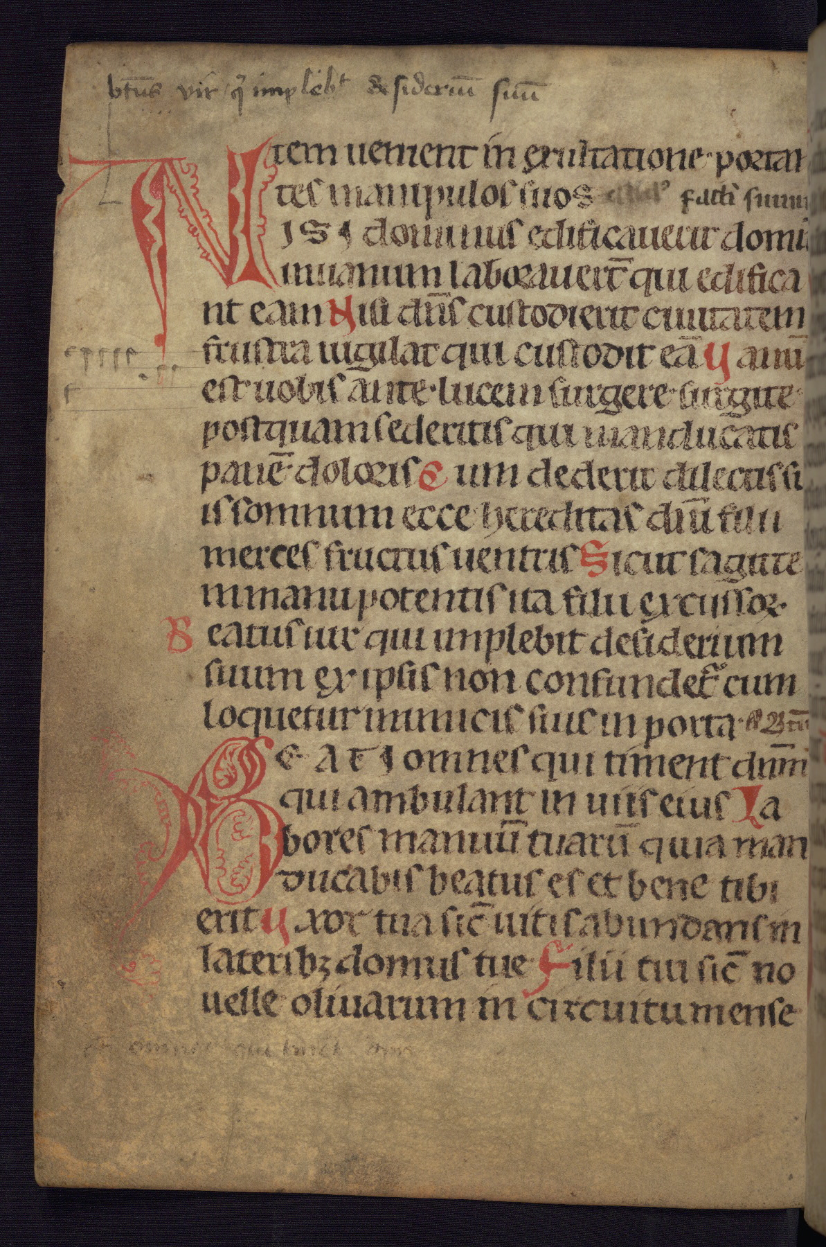 This Latin psalter was made in the second half of the thirteenth century for use in the Diocese of Constance, Germany. By the fourteenth century, it was owned by the Church of St. Mary of Strasbourg, from which it gets its name. The long life and enthusiastic use of the manuscript is attested by a multitude of added inscriptions, prayers, and antiphons with neumes, most dating to the fifteenth or sixteenth century. An early system of bookmarking is also evident; strips of parchment have been cut in some of the margins and folded through a slit in the leaf, creating tabs that would have helped the reader navigate through the text. Illumination also served this function, for while a short cycle of images from the life of Christ introduces the manuscript, the rest of the illuminations--large decorated initials as well as smaller ones in silver and gold--mark the important psalms for the reader. The style of illumination found here is closely related to two other psalters from Constance: Sigmaringen, Royal State Archives Ms. 11 and Hessische Landesbibliothek Fulda Ms. Aa 82.