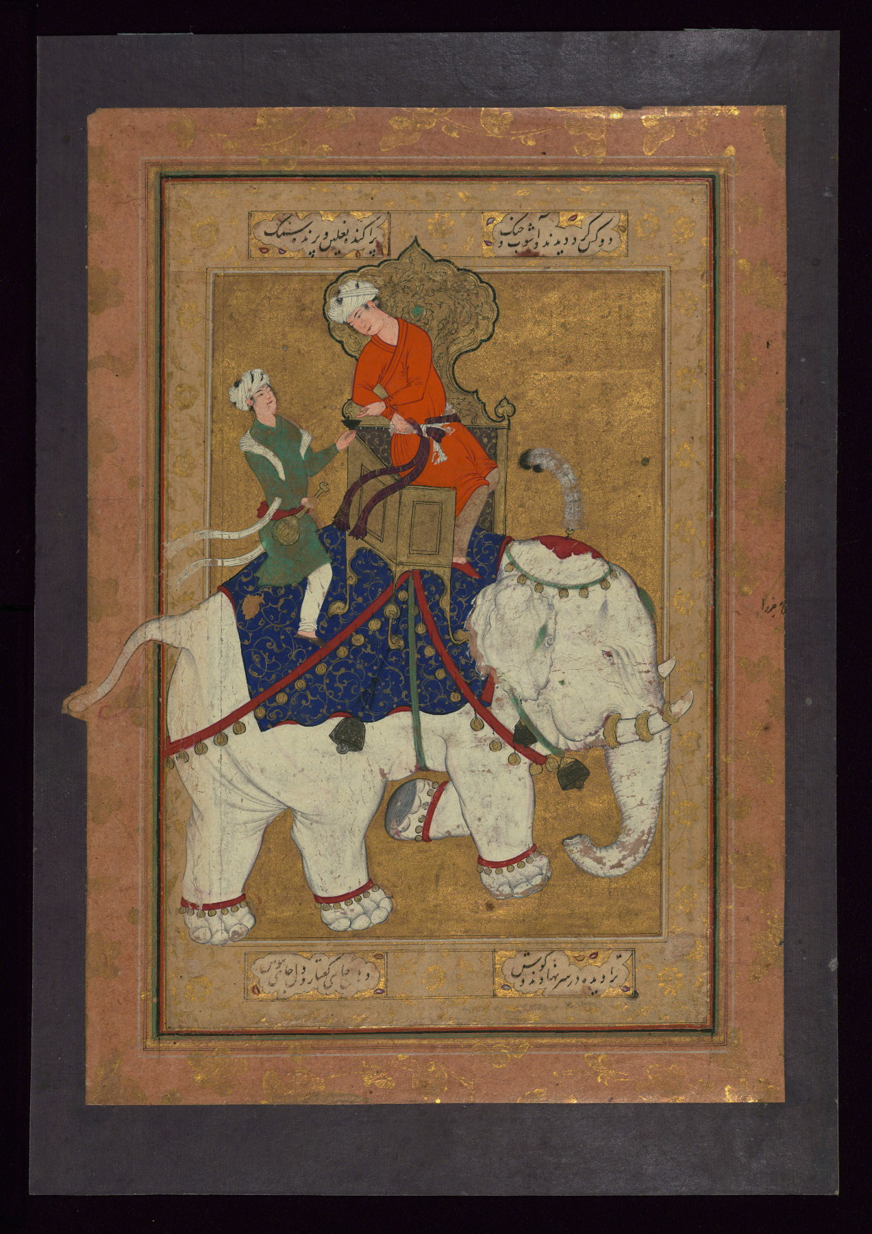 - Label: This Mughal painting of the early eleventh century AH / seventeenth CE depicts two young men on a white elephant. The seated man is being served wine. The painting is surrounded by a frame of illuminated buff-colored paper with four panels inscribed with Persian verses written in black nastaʿlīq script. The border is of salmon-colored paper with illuminated floral motifs.
