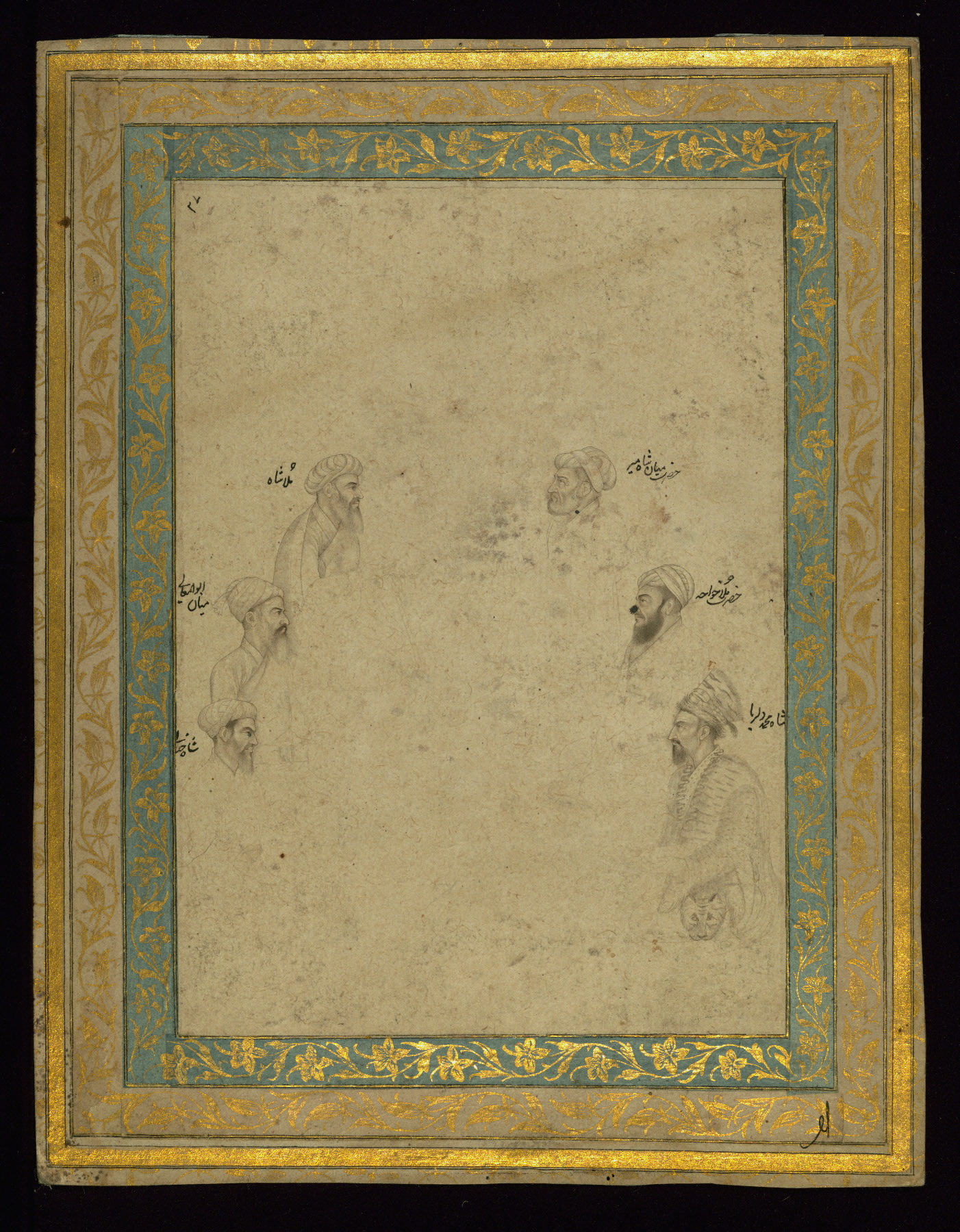 This Mughal drawing, dating to the eleventh century AH / seventeenth CE, depicts six spiritual teachers arranged in a semi-circle. Two of these figures are Ḥazrat Miyān Shāh Mīr (d. 1045 AH / 1635 CE) and his disciple Mullā Shāh [Badakhshī] (d. 1072 AH / 1661 CE) (facing each other). Miyān Mīr was a spiritual instructor of Dārā Shikūh (d. 1069 AH / 1659 CE), the oldest son of the Mughal Emperor Shāh Jahān. The other figures are: Ḥazrat Mullā Khvājah, Miyān Abū al-Maʿālī, Shāh Muḥammad Dilrubā, and Shāh Khayālī.