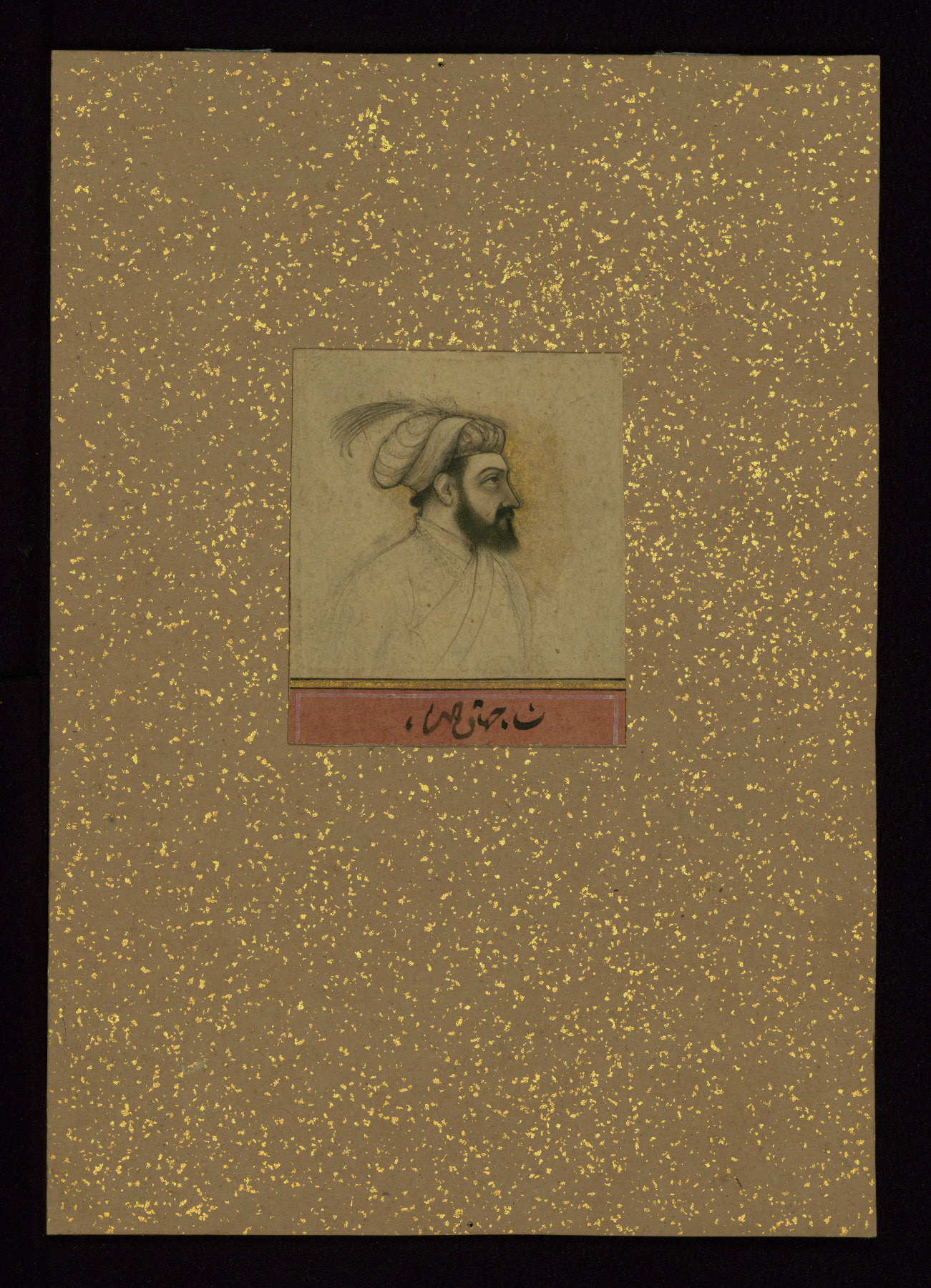 This small Mughal drawing is a portrait of the fifth Mughal emperor, Shāh Jahān (d. 1076 AH / 1666 CE). It dates to the mid 11th century AH / 17th CE. The image is surrounded by a border of buff-tinted, gold-sprinkled paper.