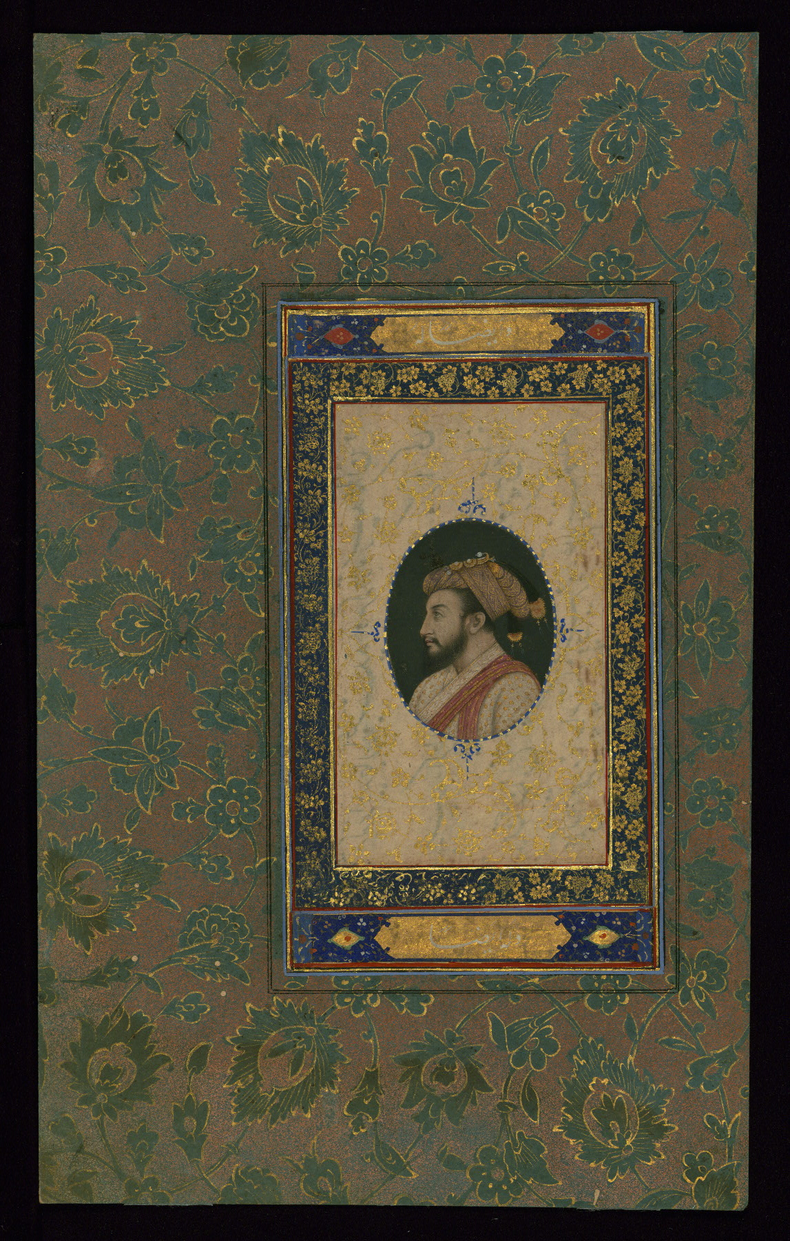 This Mughal portrait set in an oval medallion dates to the late eleventh century AH / seventeenth CE and represents the Mughal Emperor Shāh Jahān (d. 1076 AH / 1666 CE). The portrait is comparable to other depictions of the ruler, including W.700, which is inscribed with Shāh Jahān's name, Shah Jahan Holding a Turban Ornament in the Los Angeles County Museum of Art (M.78.6.15), and the relief portrait bust of Shah Jahan in alabaster housed in the Riksmuseum, Amsterdam (12249). The portrait is flanked by two inscribed cartouches with a blue and pink stenciled floral border.