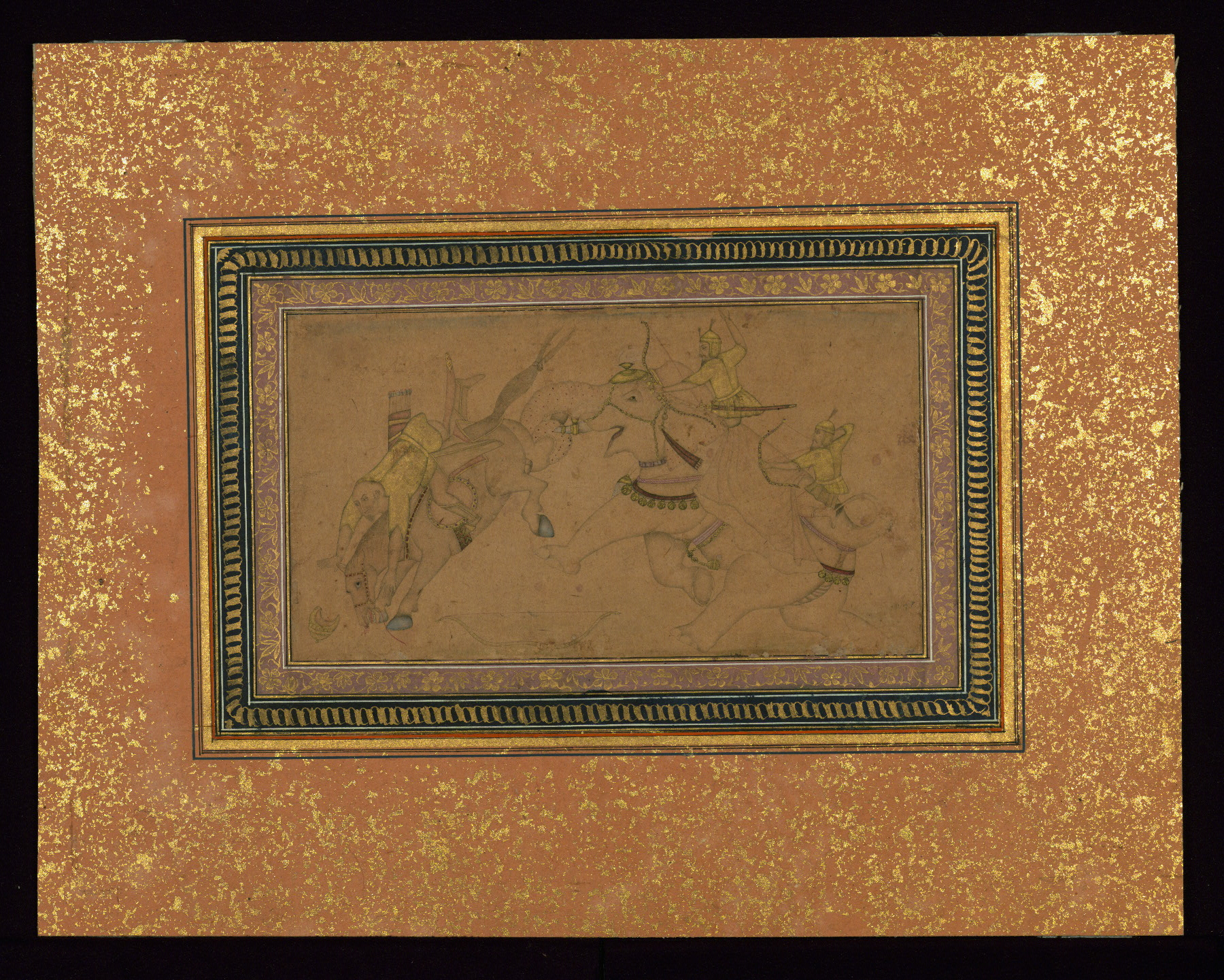 This color wash and illuminated drawing depicts an elephant with two archers attacking a rider on horseback. The attribution in the lower right corner reads "the work of Thākur Dās." The image is surrounded by illuminated frames and a border of pink-tinted, gold-sprinkled paper. On the back is an unsigned sample of calligraphy in nastaʿlīq script in both Arabic and Persian.