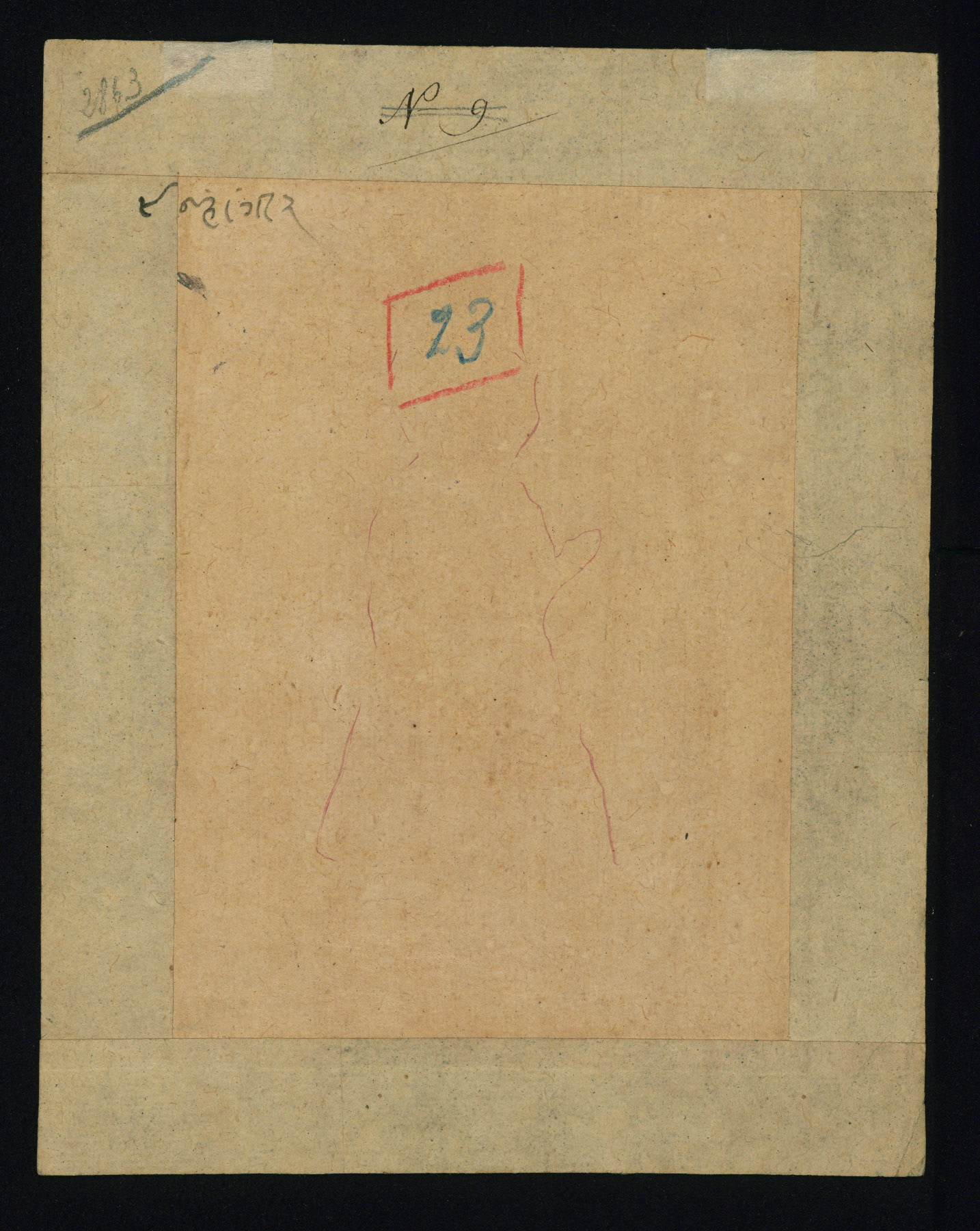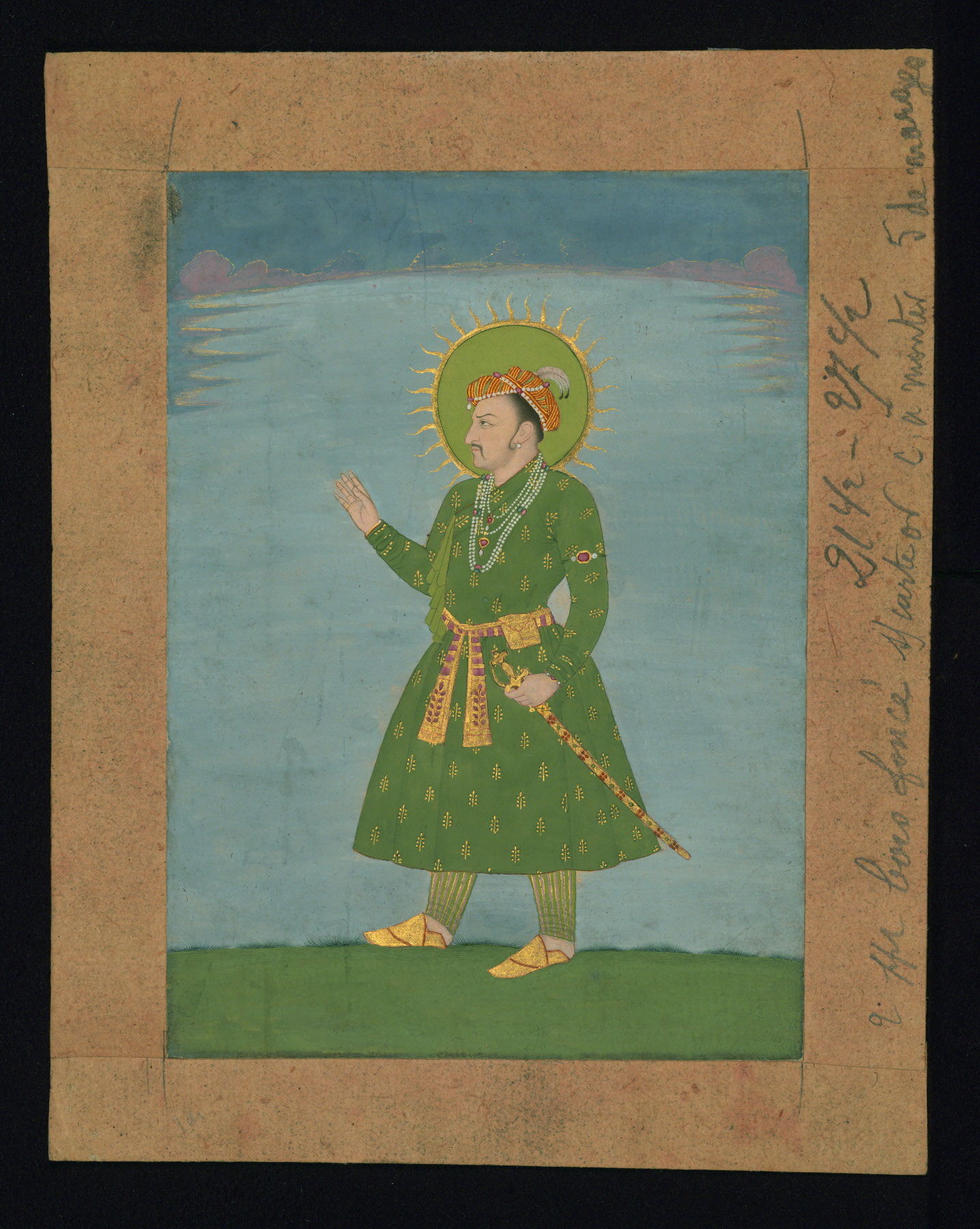 - Label: This painting depicts the Mughal ruler Jahangir (r. 1014-1037 AH / 1605-27 CE), standing in three-quarter profile, a pose that was common in official Mughal portraiture. It is attributable to the thirteenth century AH / nineteenth CE.