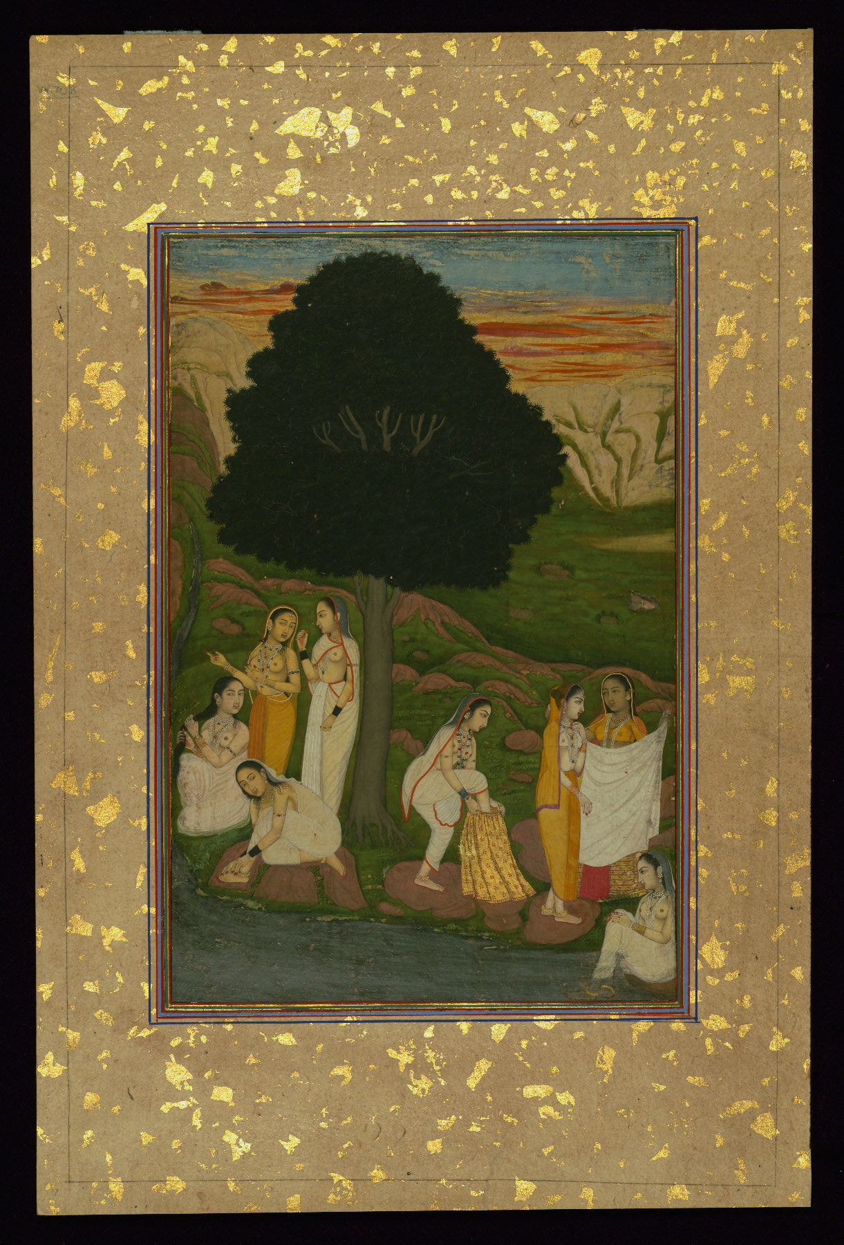 - Label: This painting depicting women in various states of undress bathing on the bank of a river is attributable to the early twelfth century AH / eighteenth CE. It was likely made in Rajasthan. The biscuit-colored border is gold-flecked.