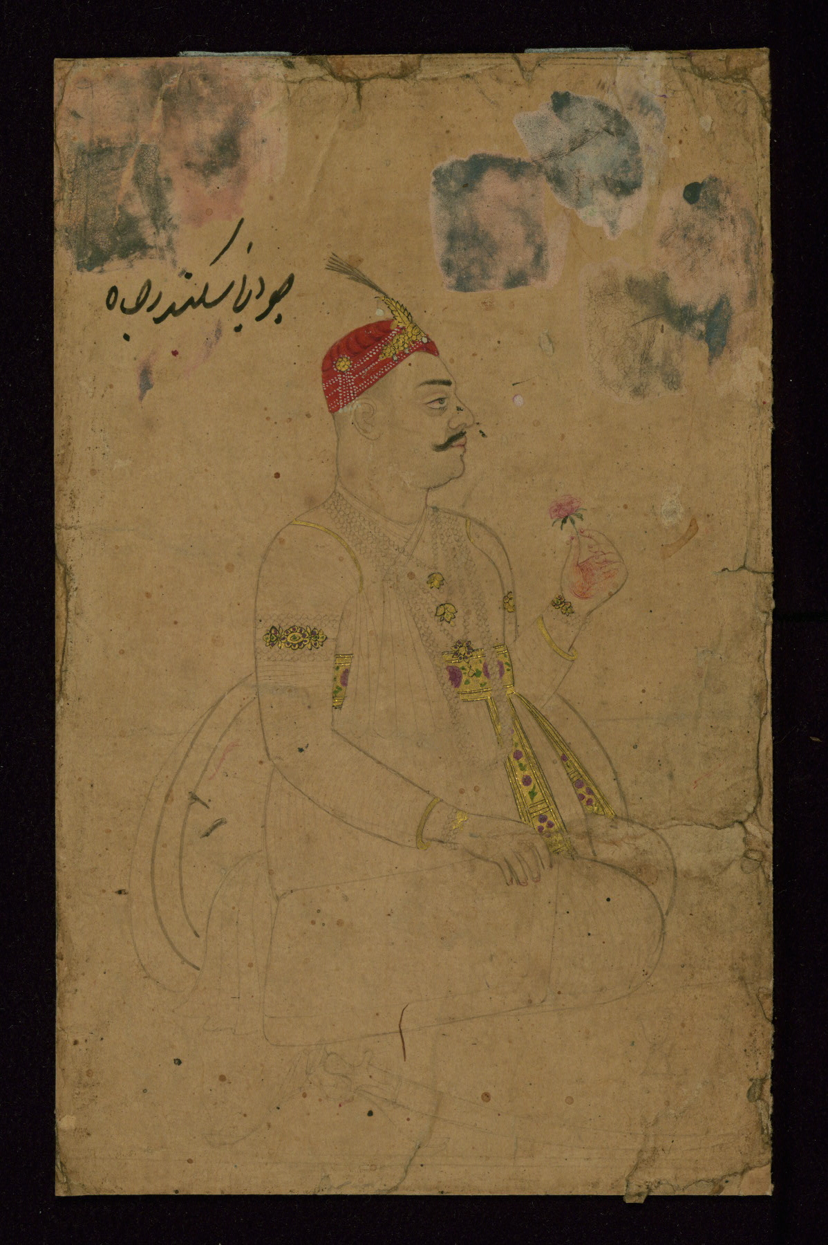 - Label: This Indian drawing with opaque watercolor and illumination depicts a man seated against a cushion holding a flower in his left hand. The work was executed in India during the twelfth century AH / eighteenth CE. There is a Persian inscription reading, "a youth as ambitious as Iskandar (Alexander the Great)."
