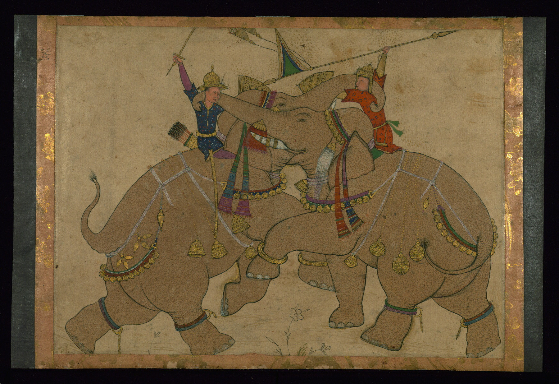 - Label: This single-leaf painting of elephants in combat was executed in India during the thirteenth century AH / nineteenth CE in an archaizing style referencing Mughal traditions of the eleventh century AH / seventeenth CE. The image of the mounted mahout, a person who drives an elephant, reproduces a popular theme in court painting in South Asia.